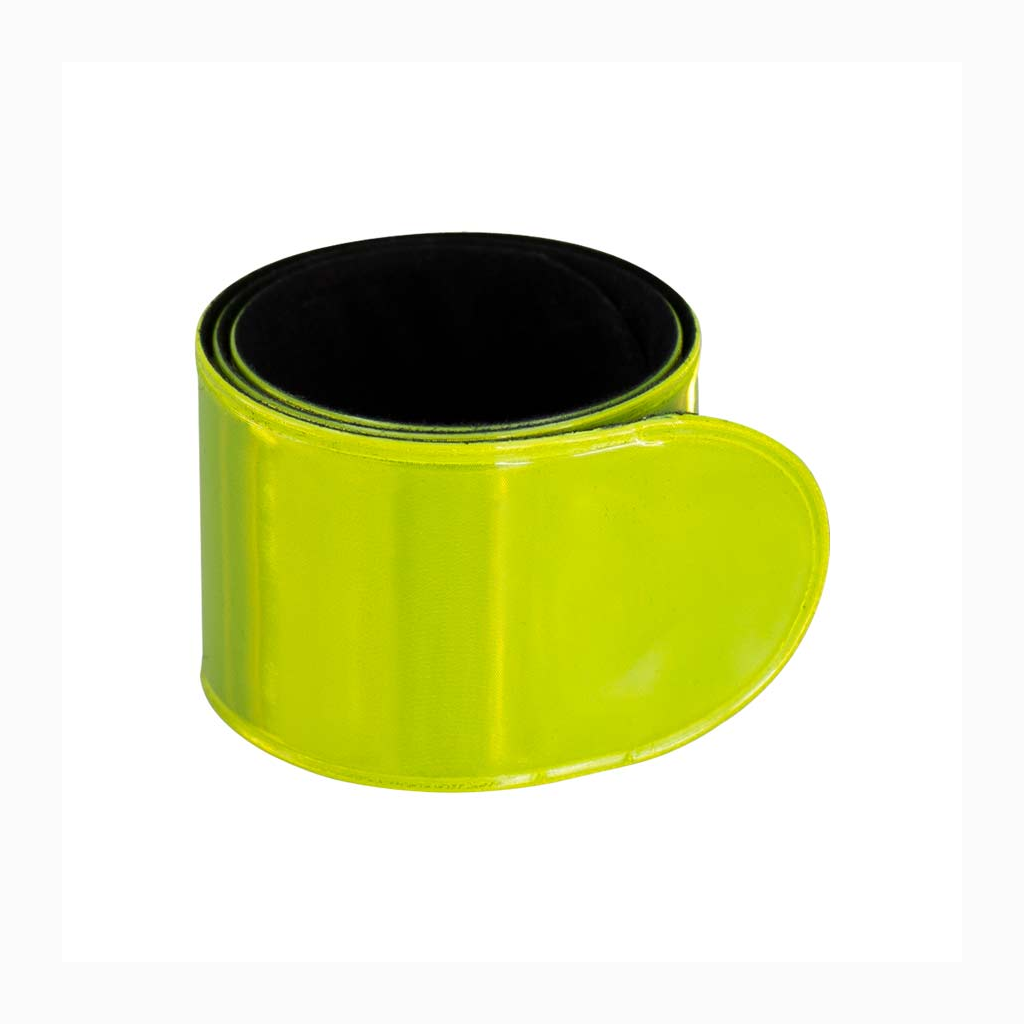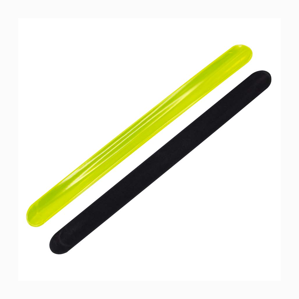 Banda Reflectante Retráctil, para uso nocturno. Reverso negro aterciopelado. Ideal para usar en muñeca, brazo y tobillo. Presentación en bolsita transparente de polipropileno con orificio para ganchera.