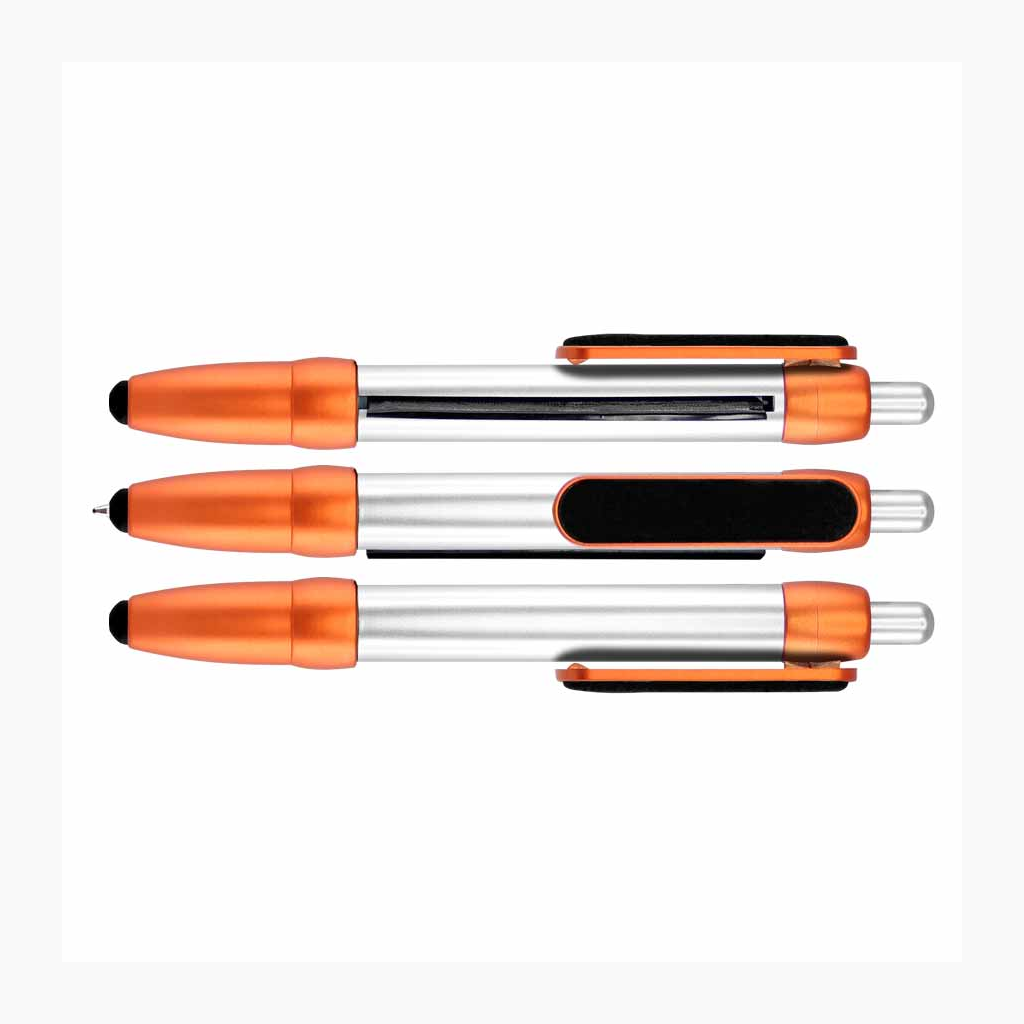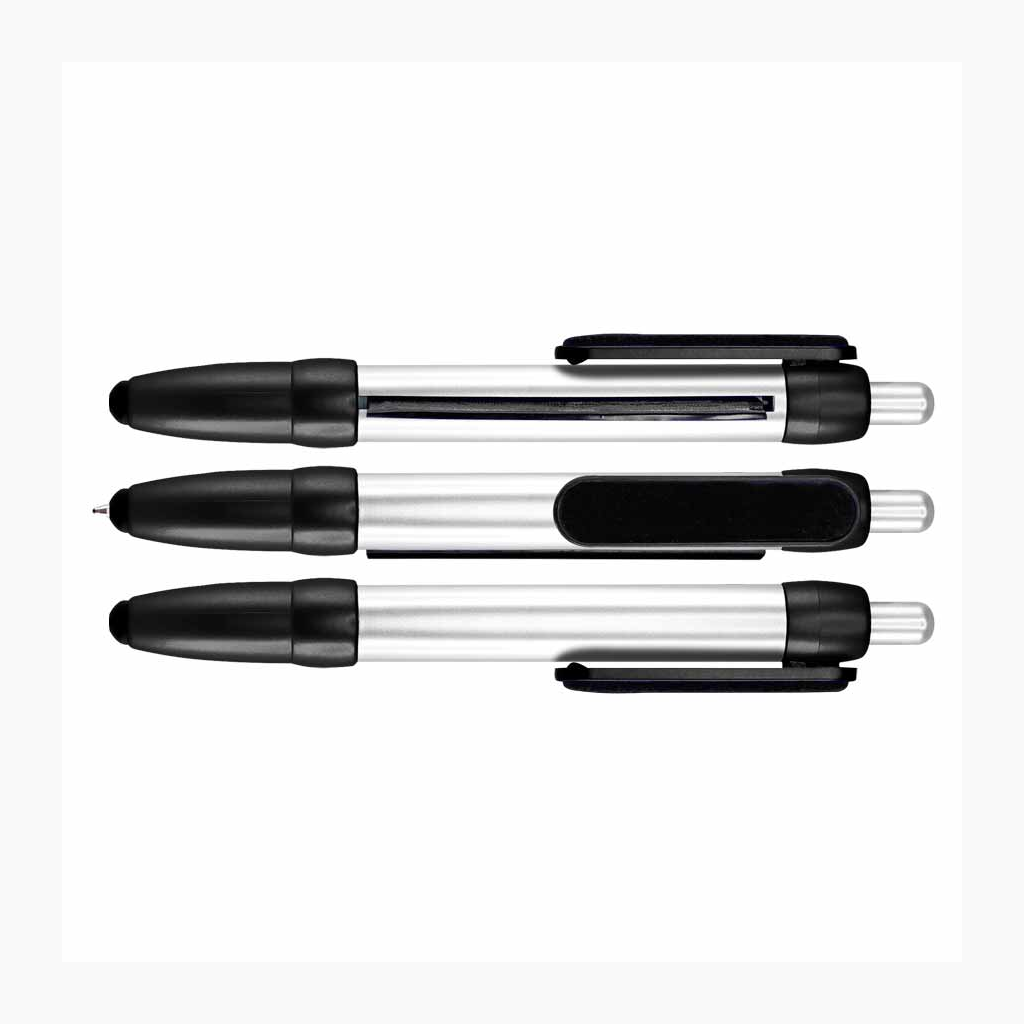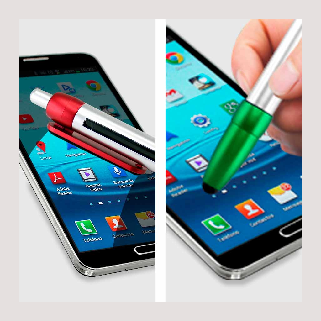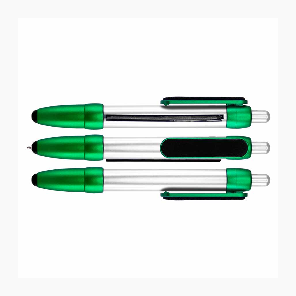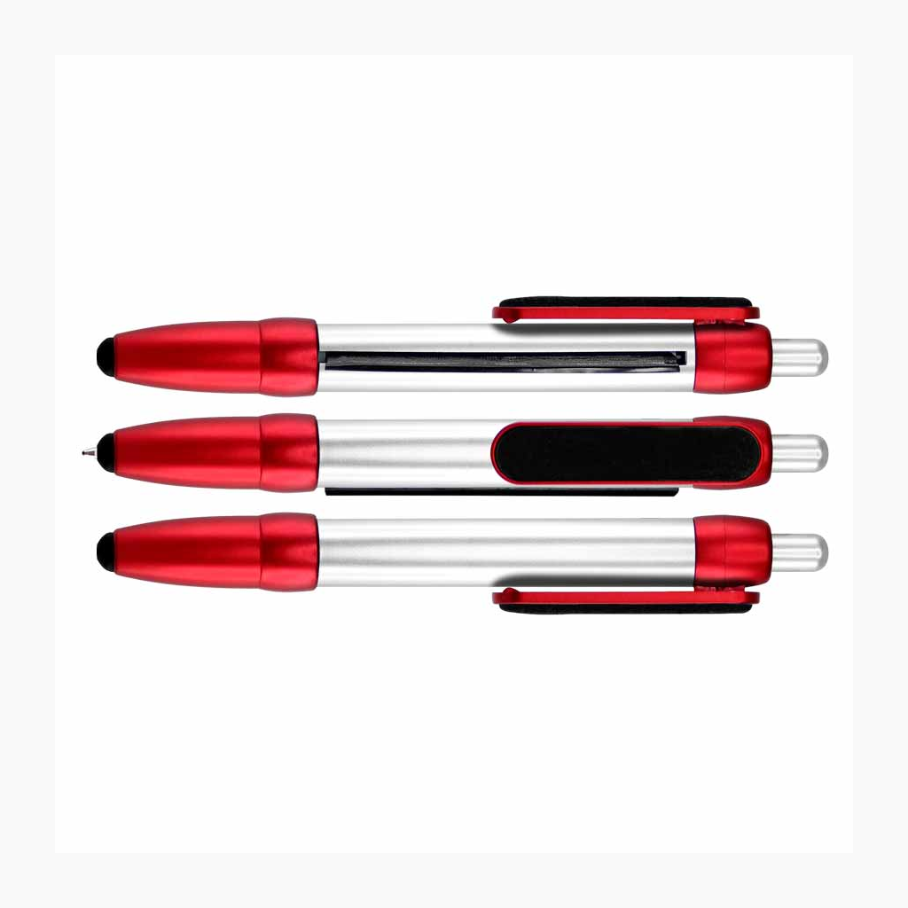 Bolígrafo plástico modelo «Flag», con cuerpo plateado y terminales de color metalizado. Incluye bandera retráctil de tela (para impresión), puntero «Touch-Screen» y clip gamuzado negro para limpiar pantalla táctil. Escritura azul.