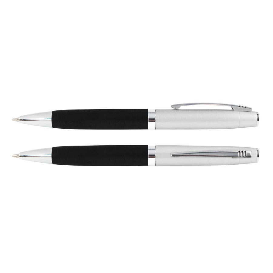 Bolígrafo Metálico bicolor modelo «Chairman». Cuerpo inferior superficie engomada negra, cuerpo superior plata satinado, terminales cromados. Escritura negra.