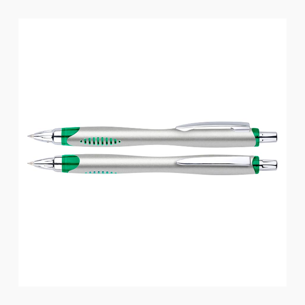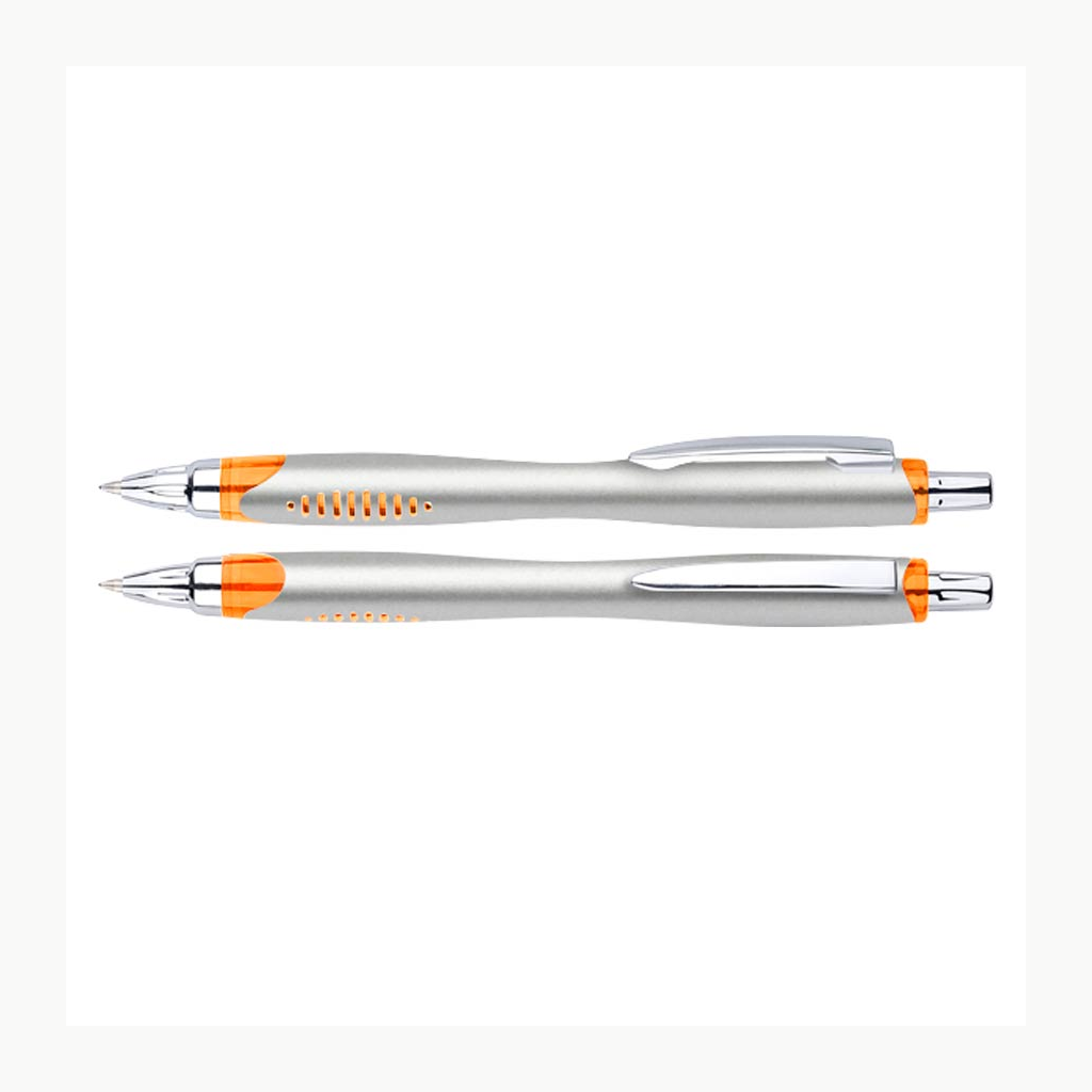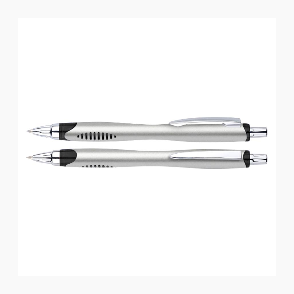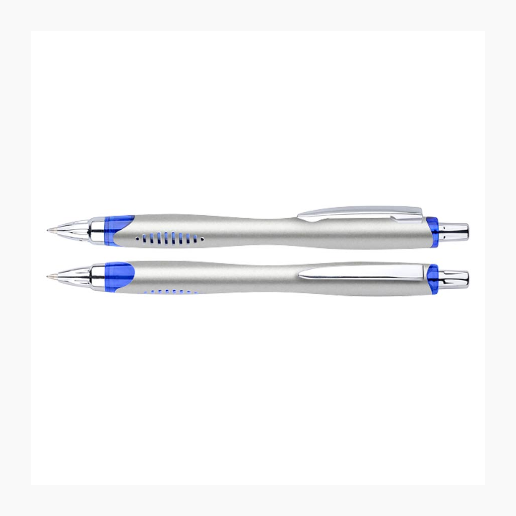 Bolígrafo plástico plateado «Motion». Escritura Azul.