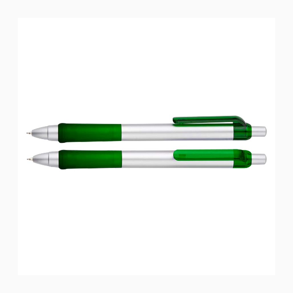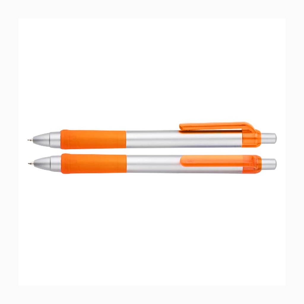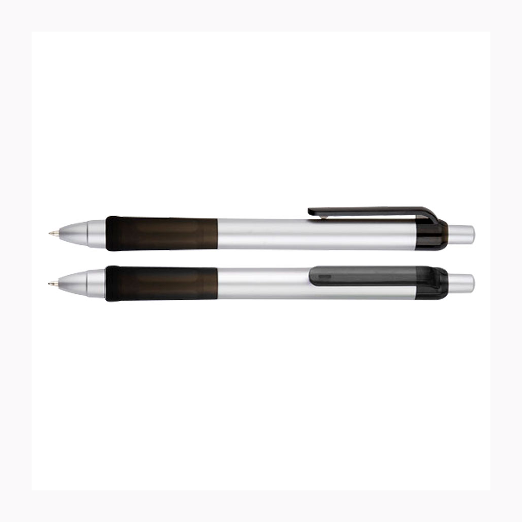 Bolígrafo plástico «Praxis» con cuerpo plateado, grip y clip de color traslúcido. Escritura azul.