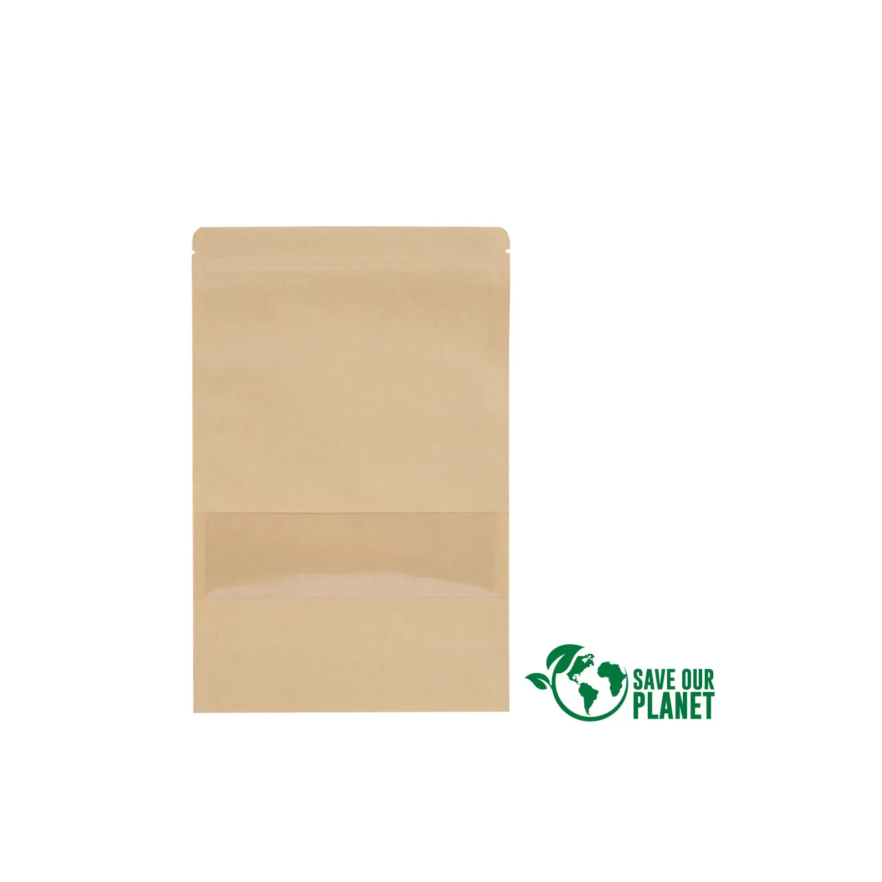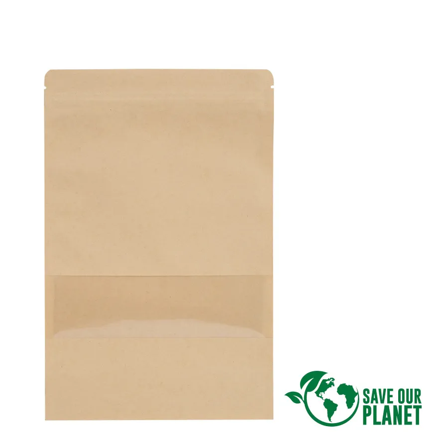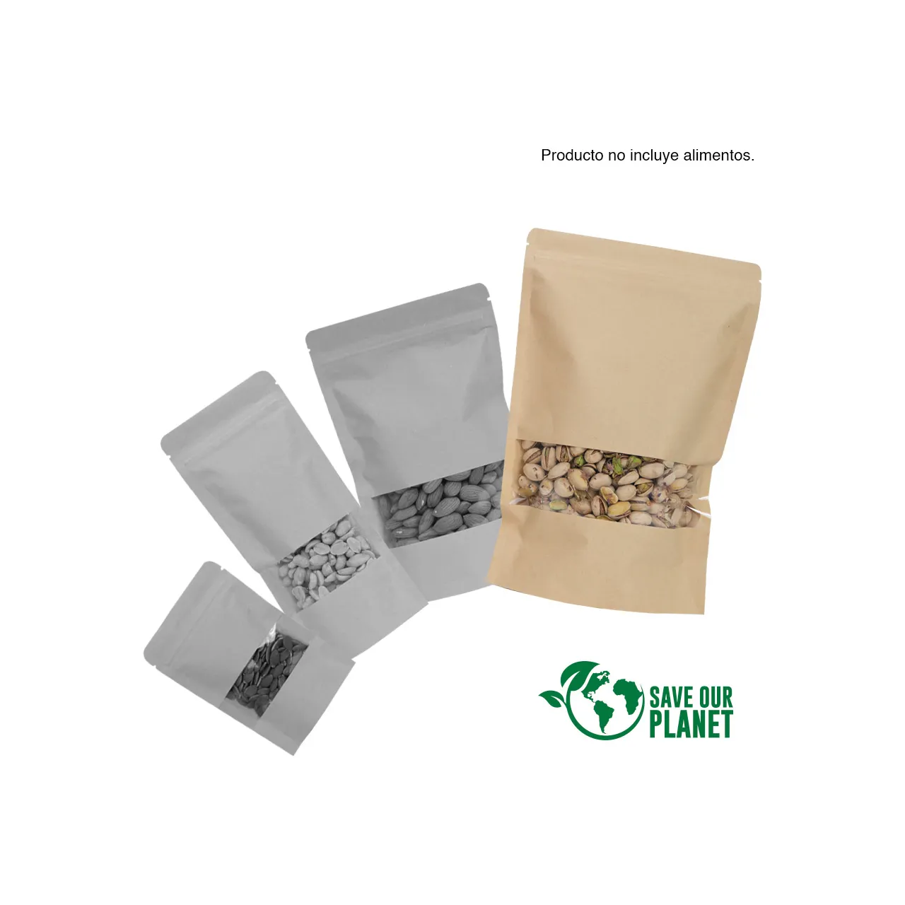 Bolsa hermética reutilizable, para guardar alimentos, fabricada en papel Kraft color natural, con protección interior PET + CPP (Cera Polipropileno), lo que permite guardar y conservar alimentos por más tiempo, y sin riesgo que la humedad o el polvo dañen los alimentos. Este producto es biodegradable, inofensivo para el medio ambiente y no tóxico para la salud humana. Contiene ventana plástica transparente para visualización interior. Sistema de cierre hermético reutilizable «Smart Zipper». Cuenta con fuelle inferior, lo que permite poner la bolsa de pie.