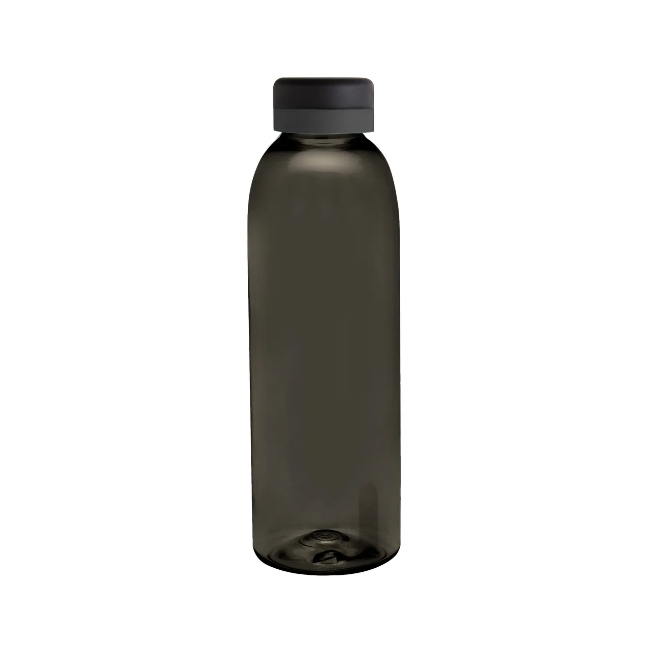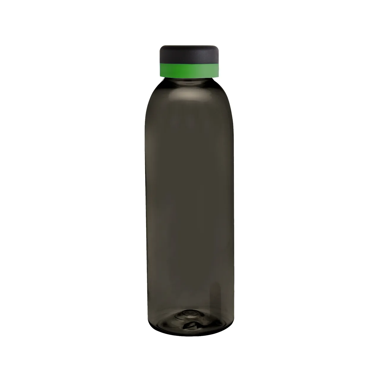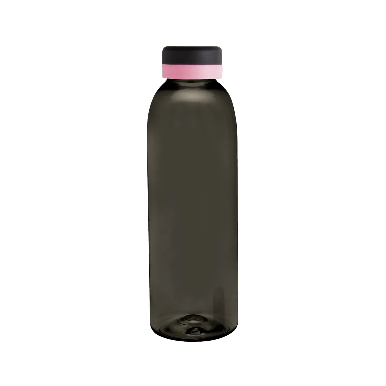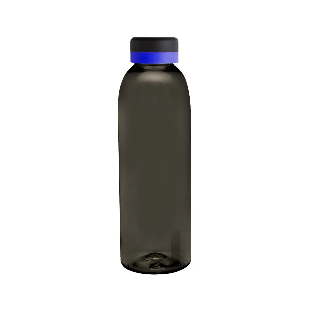 Diferencia tu estilo en un diseño con personalidad.Botella de plástico de color negro translúcido con tapa a rosca color negro mate con anillo de silicona de diferentes colores.Medidas: Ø 7 x 23 cm.