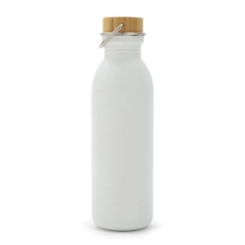 Botella de metal con tapa de bamboo. Cuenta con una manija de agarre sobre su tapa para fácil transporte y tiene una capacidad de 600ml. Ideal para actividades deportivas.