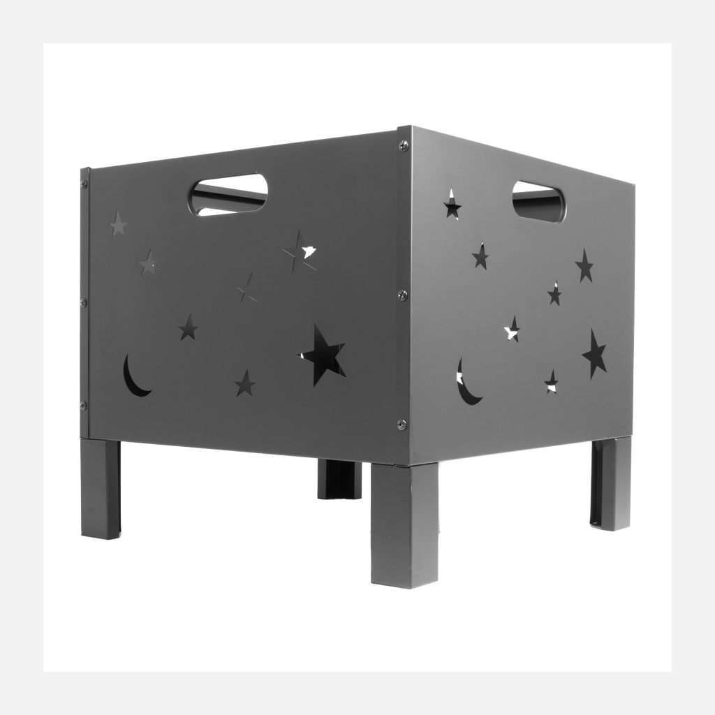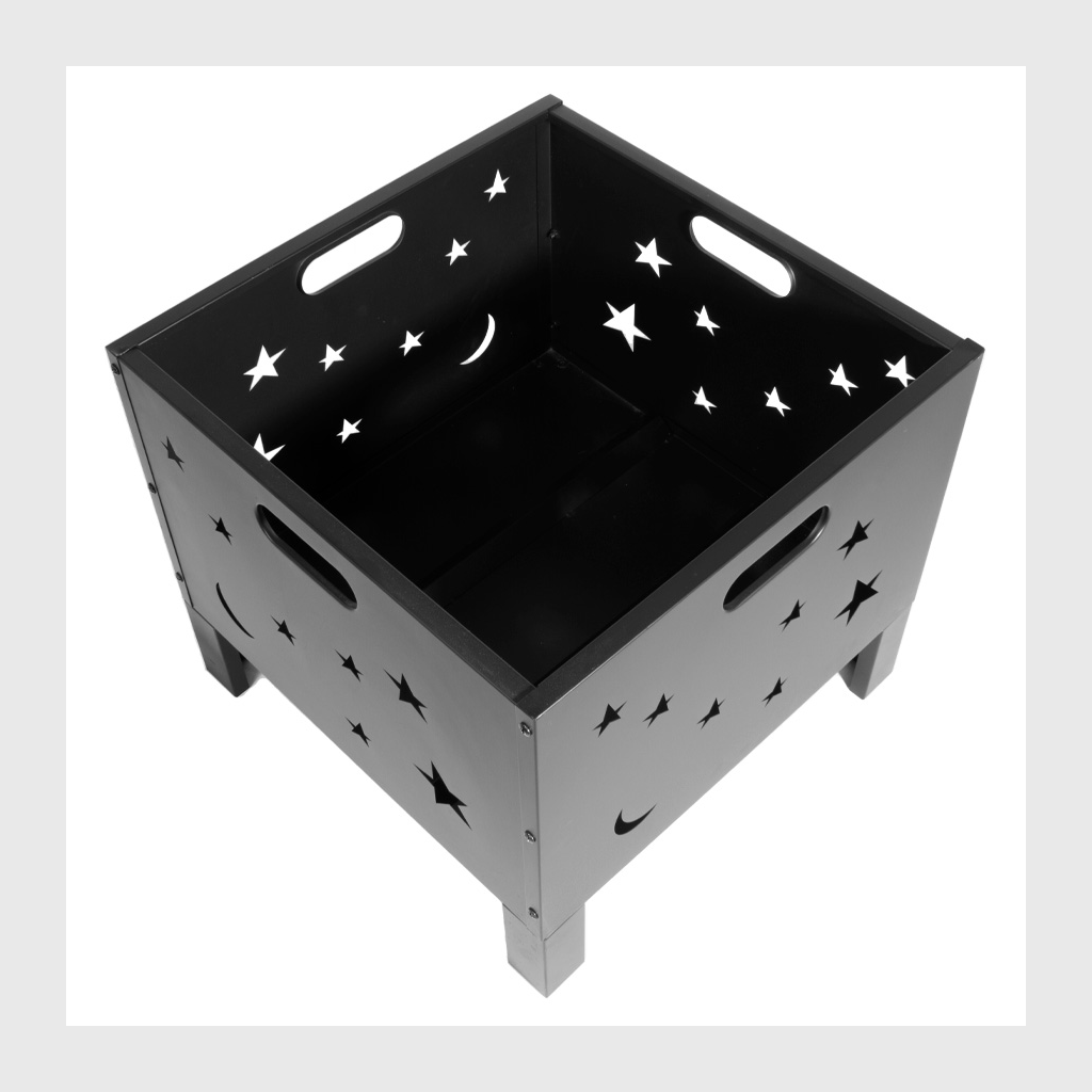 Brasero para Leña o Carbón, de Acero negro, modelo «Constelación». Bowl para fuego: 50 x 50 x 33cm x 10.6mm. Fácil de armar y transportar. Incluye Manual instructivo de armado en español.