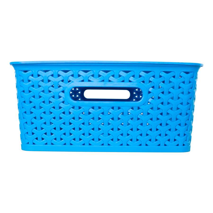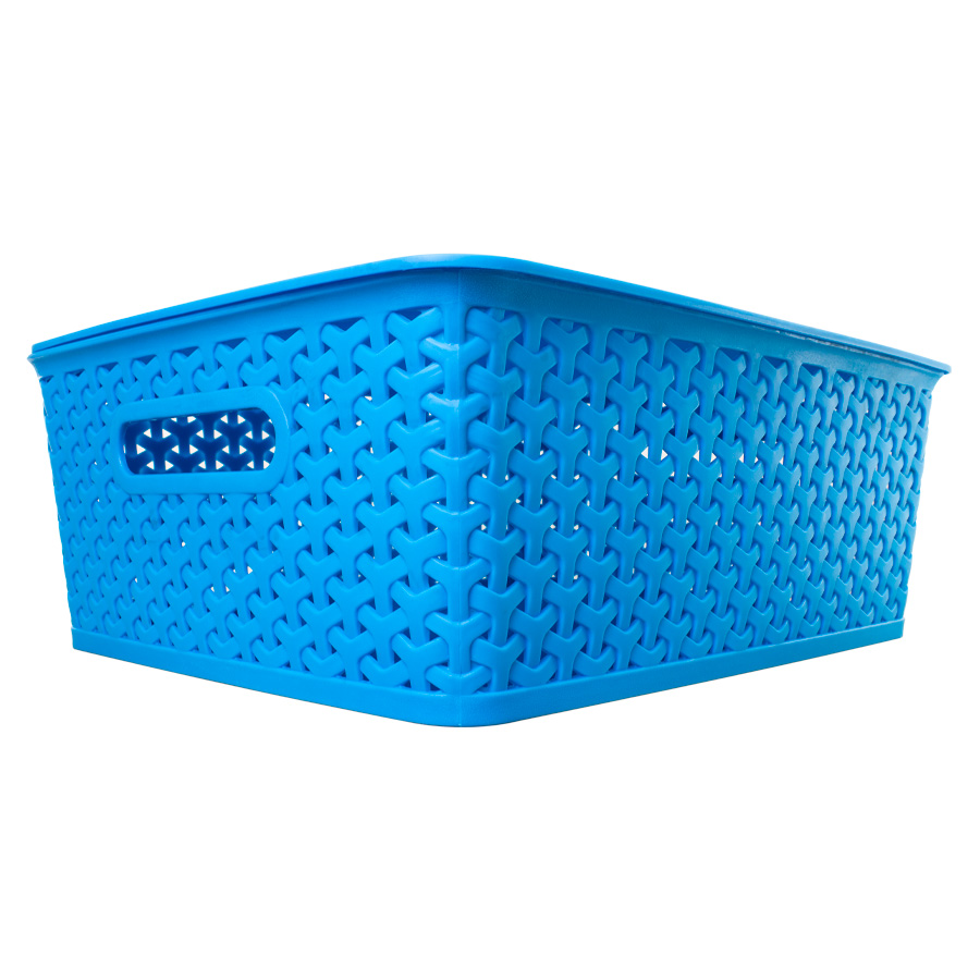 Canasto plástico organizador de 36.5 x 30 x 13.5 cm con tapa plástica. Diseño entrelazado tipo ratán. Capacidad 15 lt.