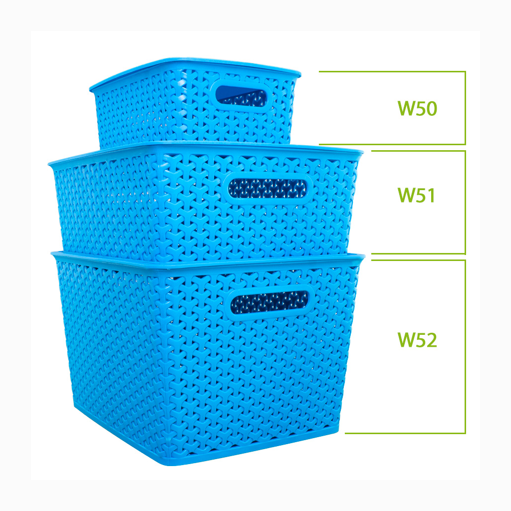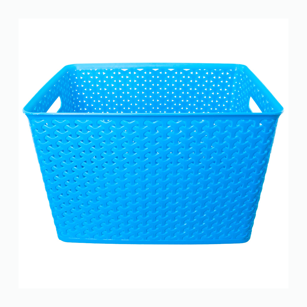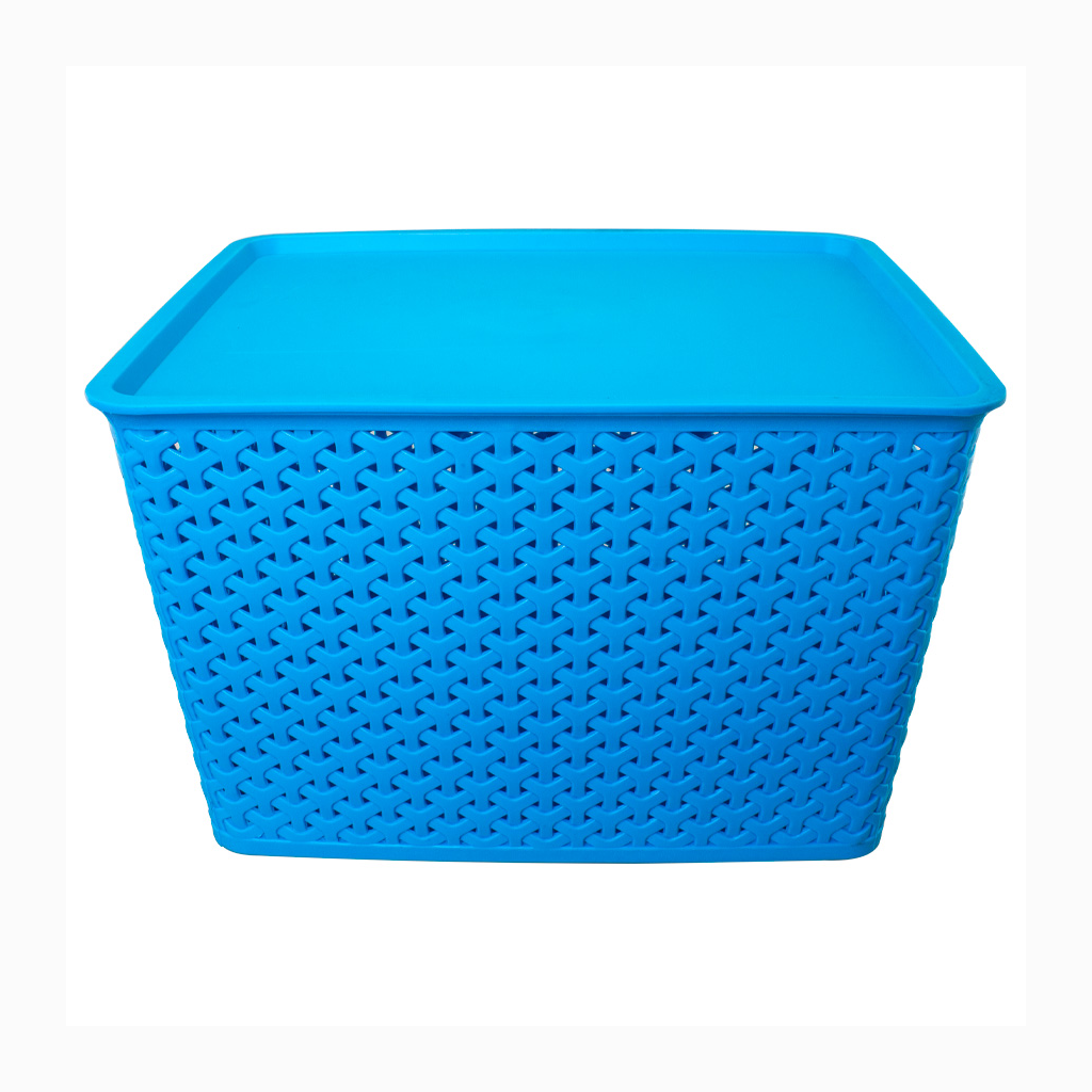 Canasto plástico organizador de 36.5 x 30 x 22 cm con tapa plástica. Diseño entrelazado tipo ratán. Capacidad 24 lt.