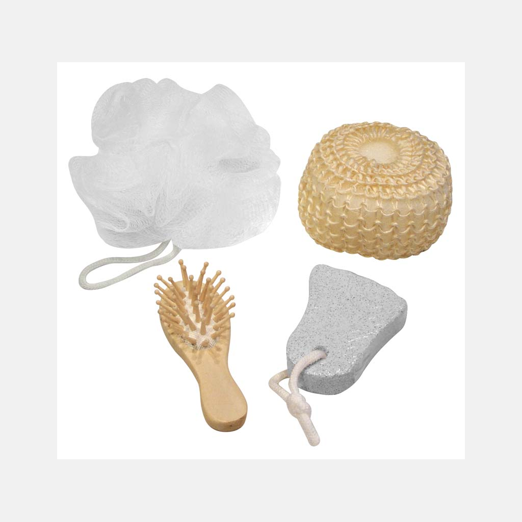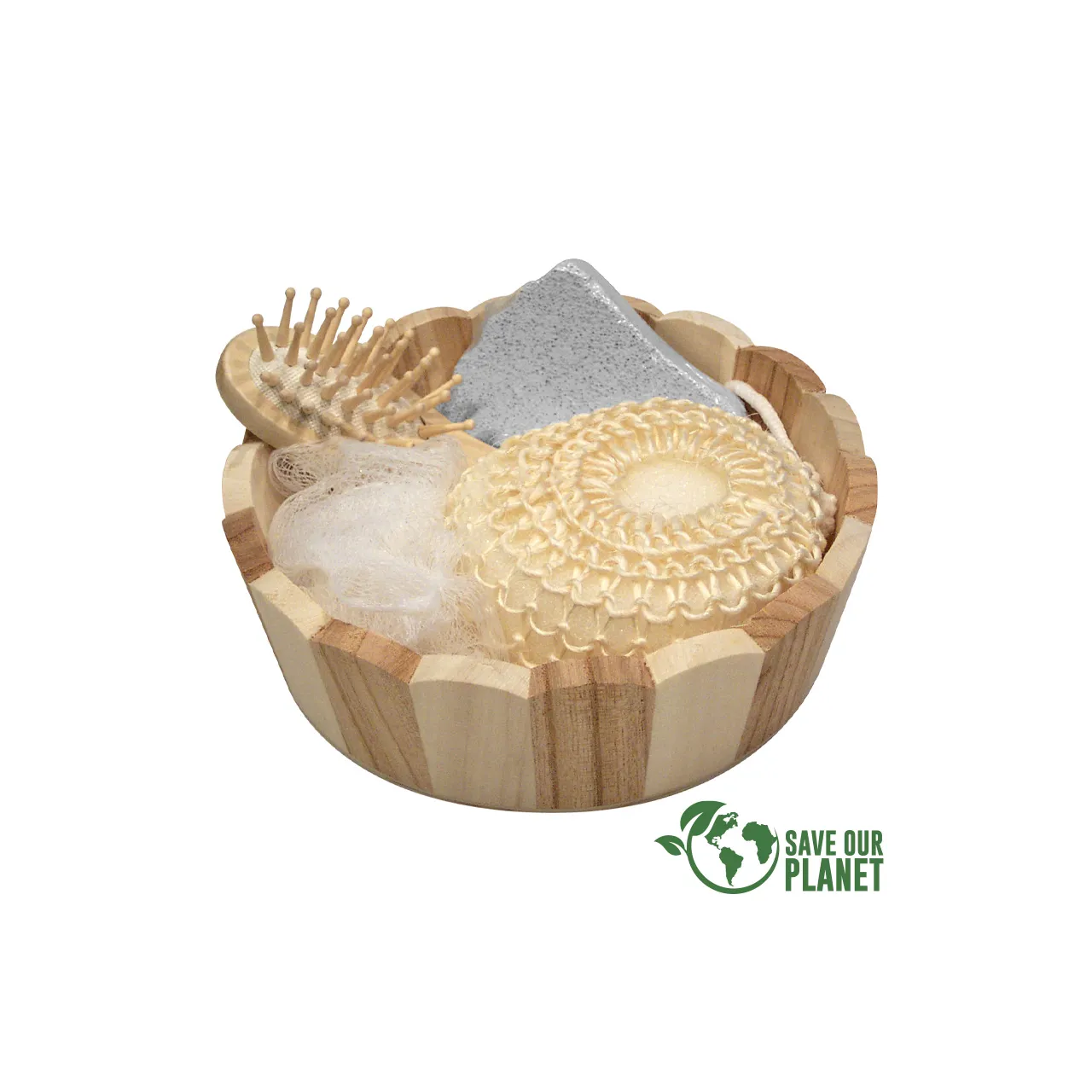 Canasto SPA de belleza en madera modelo «Naturals». Contiene cepillo de pelo, esponja malla, piedra pomez y esponja de masaje corporal.