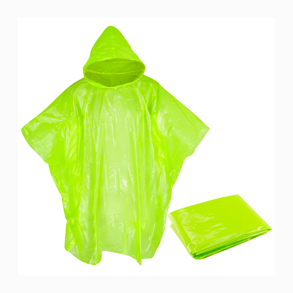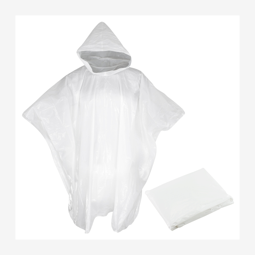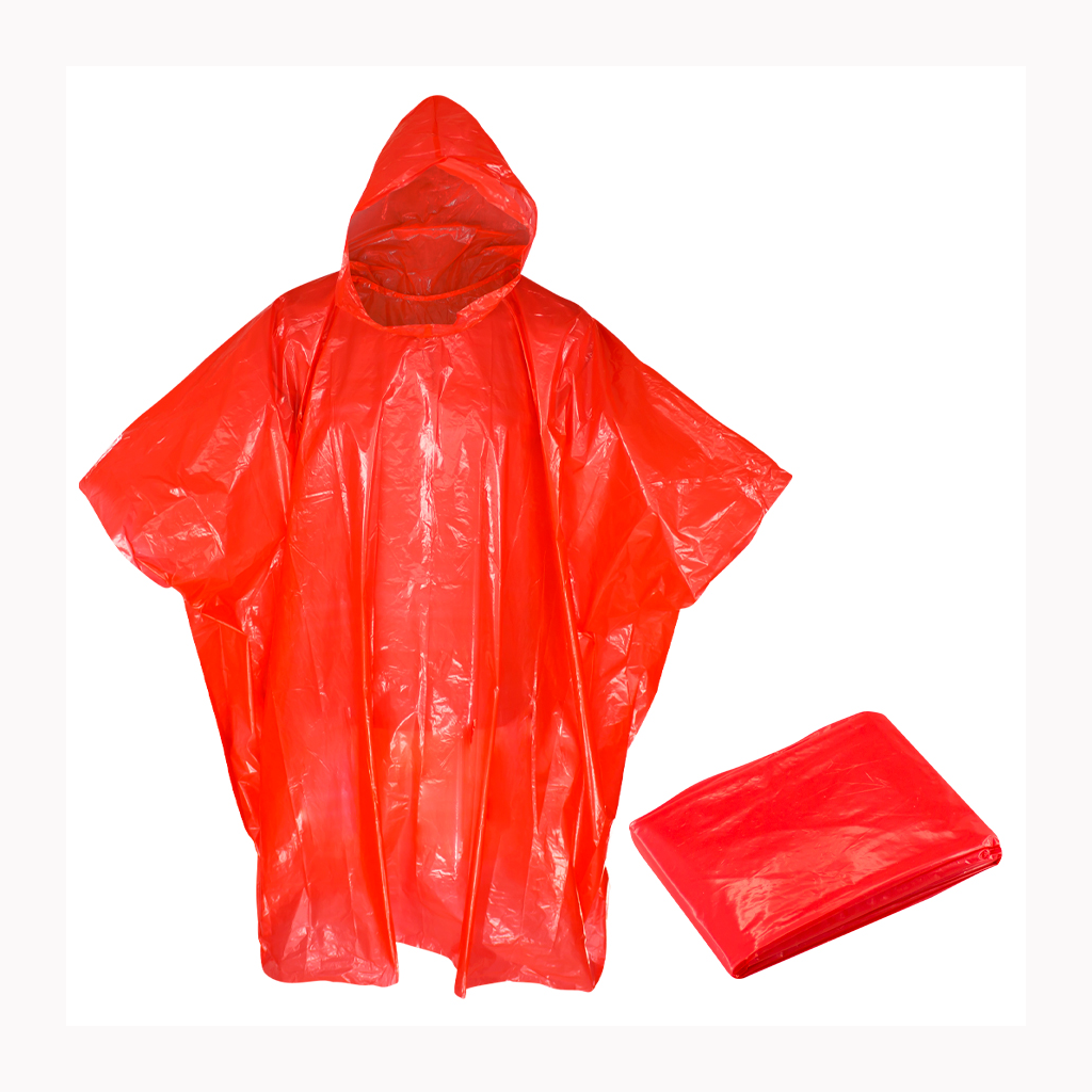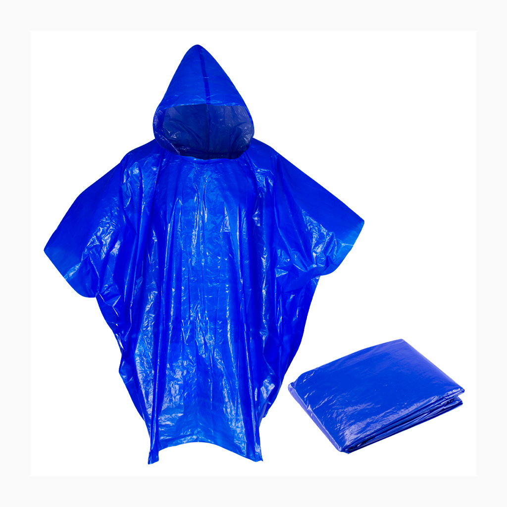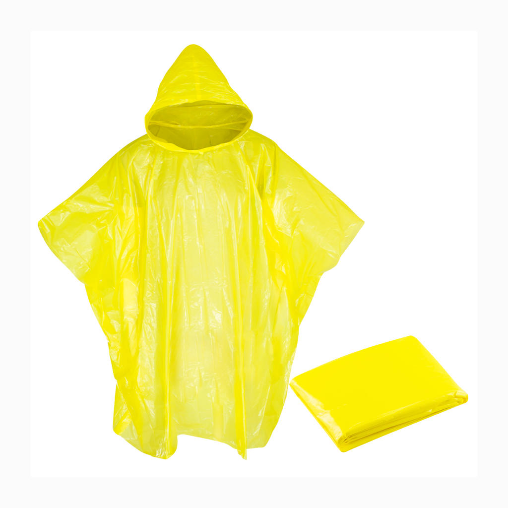 EMERGENCY PONCHO – Capa de Agua con capucha, en Polietileno de 0,03mm de espesor. Presentación en bolsa de polipropileno transparente con cierre tipo Ziploc.