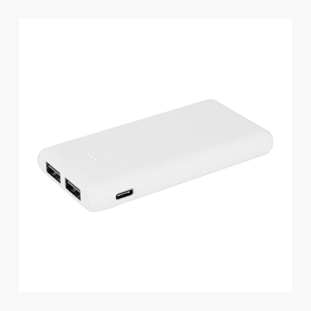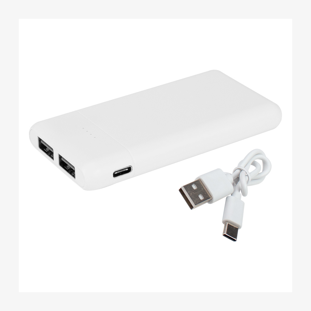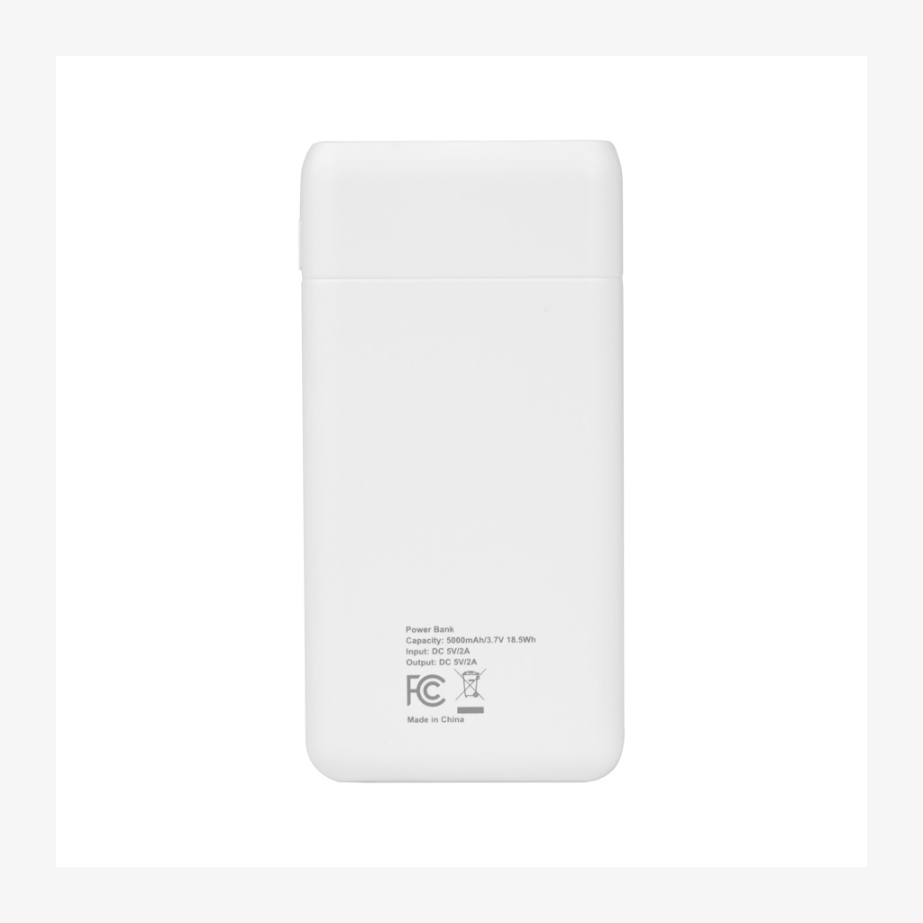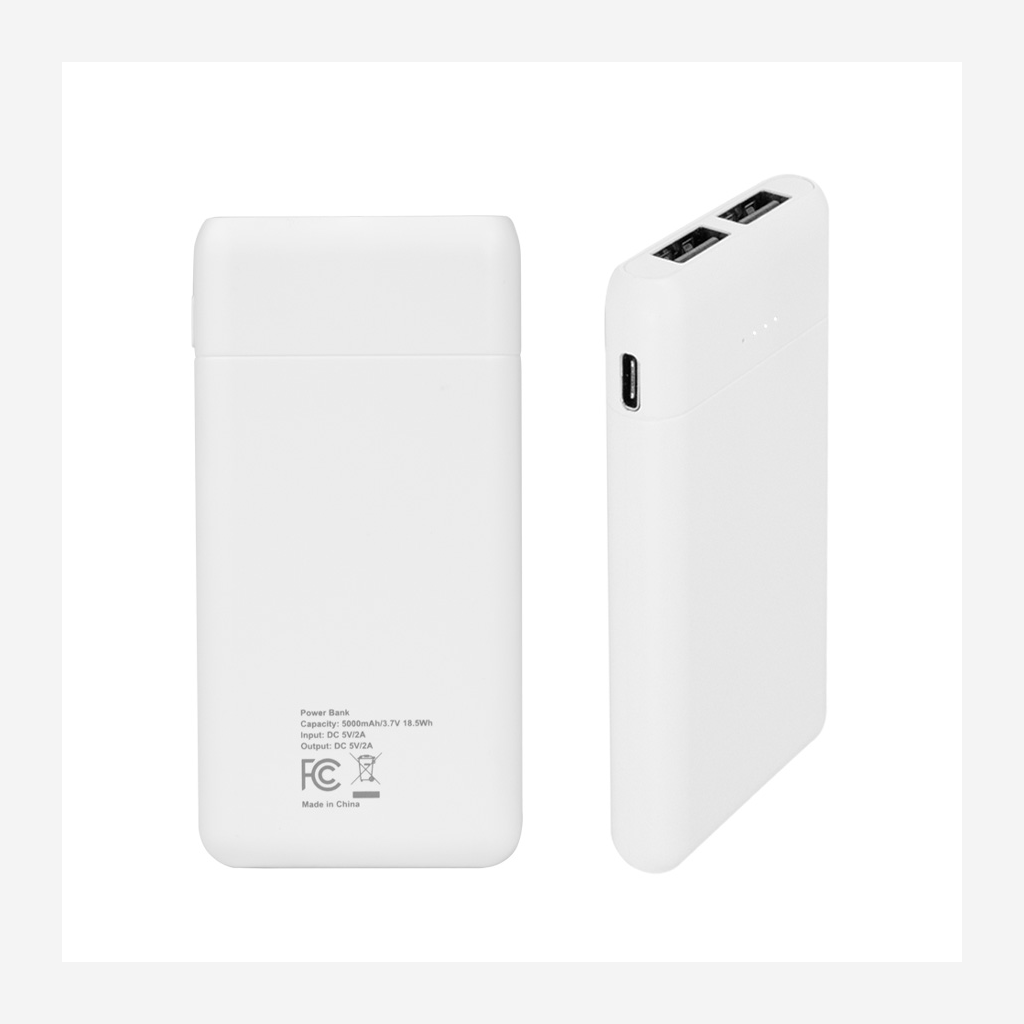 Cargador Power Bank USB portátil plástico ABS blanco, con indicador de carga y doble salida USB. Capacidad 5000mAh. Entrada DC 5V/2A, salida DC 5V/2A. Incluye cable USB/Type C. Batería recargable incorporada. Presentación en caja de regalo de cartulina blanca con colgador para ganchera .
