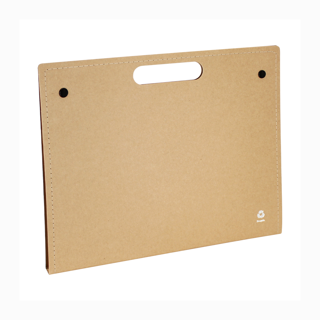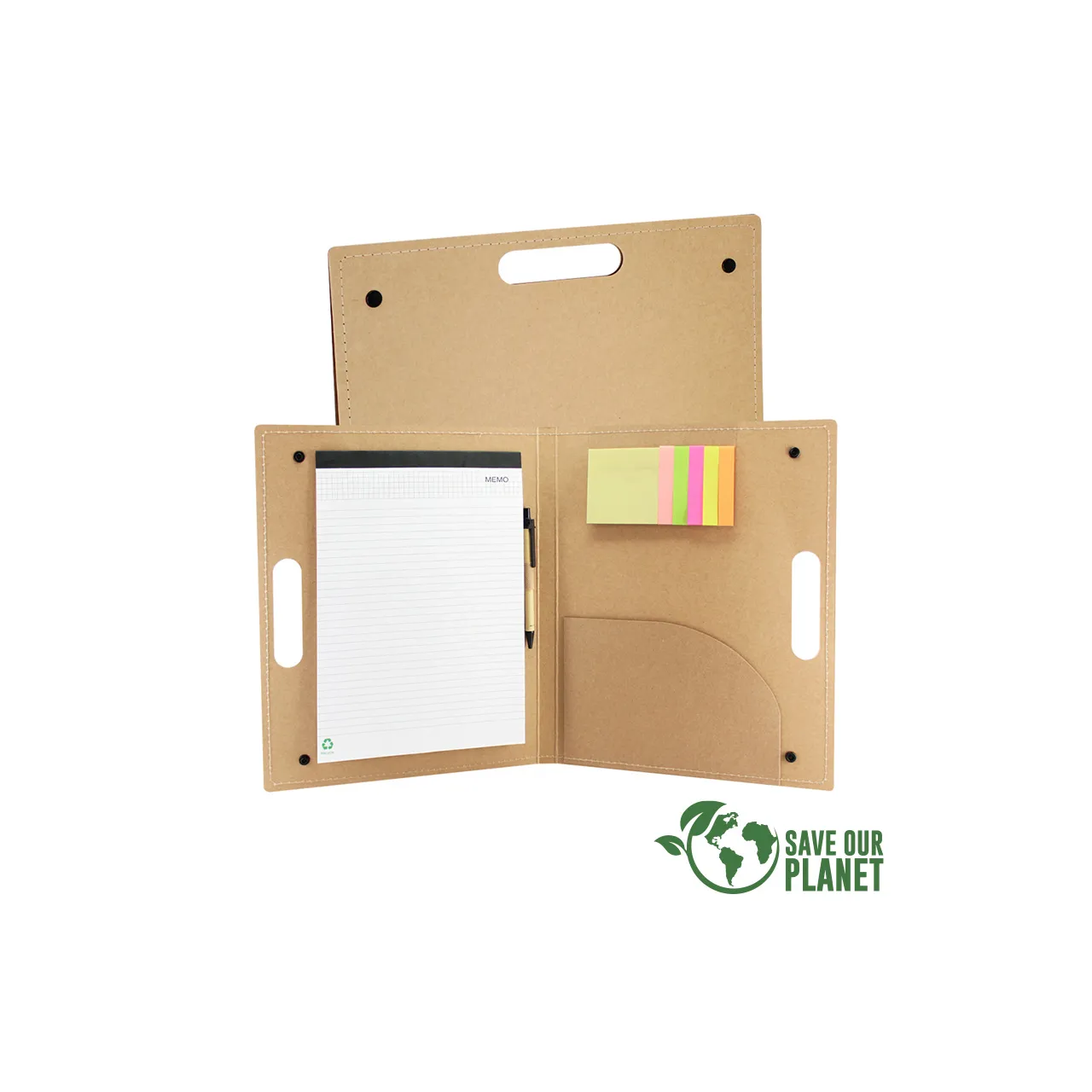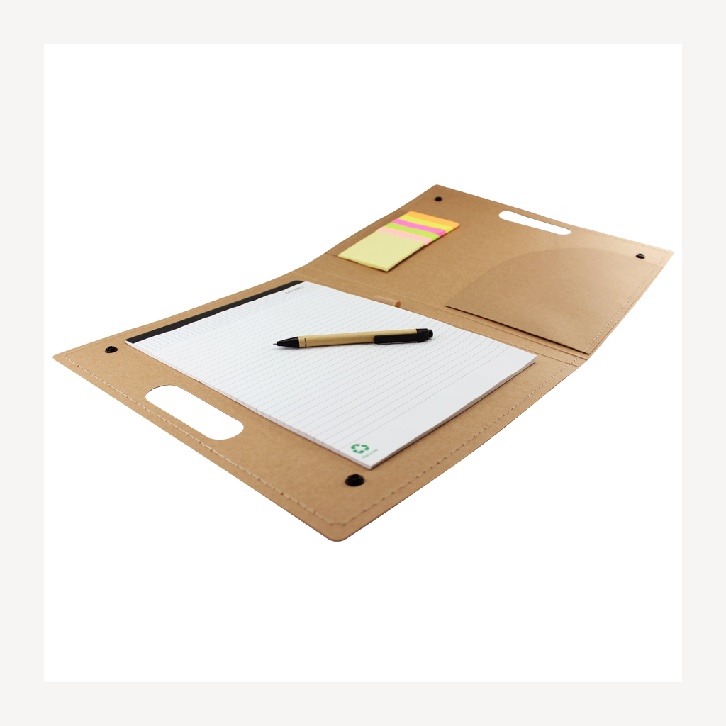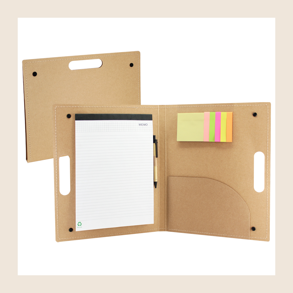 Carpeta Ecológica tipo Maletín, en cartulina reciclada, con broches. Incluye Block Lineado A4 20 hojas, 1 taco notas adhesivas de 25 hojas de 7,6 x 7,6 cm + 5 tacos de 25 banderitas adhesivas de 7,6 x 1,5 cm., bolsillo interior y 1 bolígrafo ecológico.