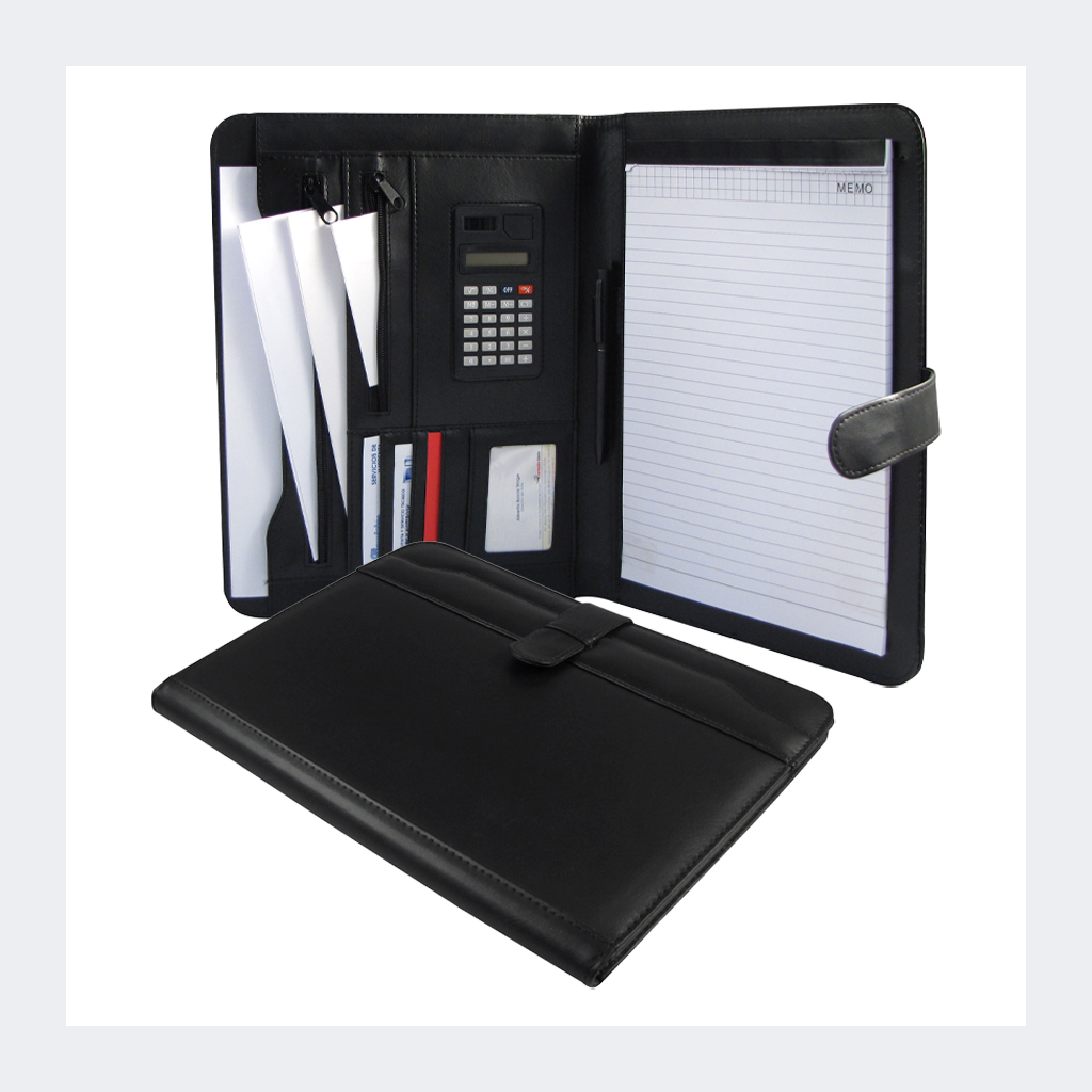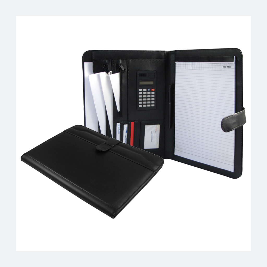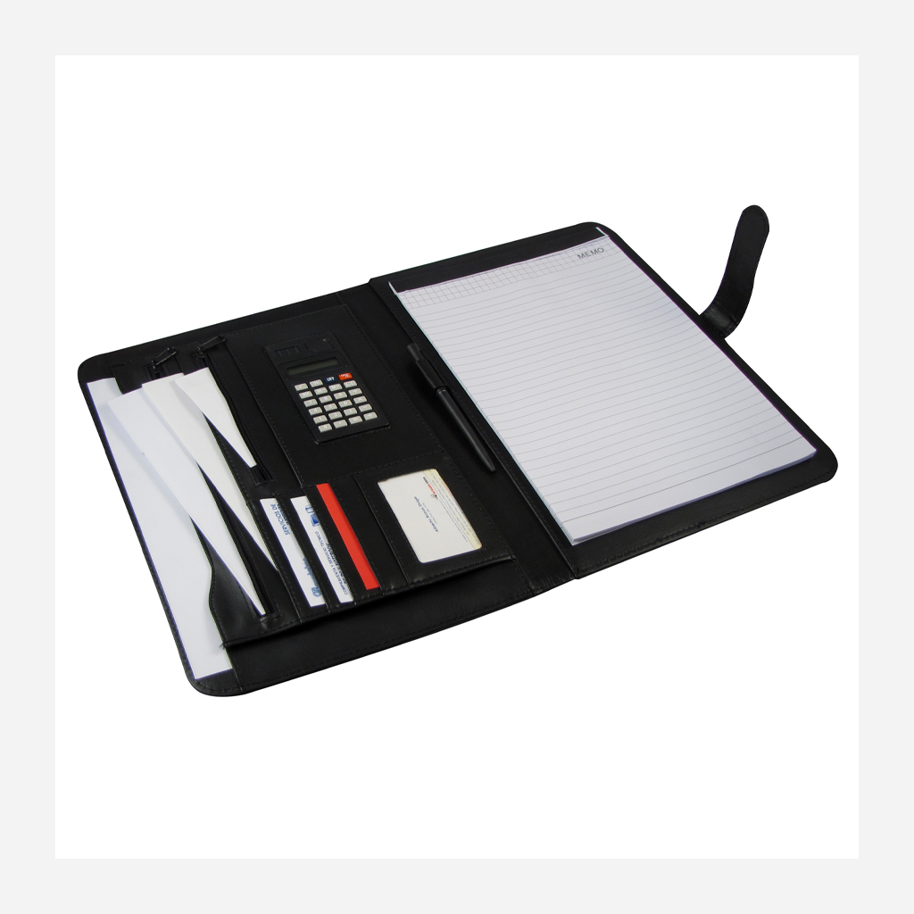 Carpeta Simil Cuero Negro. En el interior incluye Calculadora solar, Block de 30 hojas lineadas tamaño oficio, Bolígrafo negro a pasta, Bolsillo para documentos tamaño oficio, Bolsillos con Cierre y Compartimentos para Tarjetas.