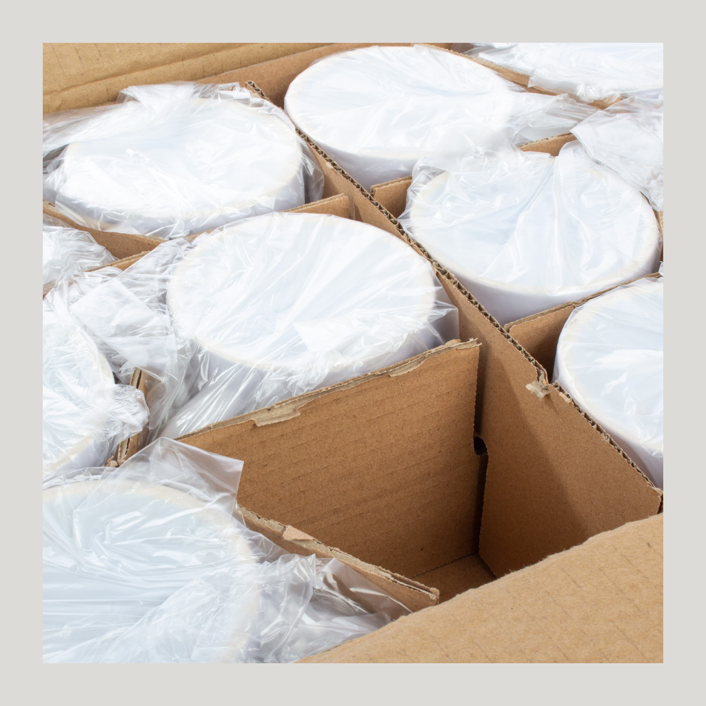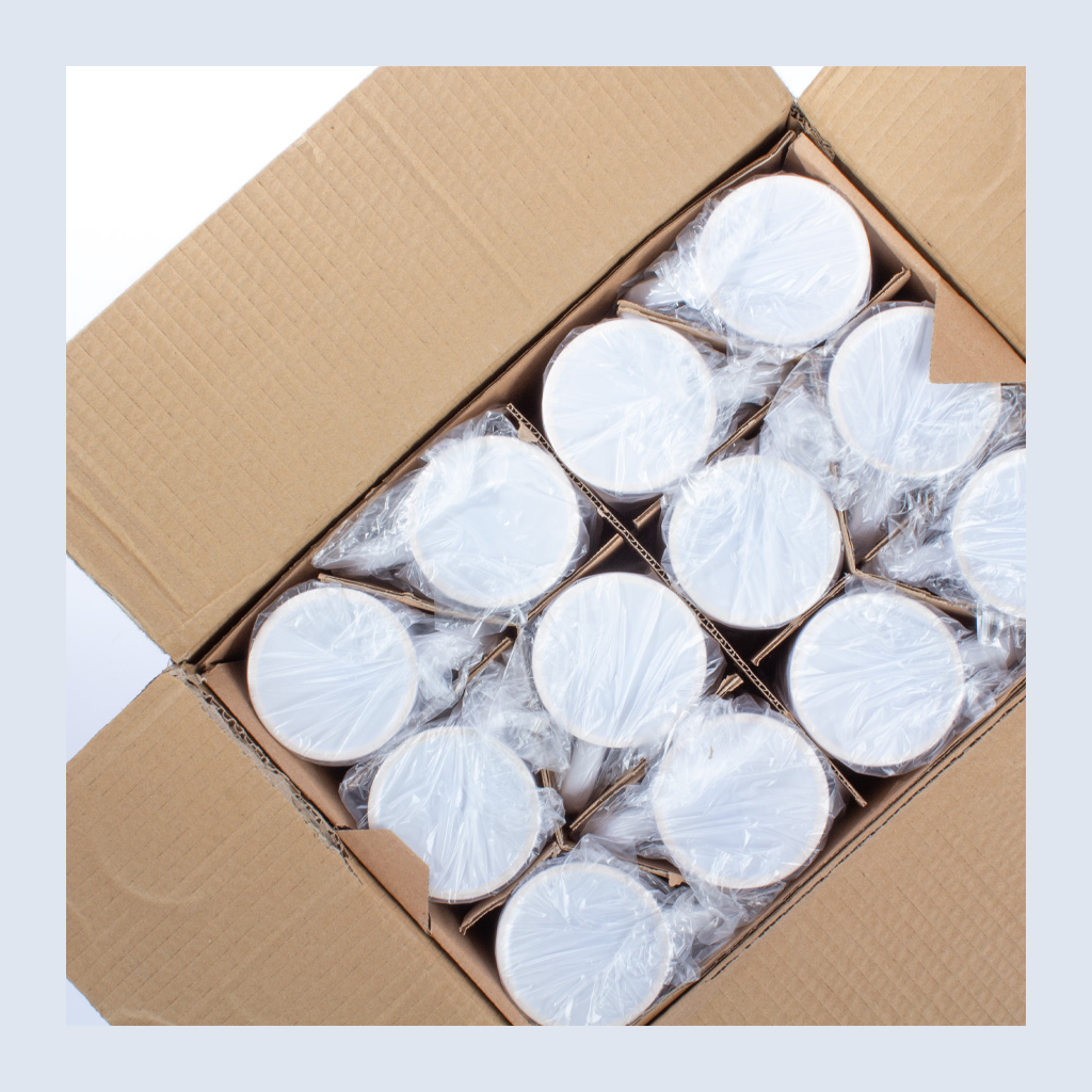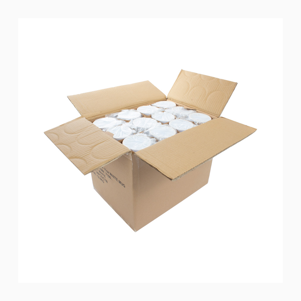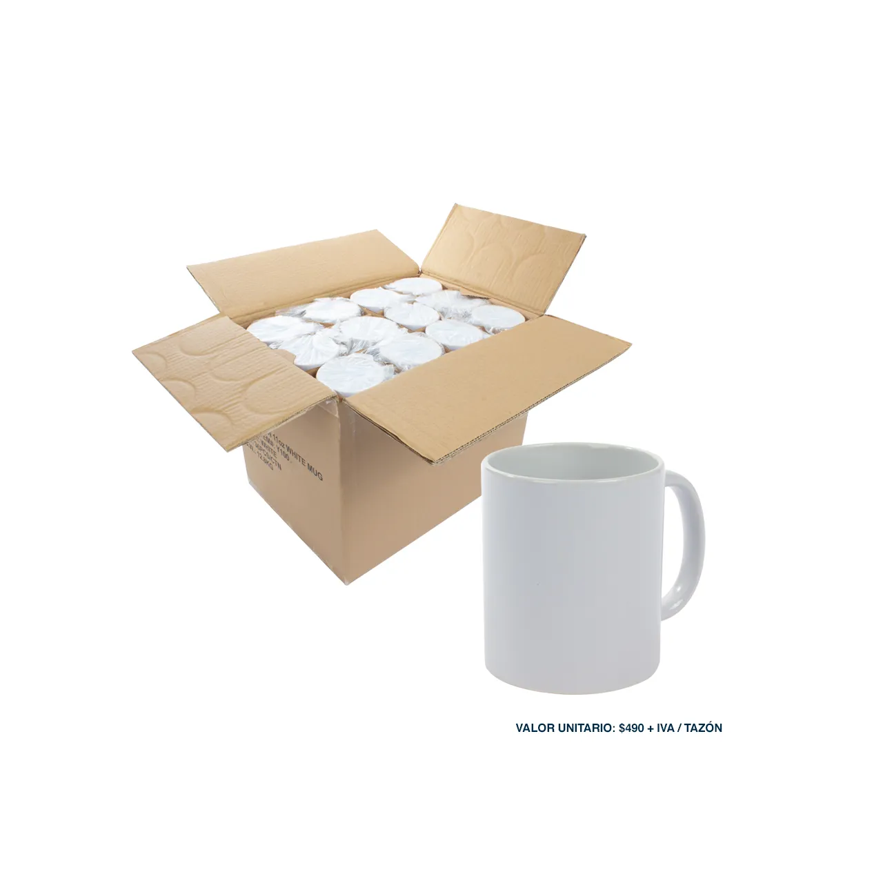 Cartón con 36 tazones cerámicos extra-blancos para sublimación. Presentación unitaria en bolsa plástica transparente, con separadores de cartón dentro de la caja (no incluye caja individual).