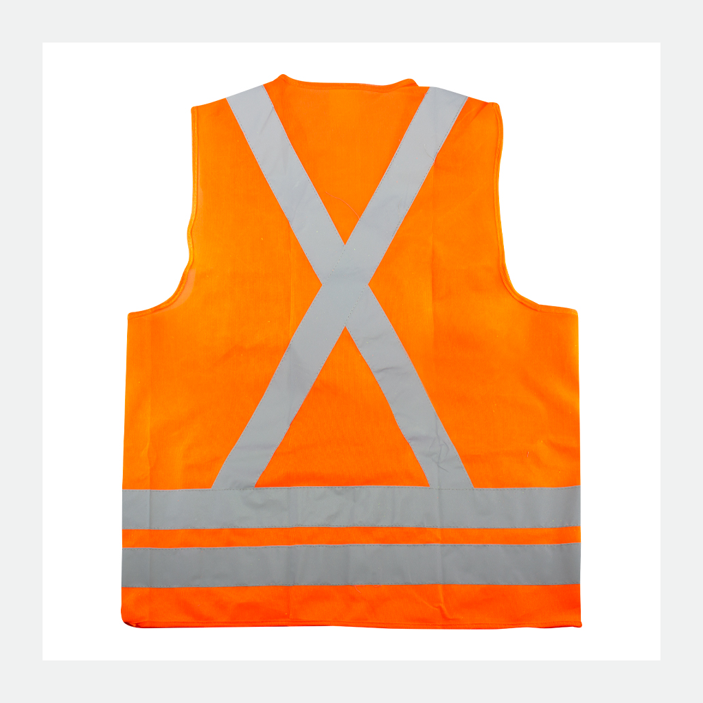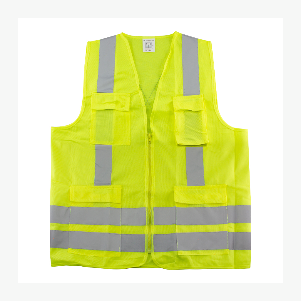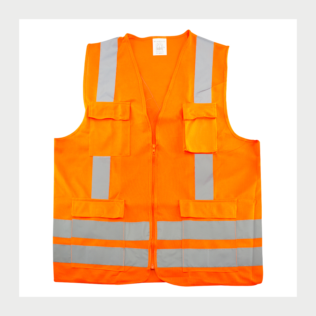 Chaleco Reflectante de Seguridad modelo «Supervisor», 100% tela poliéster 120 g/m2 fluorescente con bandas reflectantes color plateado de 5 cm. de ancho. Incluye 4 bolsillos y cierre-eclair. Cumple con norma legal vigente EN 471.