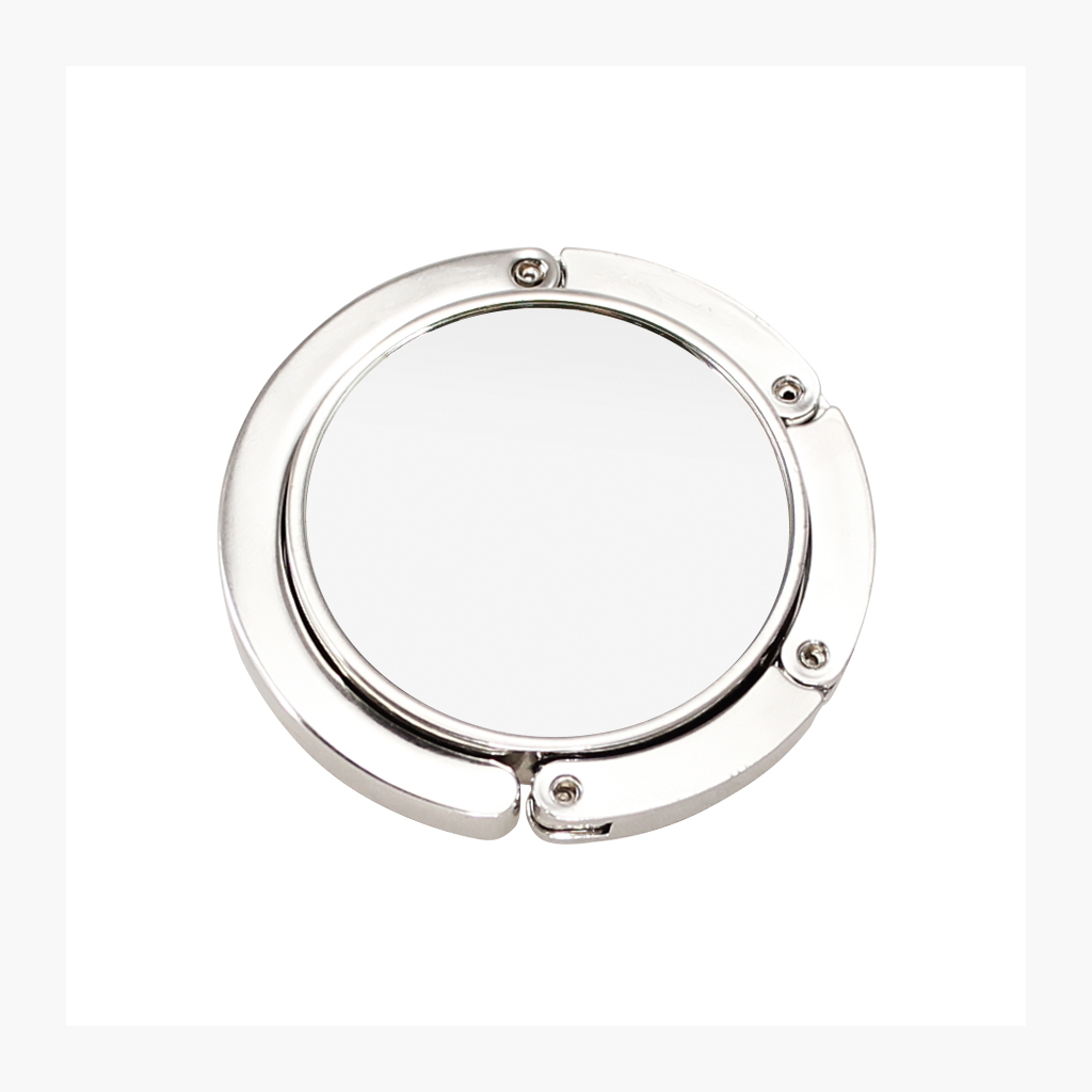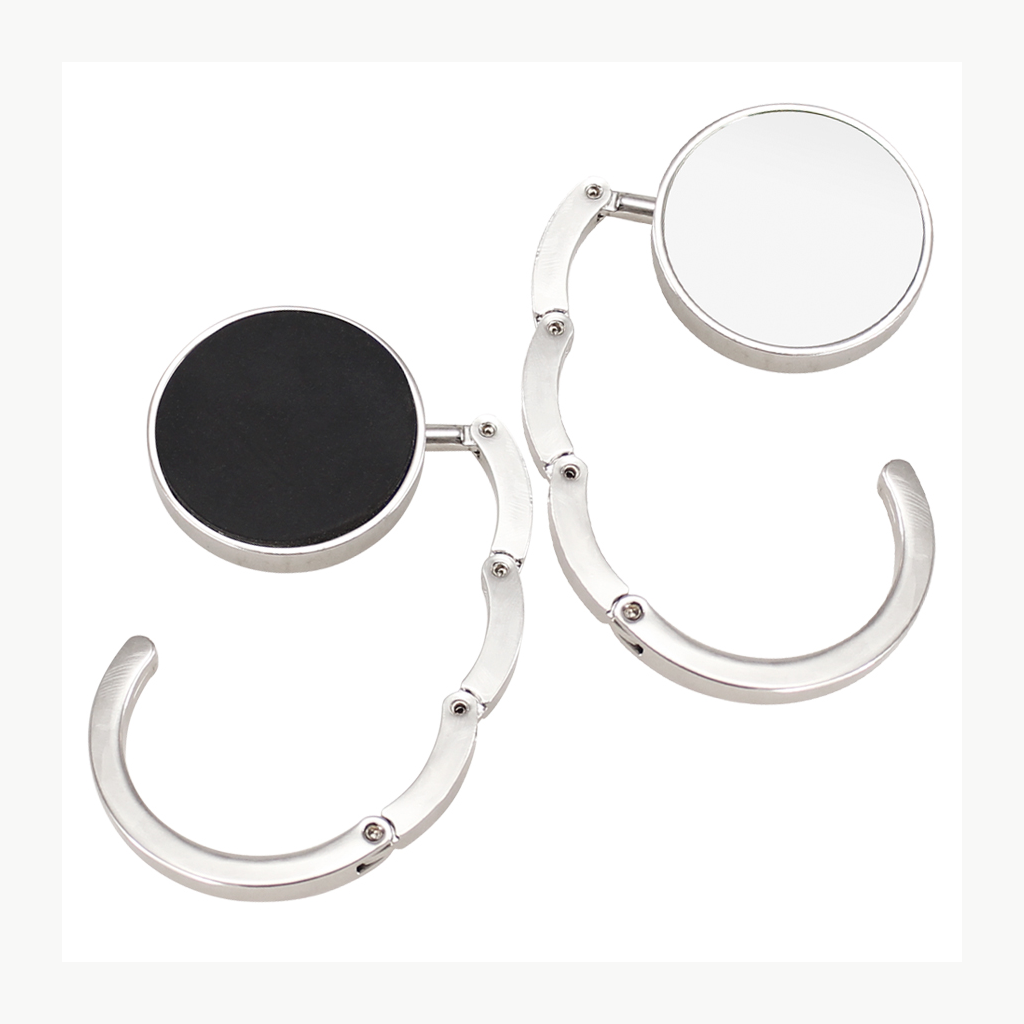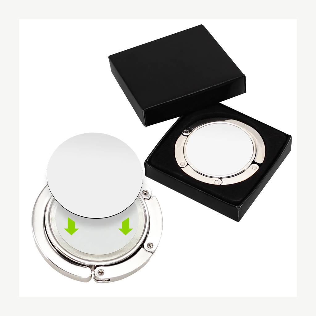 Colgador Metálico redondo de sobremesa, para Bolsos y Carteras, con círculo central para Sublimación. Presentación en estuche laminado negro con cuna aterciopelada.