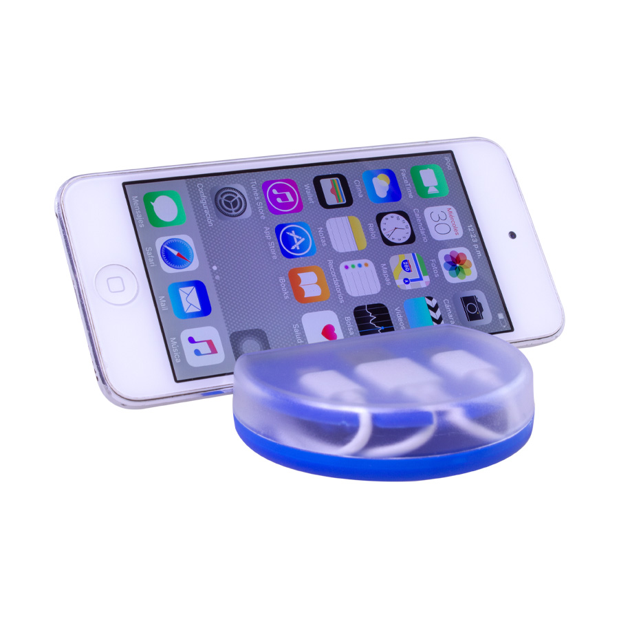 Connect Multicargador 4-en-1, en caja plástica redonda con tapa translúcida y soporte para celular, incluye terminal de carga USB y multicables Micro USB / i-phone / Type C. Incorpora nueva tecnología de cable cargador dual Micro USB y i-phone (en el mismo terminal). Compatible con dispositivos Android, Apple y Type C.