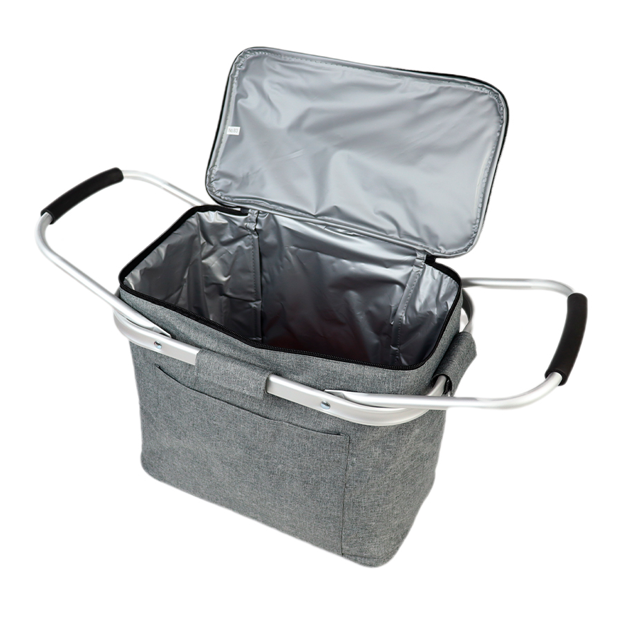 Bolso cooler grande de 23 litros de capacidad, en tela poliéster 300D/PVC. Montado sobre estructura de aluminio con asas plegables. Interior térmico aislante de PEVA y acolchado con esponja PE FOAM.