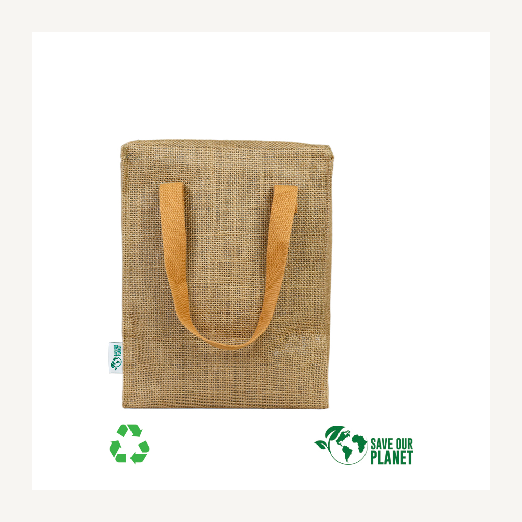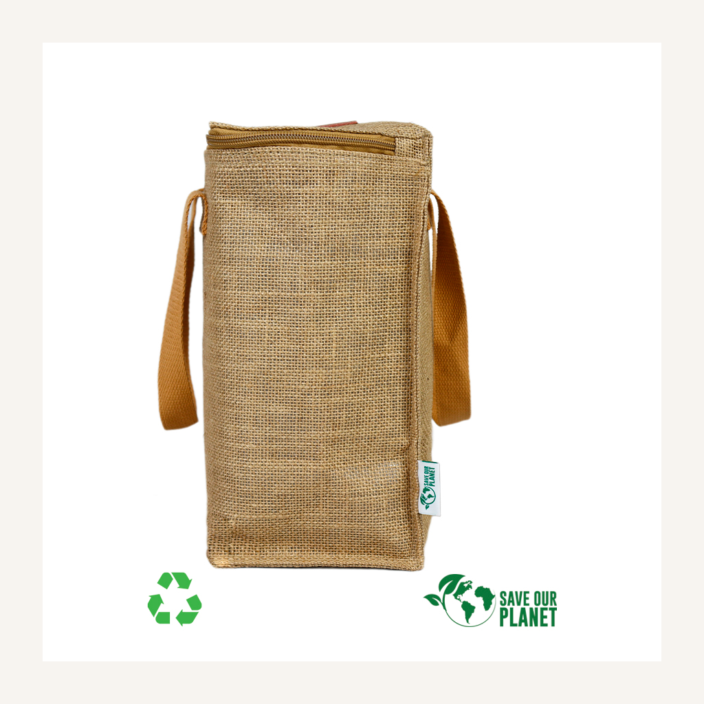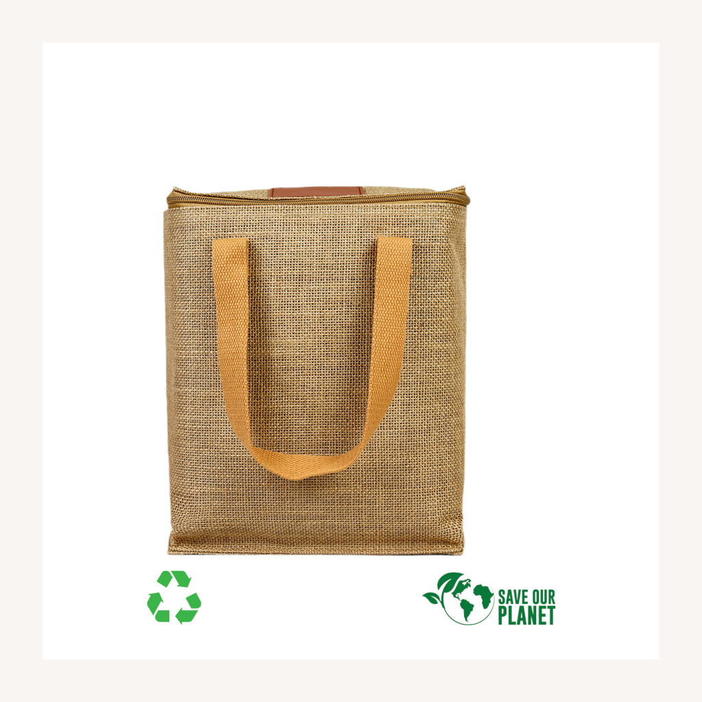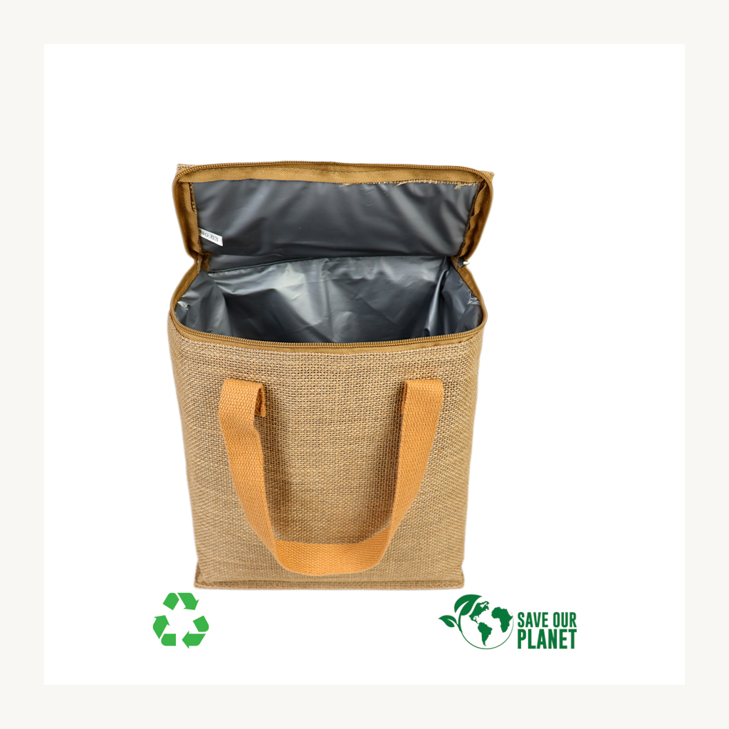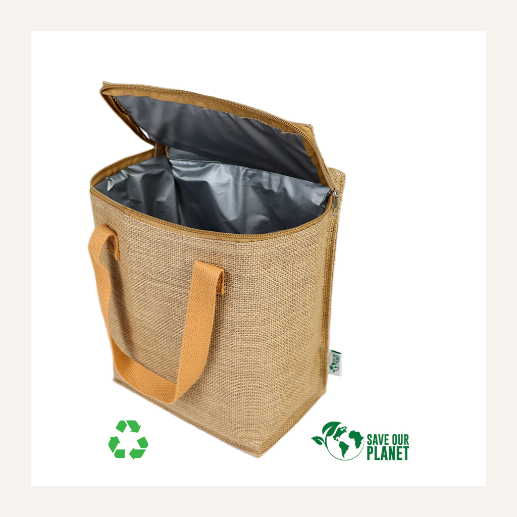 Bolso cooler con exterior de Yute e interior térmico aislante de PEVA y acolchado con esponja PE FOAM. En la tapa, sección superior del cooler, viene con una ventana cosida de eco-cuero, para aplicar logo de manera más elegante.