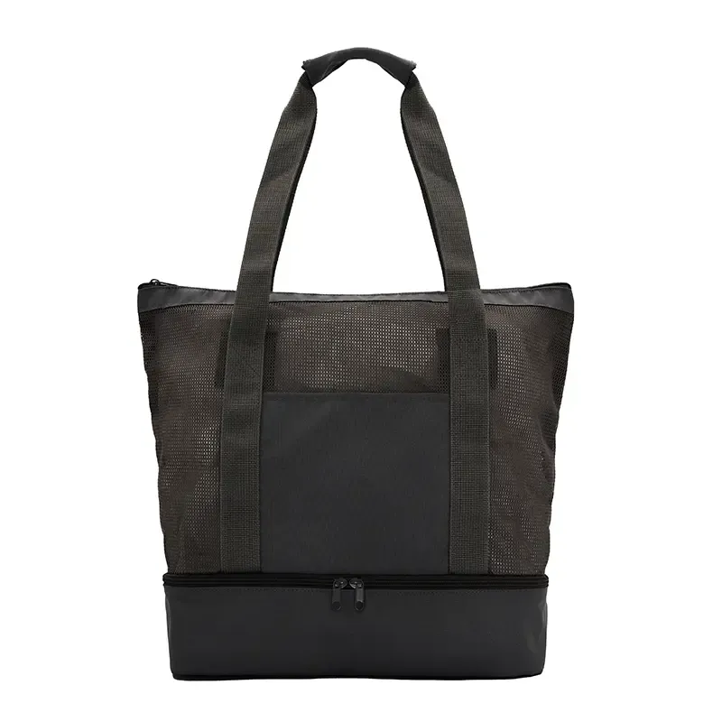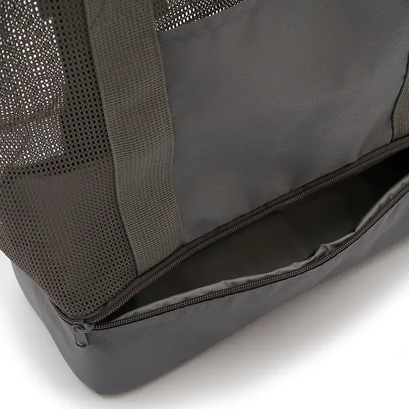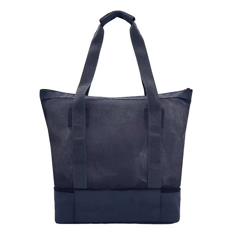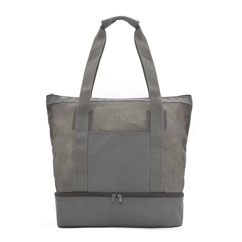 Bolso térmico tipo tote con doble compartimiento. Confeccionado en poliéster reciclado RPEAT 300D y 150D, malla RPEAT, espuma PE de 3 mm y revestimiento interior en PEVA 13C. Cuenta con compartimiento superior de malla, una base aislante térmica y asas largas reforzadas. Ideal para mantener alimentos y bebidas frescas durante salidas al parque, la playa o paseos.