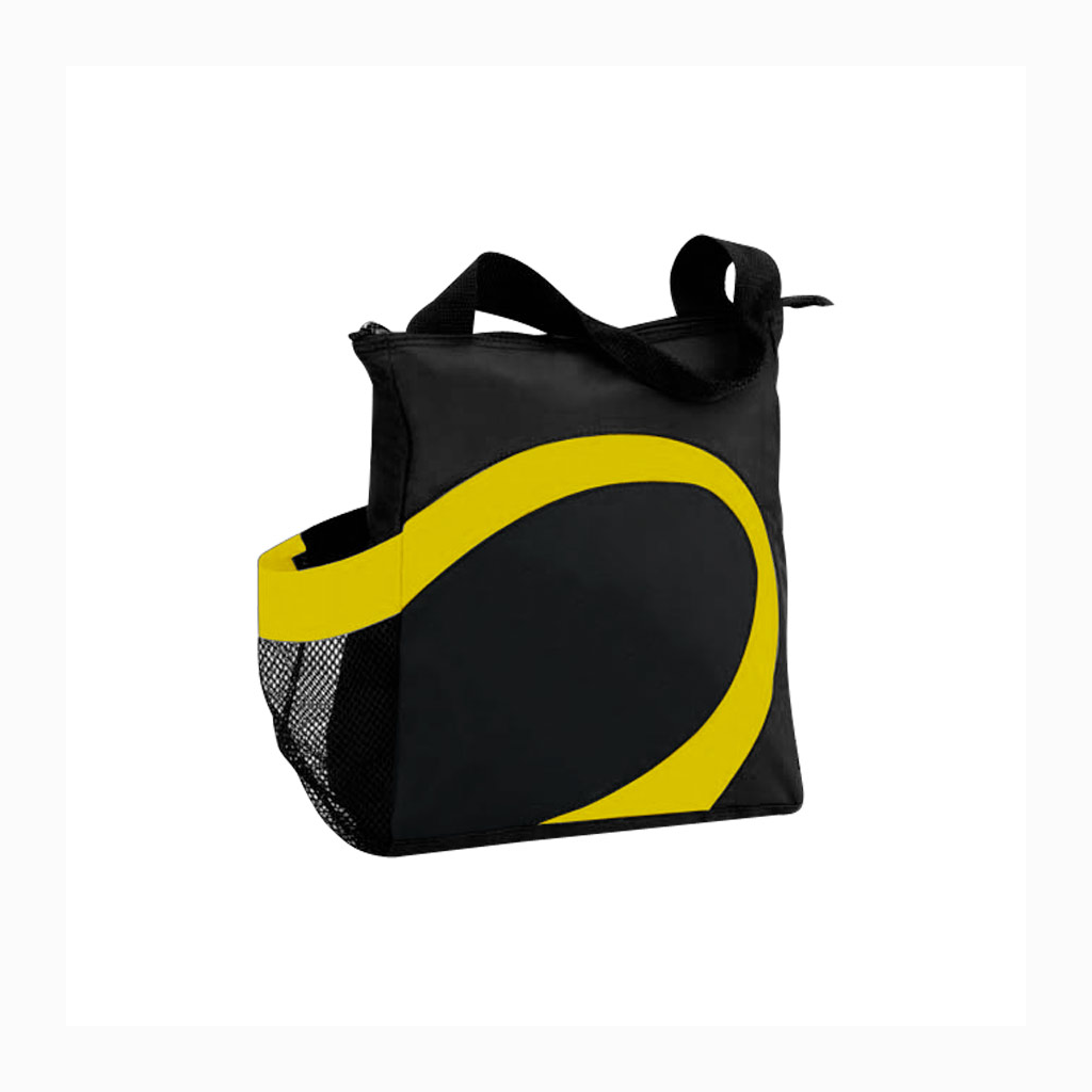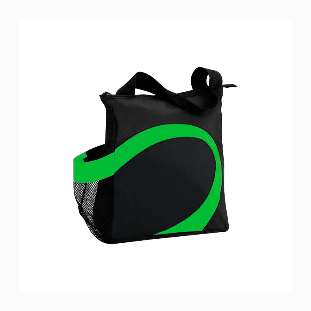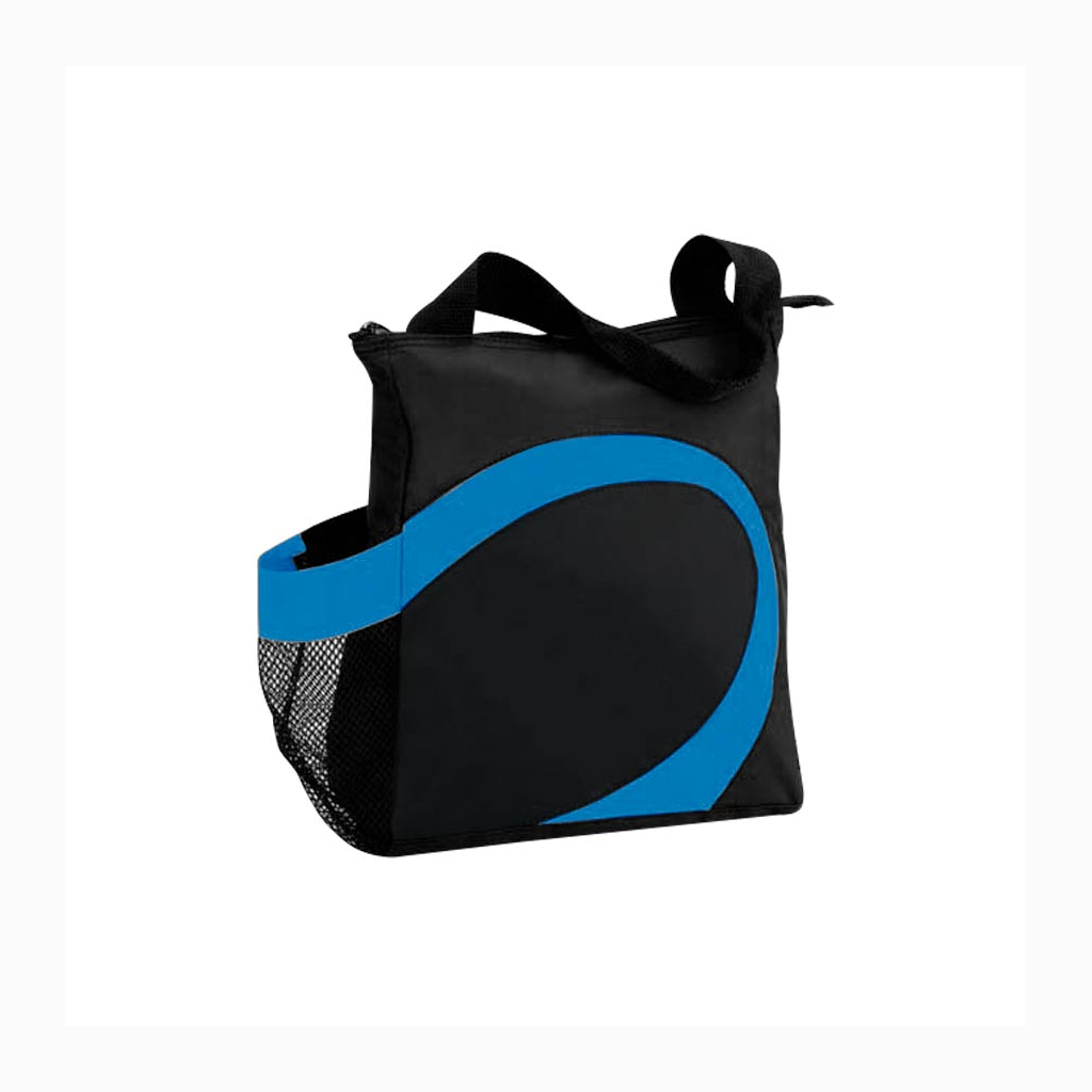 Cooler modelo «Wave». Tela exterior Polyester 70D/PVC. Tela interior plateada aislante 15C PEVA + relleno 3mm esponja PE. Cierre cremallera superior. Incluye bolsillo lateral en tela malla.
