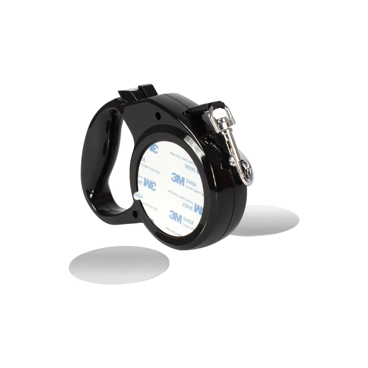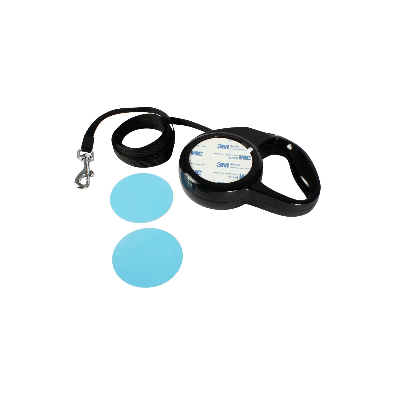 Correa extensible de 3mts para mascota, en plástico ABS negro, mosquetón de Acero inoxidable y correa de nylon color negro con sistema de traba. Contiene 2 compartimentos circulares y 2 placas metálicas blancas, para sublimar y pegar en ambos lados del producto.
