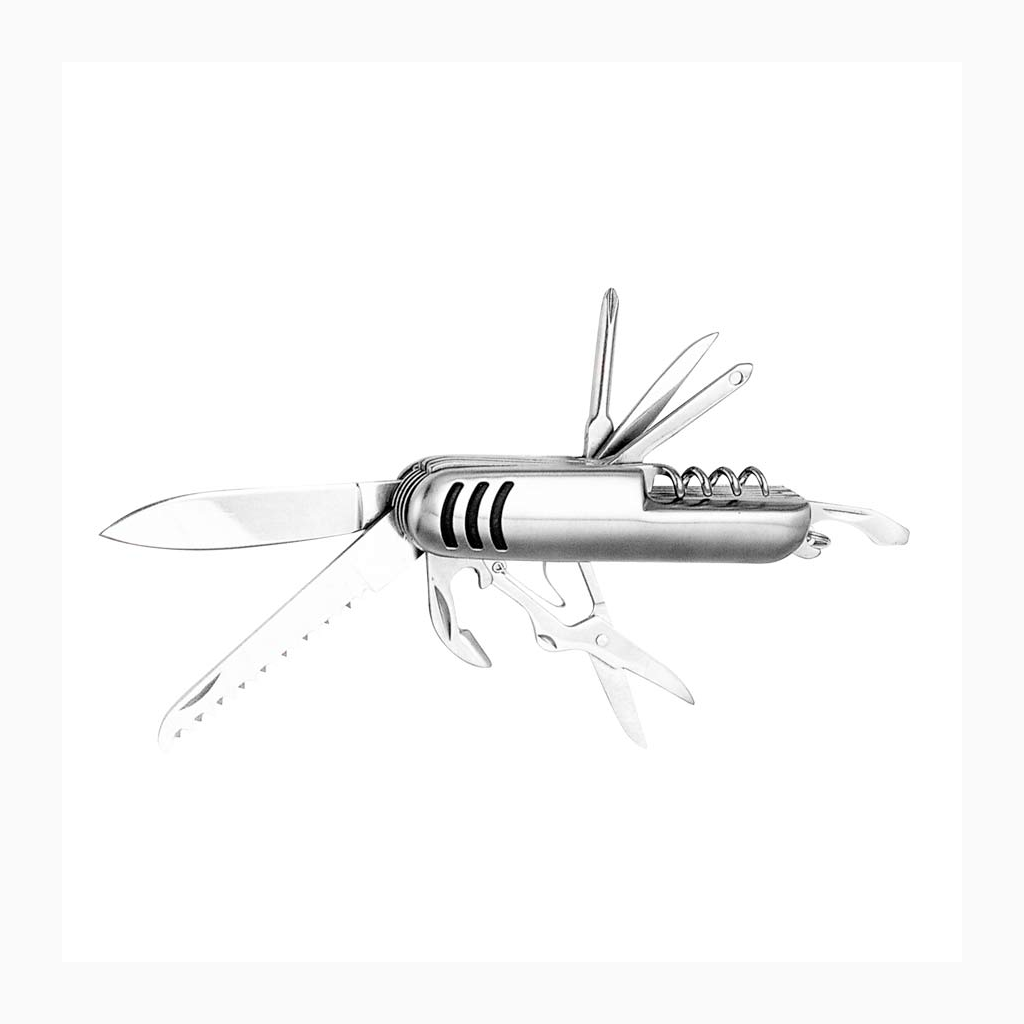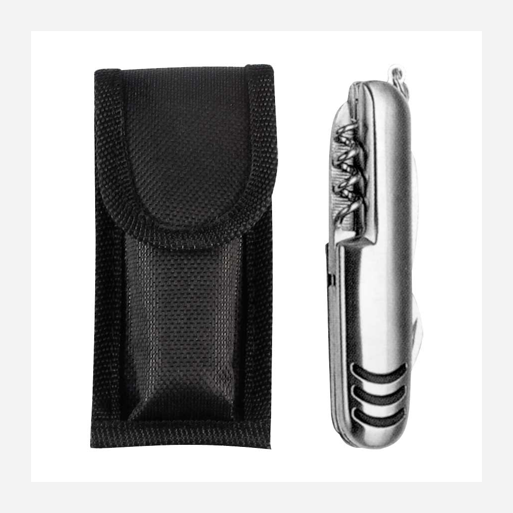 Cortaplumas de Acero Inoxidable con 10 funciones. Incluye funda de tela negra + caja de regalo plateada.