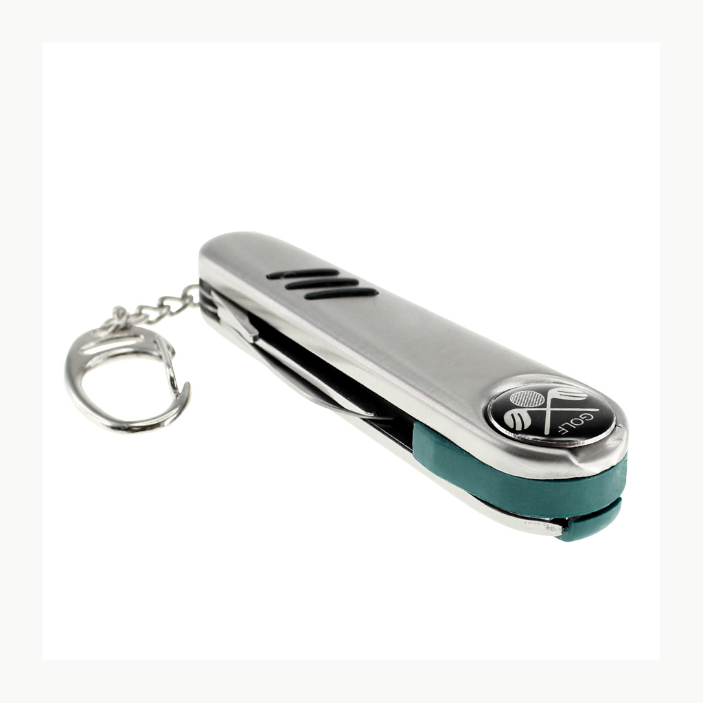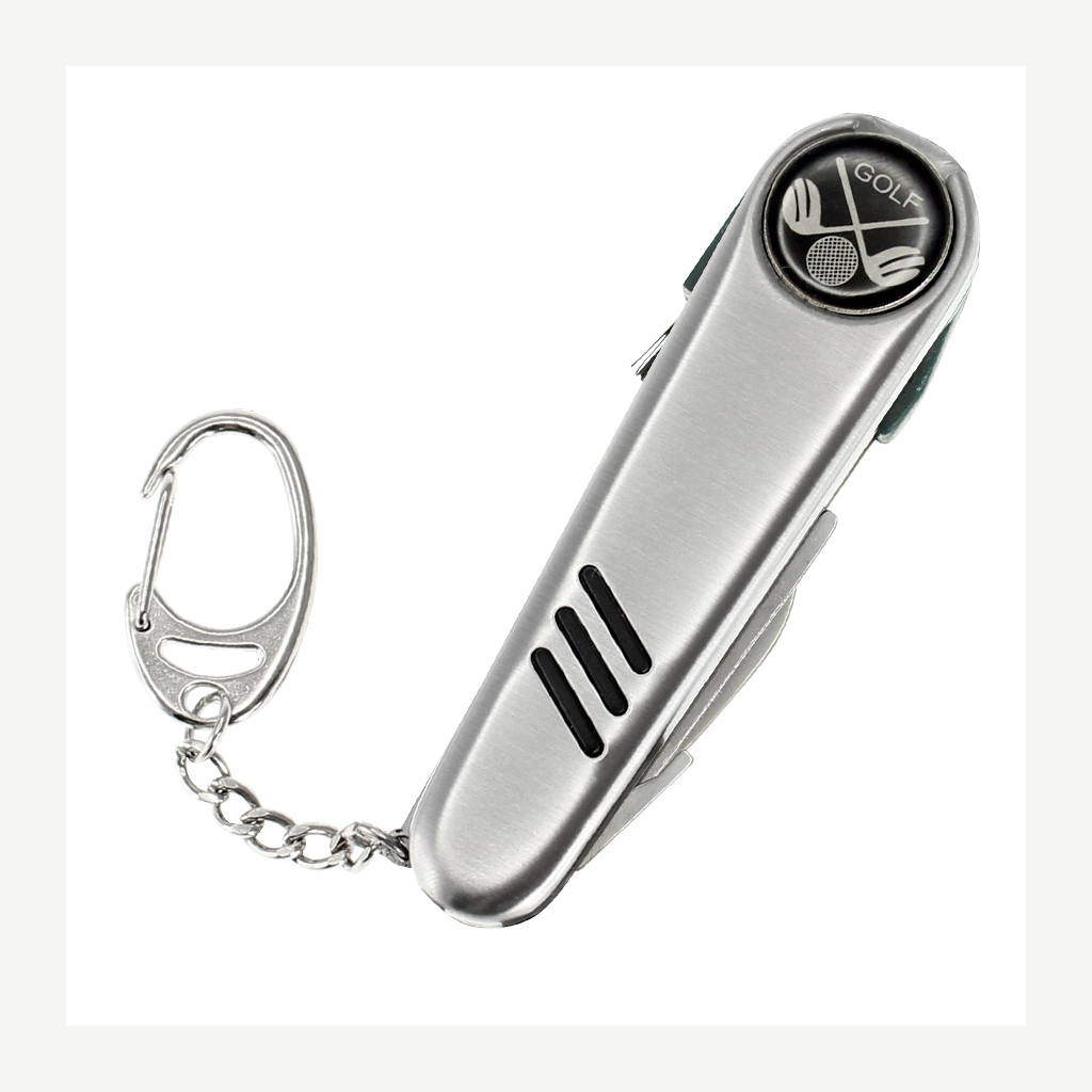 Cortaplumas de Golf de Acero Inoxidable con 7 funciones. Incluye Cuchillo, Levanta-Pique corto, Levanta-Pique largo, Cepillo, Bolígrafo tinta negra, Marcador magnético y llavero. Presentación en caja de regalo plateada.