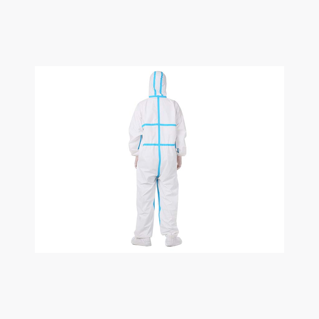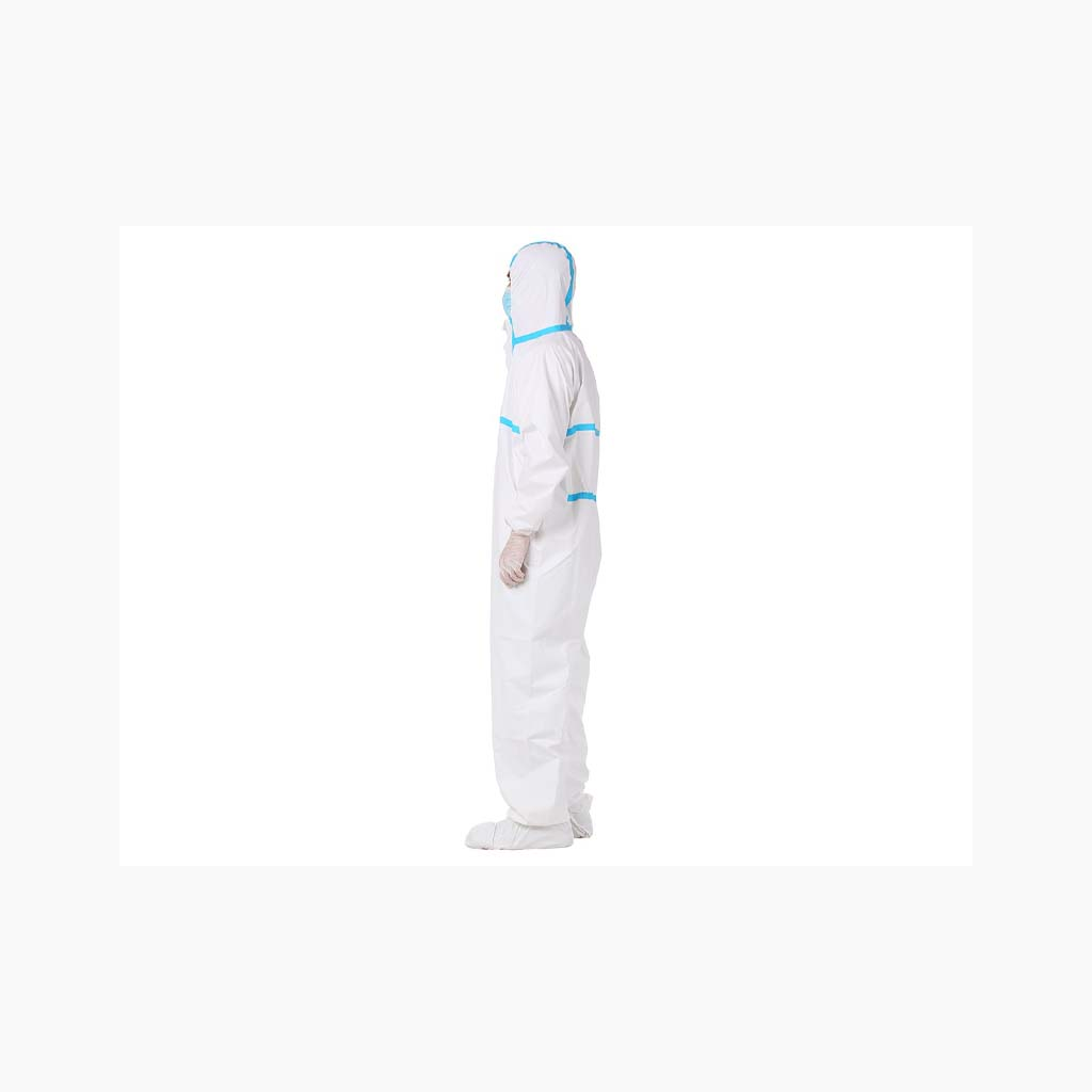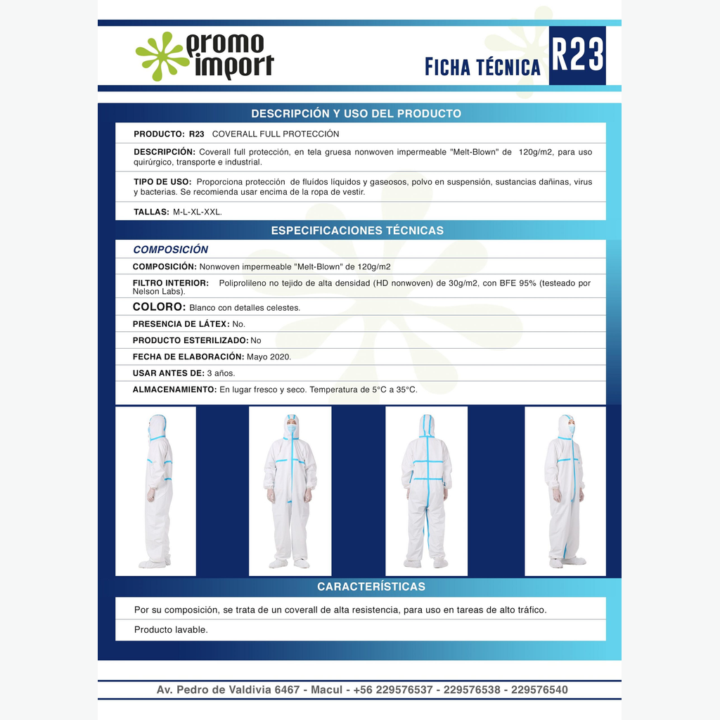 Coverall full protección, en tela gruesa nonwoven impermeable «Melt-Blown» de 120g/m2, para uso quirúrgico, transporte e industrial. Proporciona protección de fluídos líquidos y gaseosos, polvo en suspensión, sustancias dañinas, virus y bacterias. Se recomienda usar encima de la ropa de vestir.
