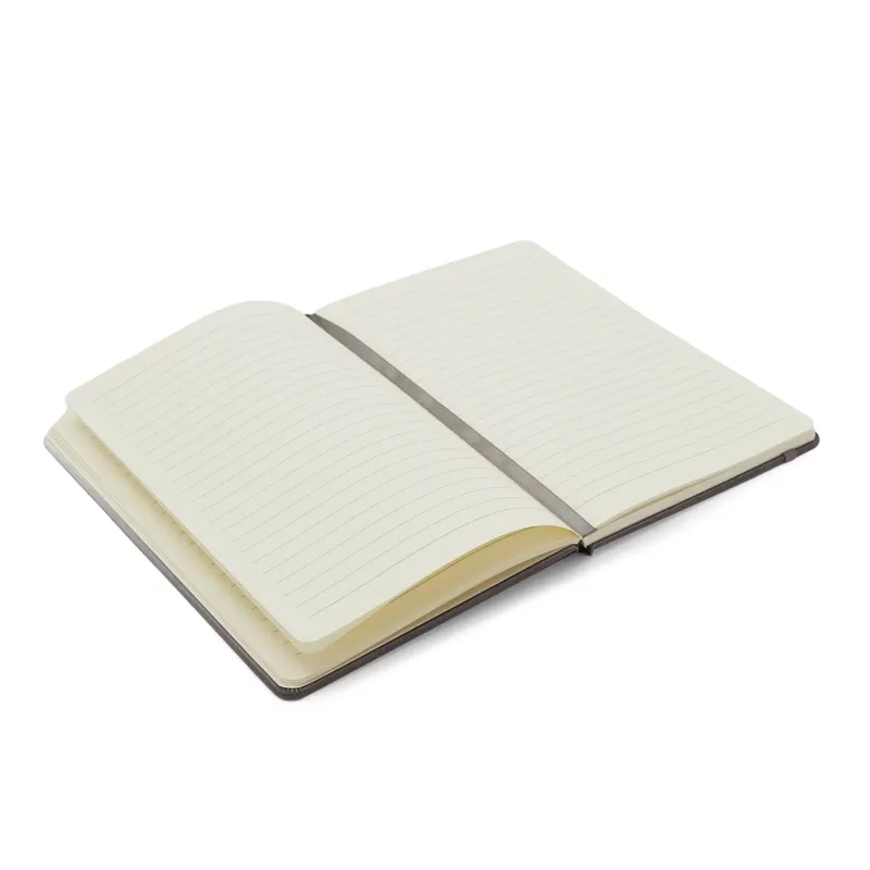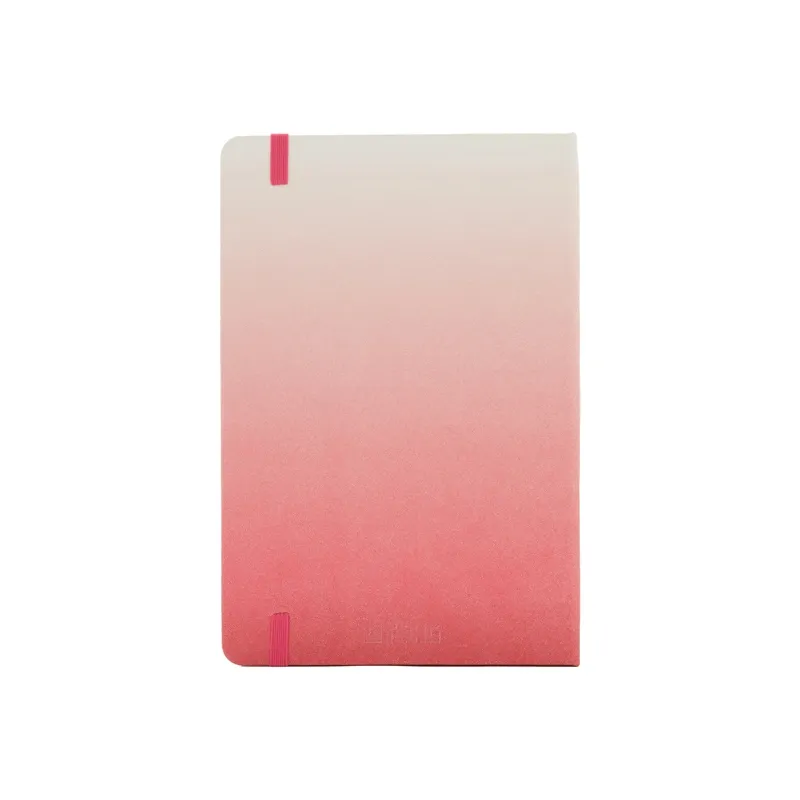 Cuaderno con tapa de efecto de color graduado. Cuenta con 80 hojas rayadas color marfil, de 70 gramos cada una. Posee una cinta separadora de color a tono y elástico para cerrarlo. Dimensiones: 21 x 14 x 1,4 cm (Altura x Longitud x Ancho).