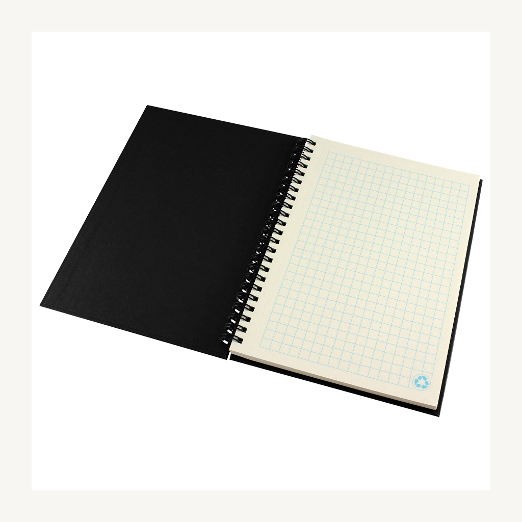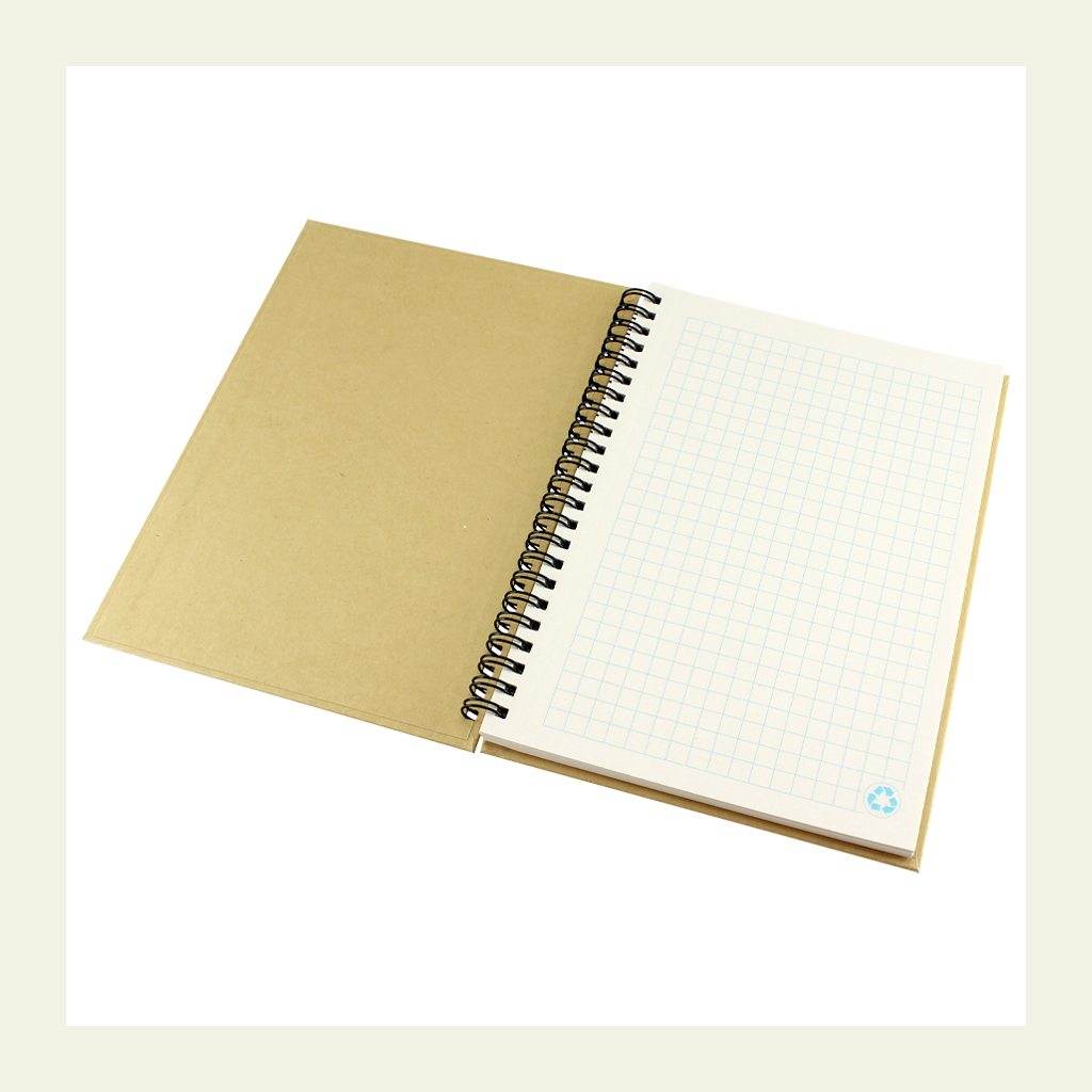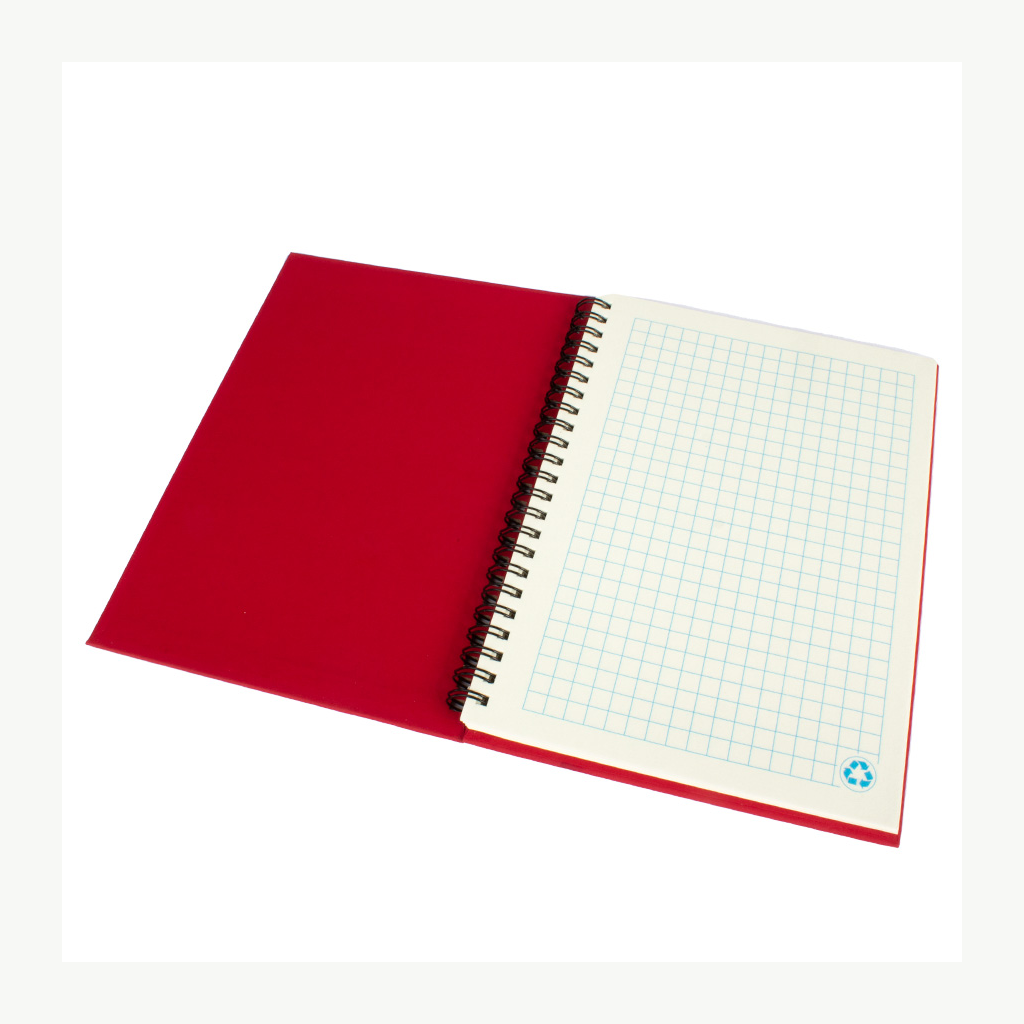 Cuaderno Ecológico con Tapas Duras de Cartón Reciclado 650gsm, 70 hojas interiores cuadriculadas y prepicadas de papel reciclado y anillado metalico doble cero.