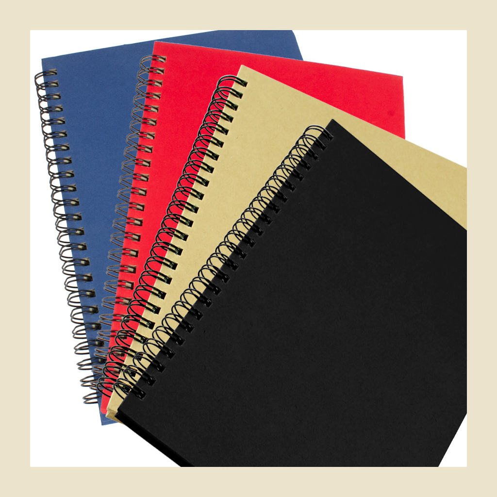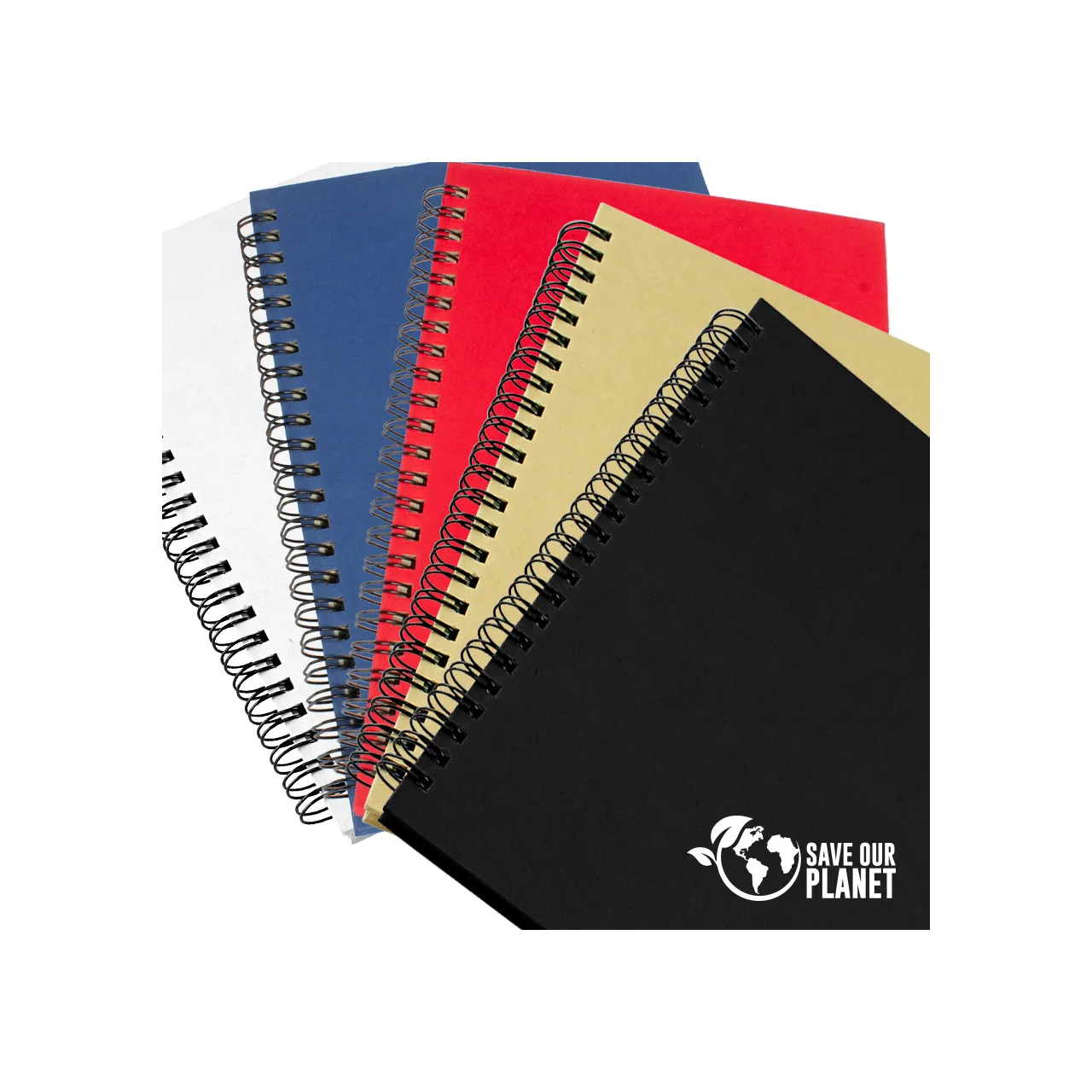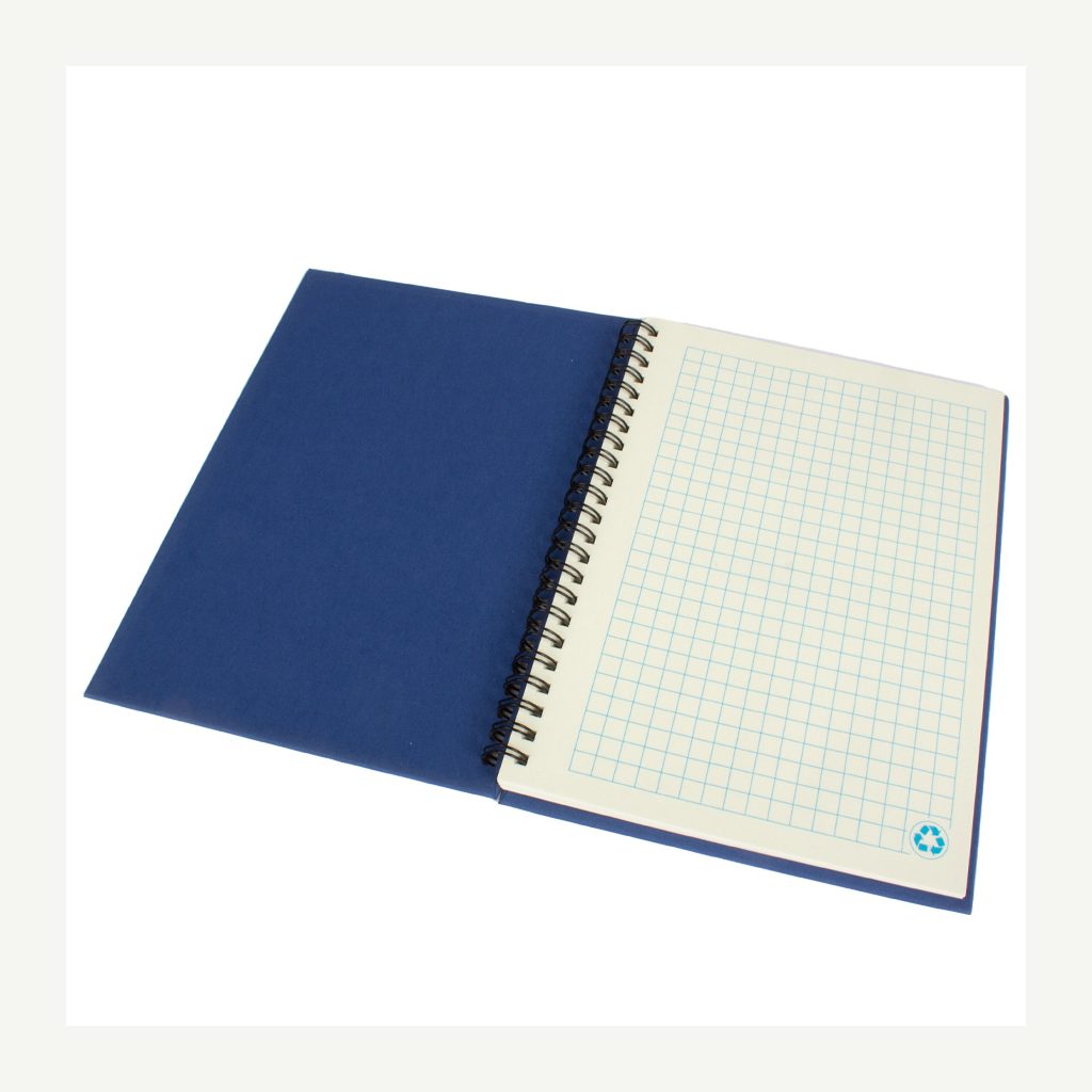 Cuaderno Ecológico con Tapas Duras de Cartón Reciclado 650gsm, 70 hojas interiores cuadriculadas y prepicadas de papel reciclado y anillado metalico doble cero.