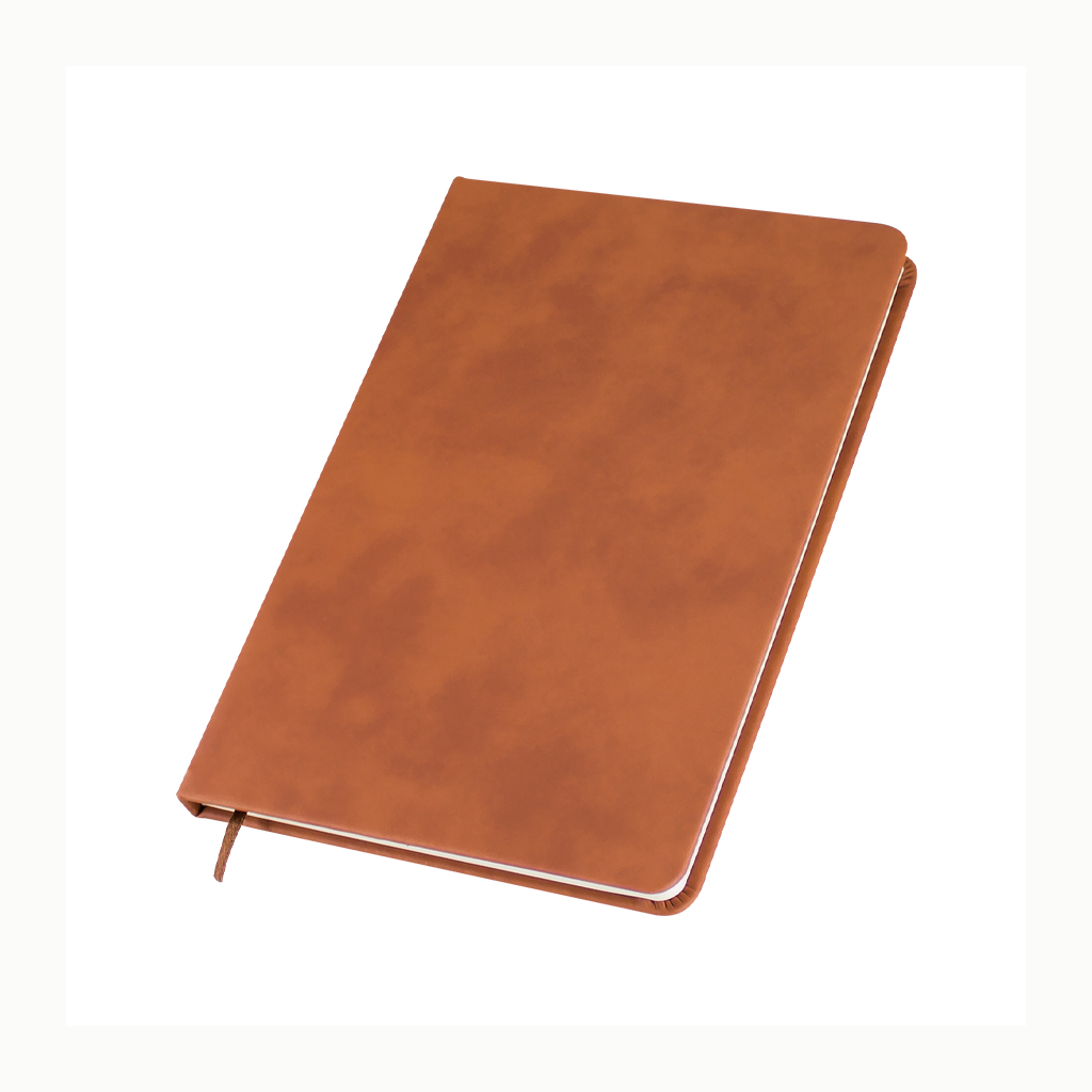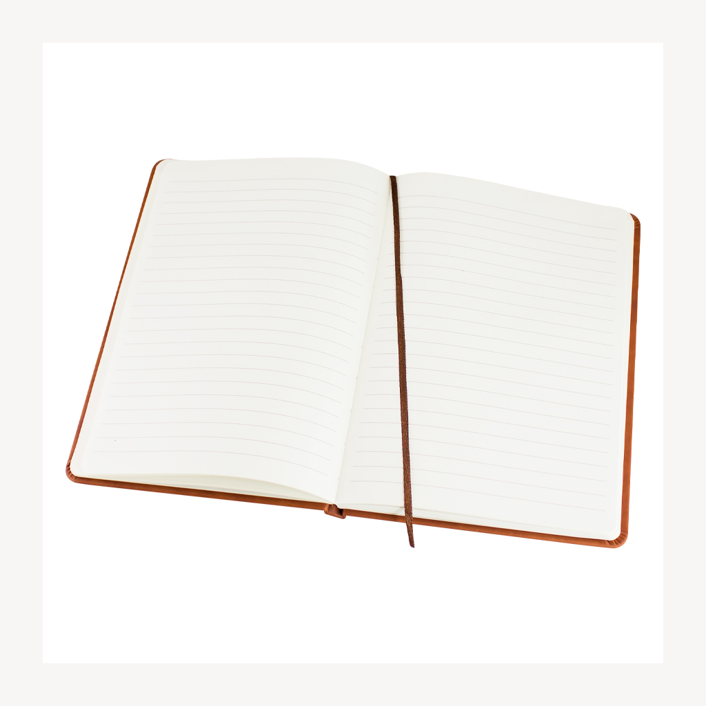 Cuaderno tamaño A5, con cubierta de cartón piedra forrada en PU simil cuero de 3mm de espesor. Interior 80 hojas lineadas amarillas de 80gsm. Incluye banda separador de hojas al tono. Presentación individual en bolsa de polipropileno.