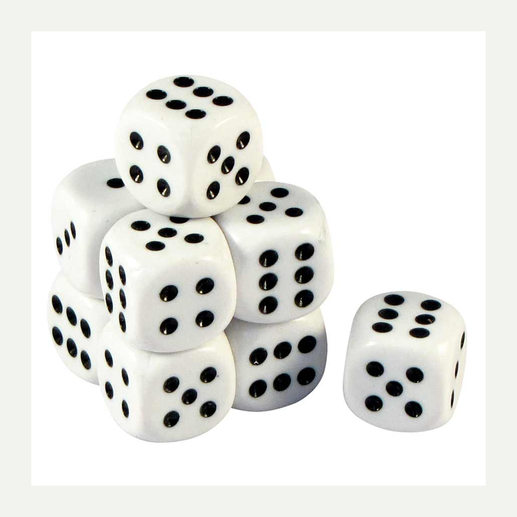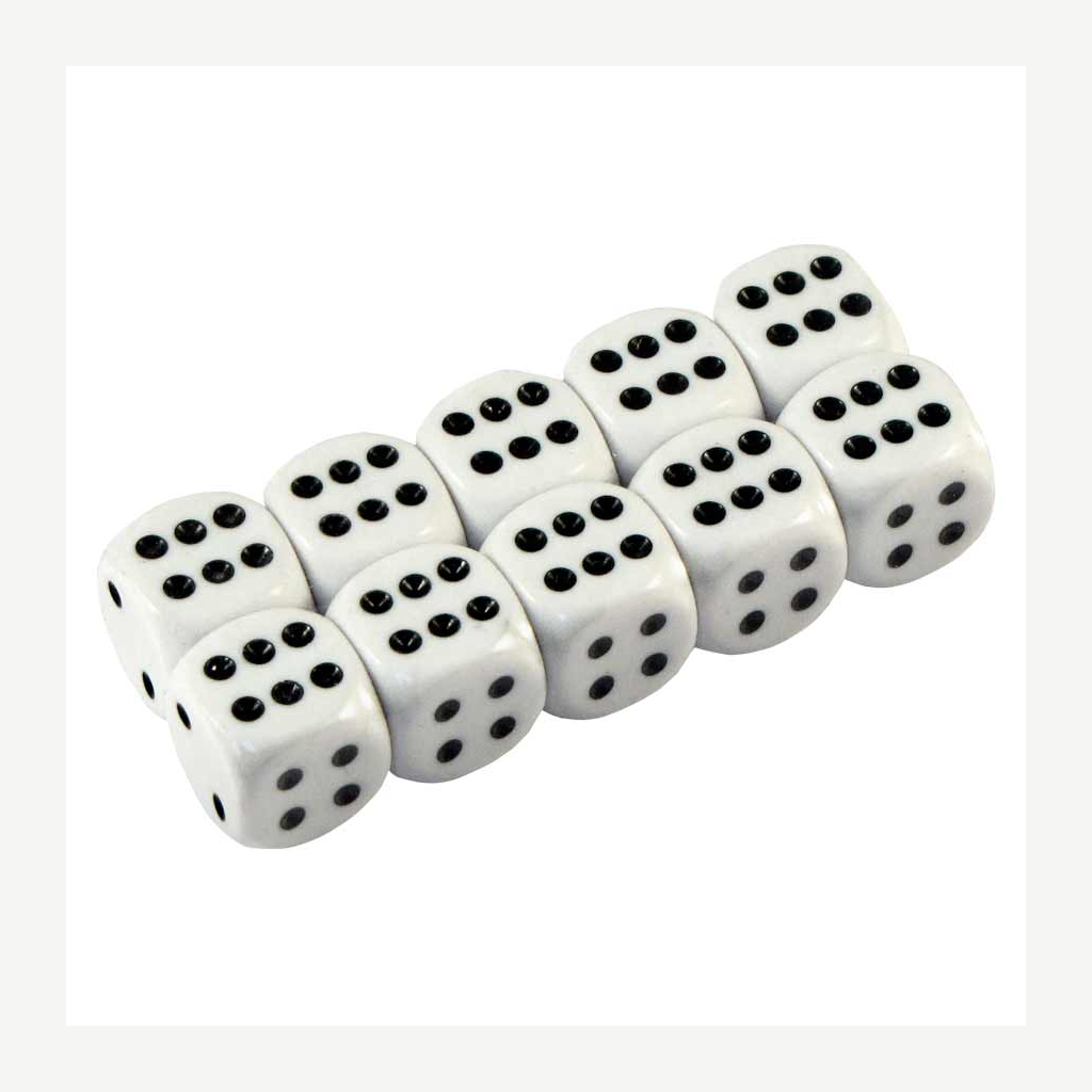 Dado de juego, extra-blanco, con puntos negros. Presentación en paquetes de 10 unidades. El valor publicado es unitario, no por bolsa.