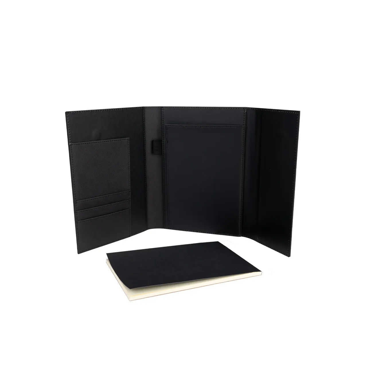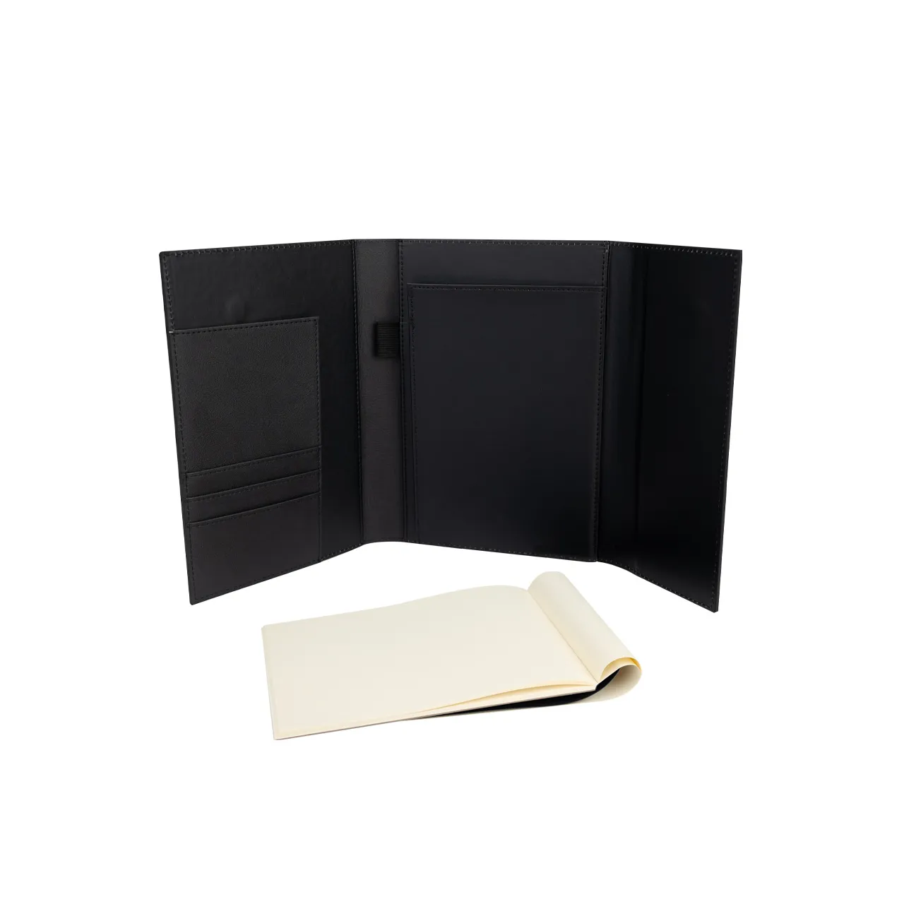 Libreta de Apuntes con 50 hojas lisas amarillas de 13.5 x 20.5 cm., presentada dentro de fina carpeta de PU negro con interior porta-documentos, porta-bolígrafo y cierre imantado, protegida por lámina de tela no tejida color negro. Presentación en elegante caja de cartón piedra esmaltado negro y funda de papel negro. Un gran regalo para nivel ejecutivo.