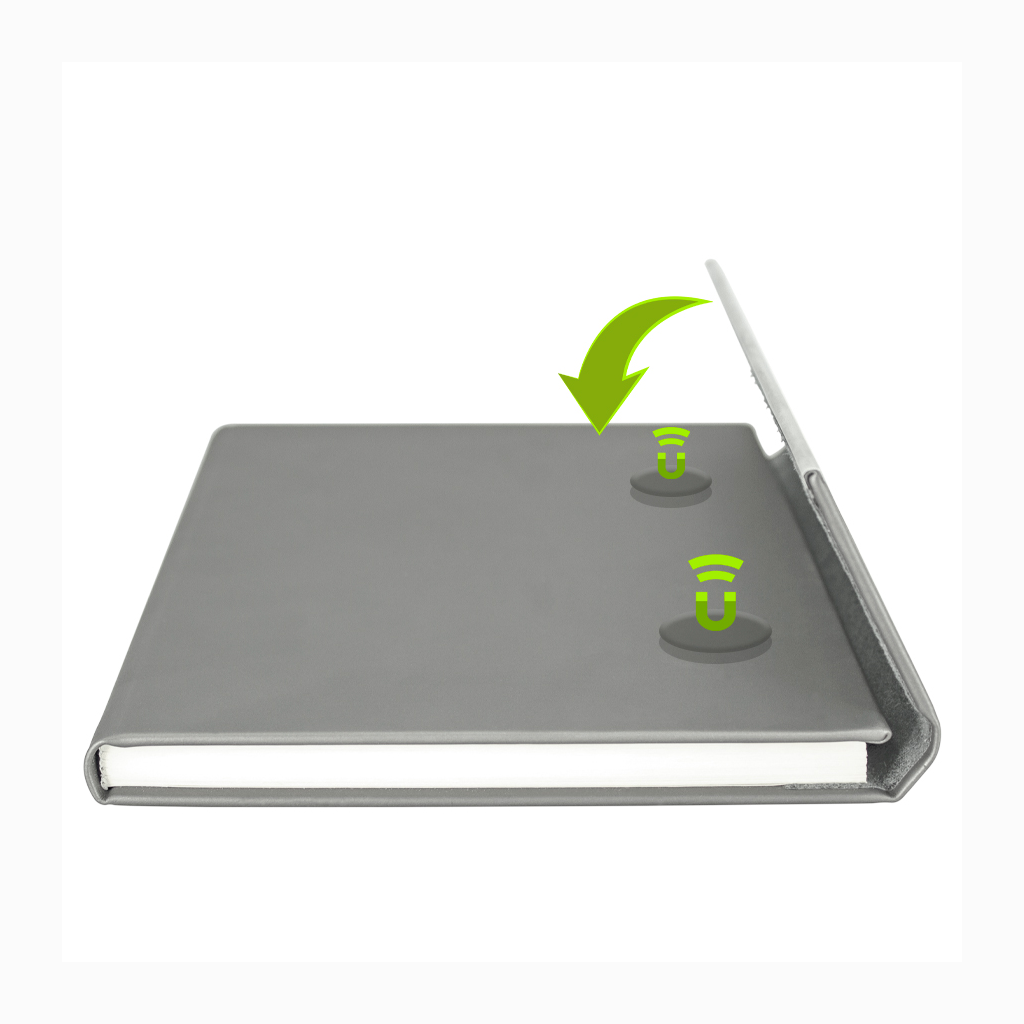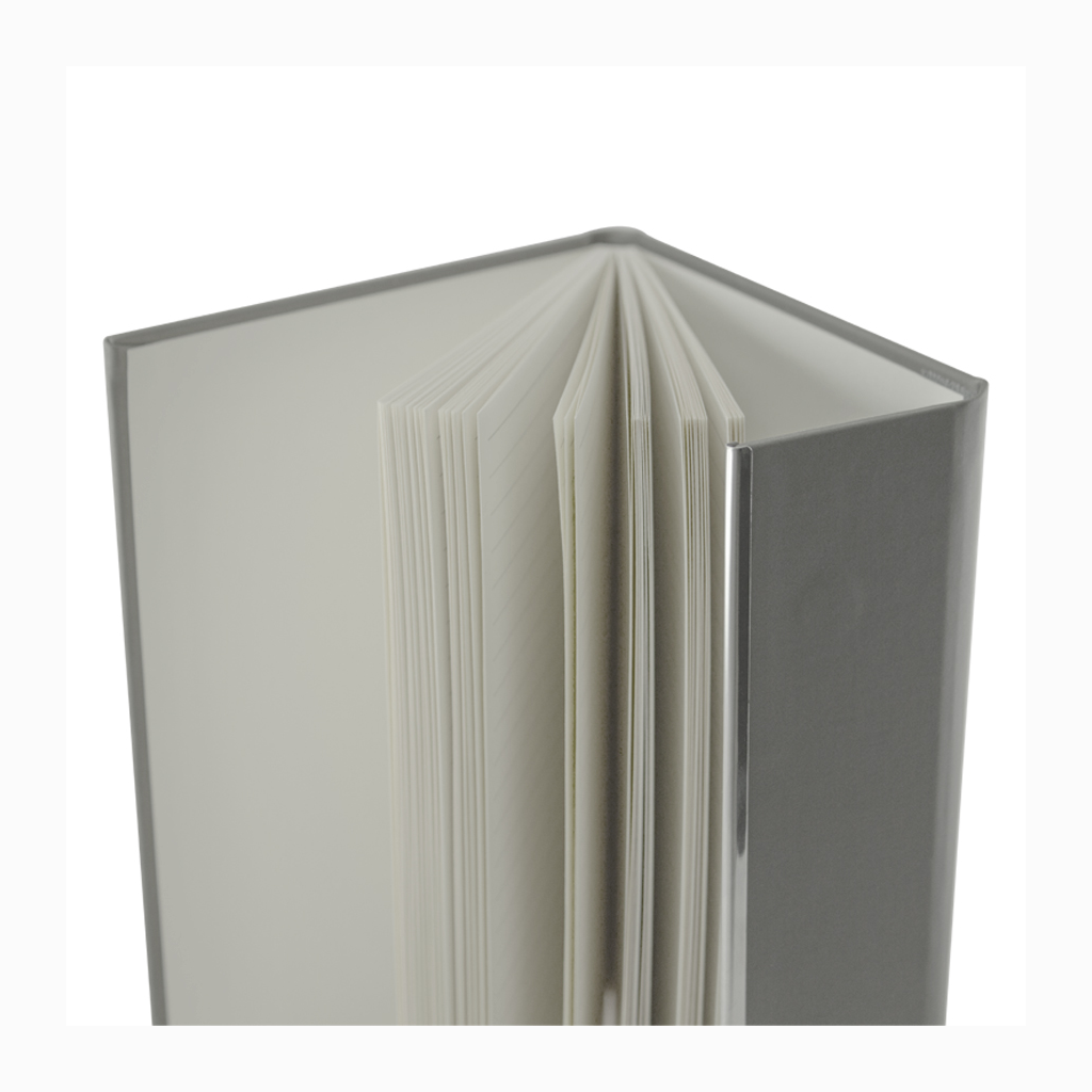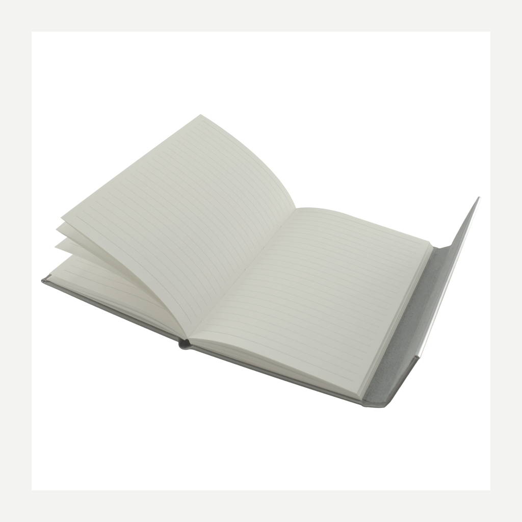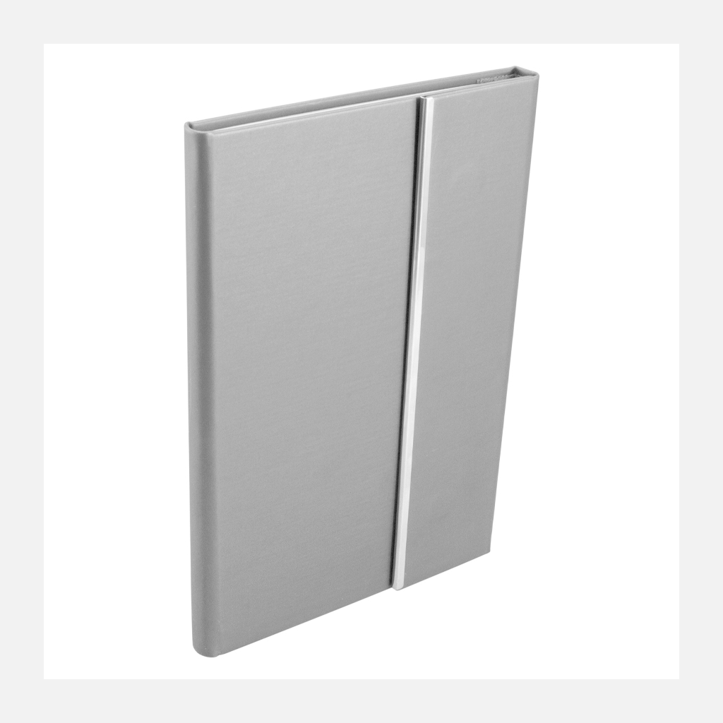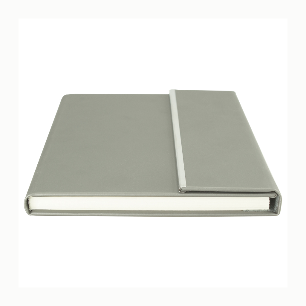 Cuaderno tamaño A5, cubierta de Termo-PU gris, con cierre traslape magnético y banda metálica plateada. Interior 80 hojas lineadas amarillas de 80gsm. Presentación individual en bolsa de polipropileno.