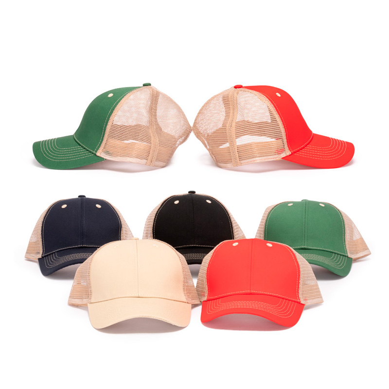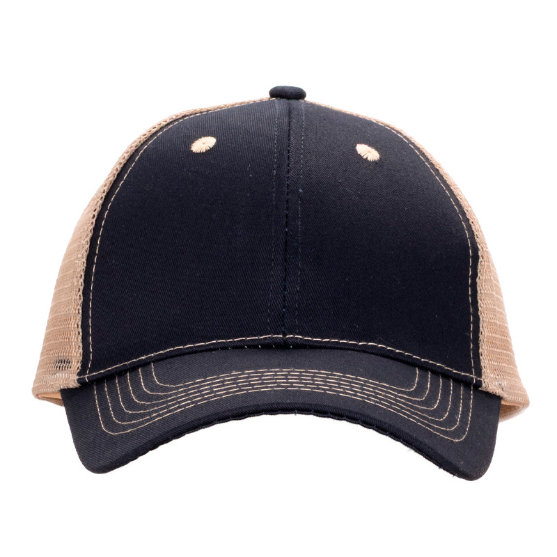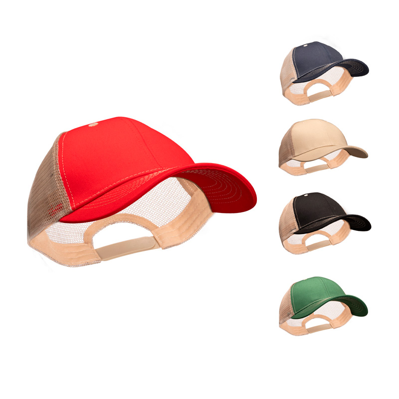 Deluxe Gorro tipo Jockey de poliéster. En la visera, cuenta con 6 costuras concéntricas con hilo beige. En su parte posterior, cuenta con tela tipo malla «Mesh» color beige (khaki), lo que lo hace más fresco y respirable para los calurosos días de verano.