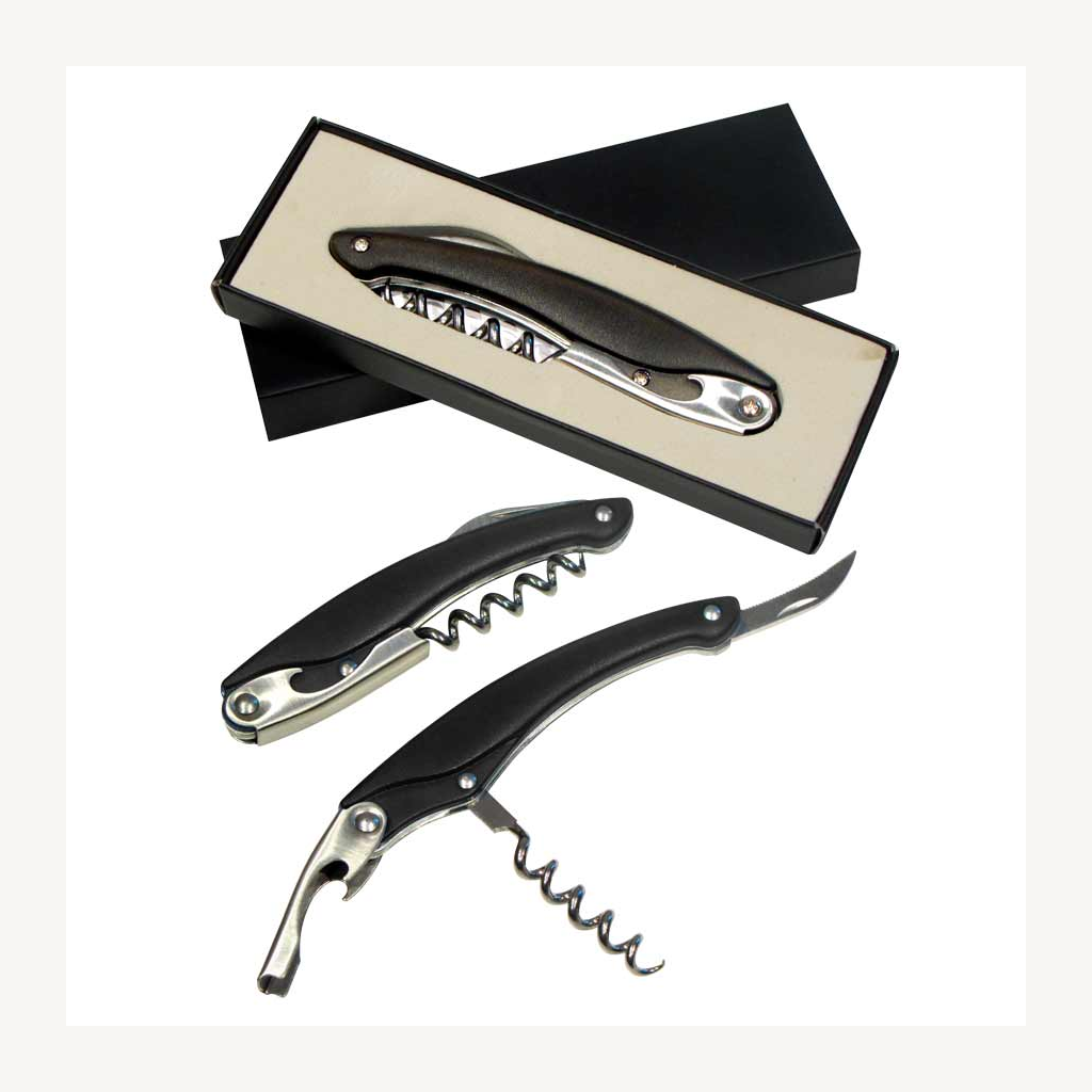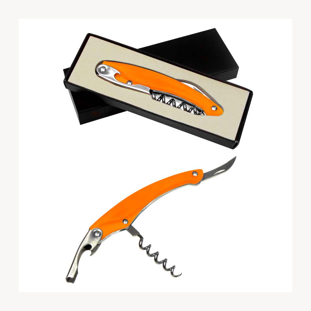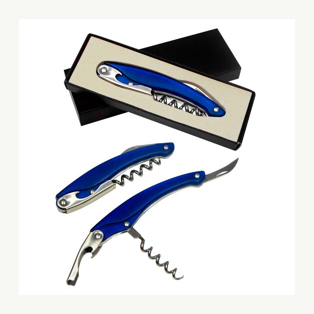 Descorchador – destapador – abresellos de Acero Inoxidable con Mango Ergonómico color Frozen. Presentación en caja negra laminada opaca.