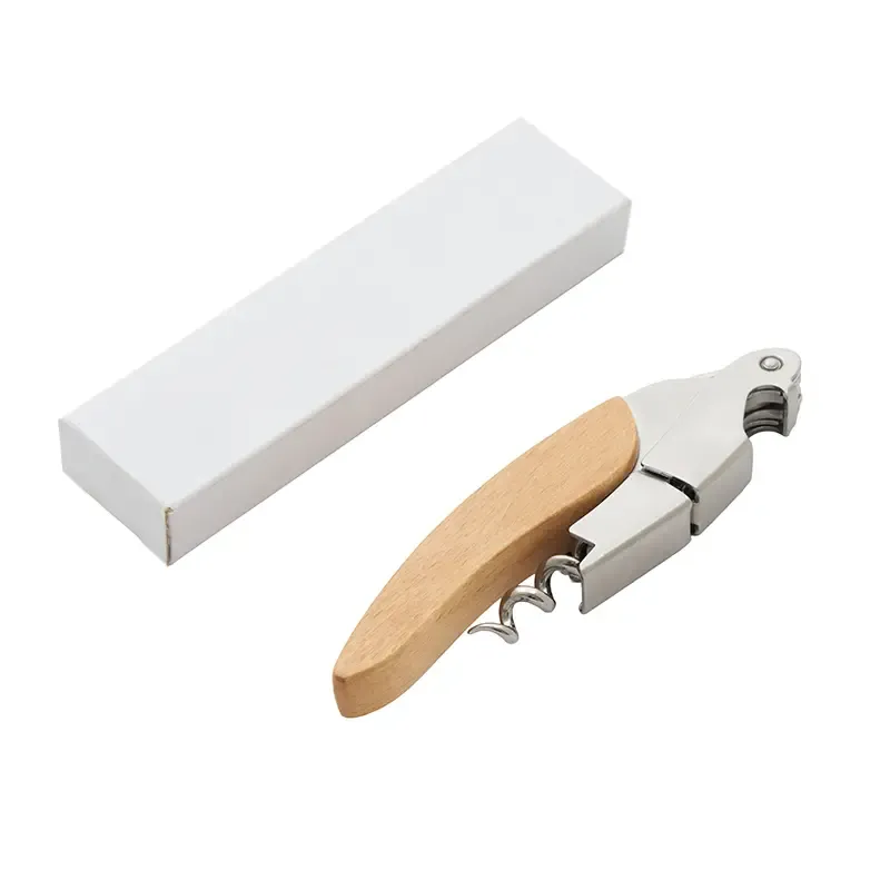 Destapador multiple con mango de madera. Fabricado en madera natural y acero inoxidable 420. Cuenta con sacacorchos de doble palanca, cuchilla retráctil y mango ergonómico de madera. Es ideal para abrir botellas de vino con facilidad, para uso en el hogar o en servicio profesional.
