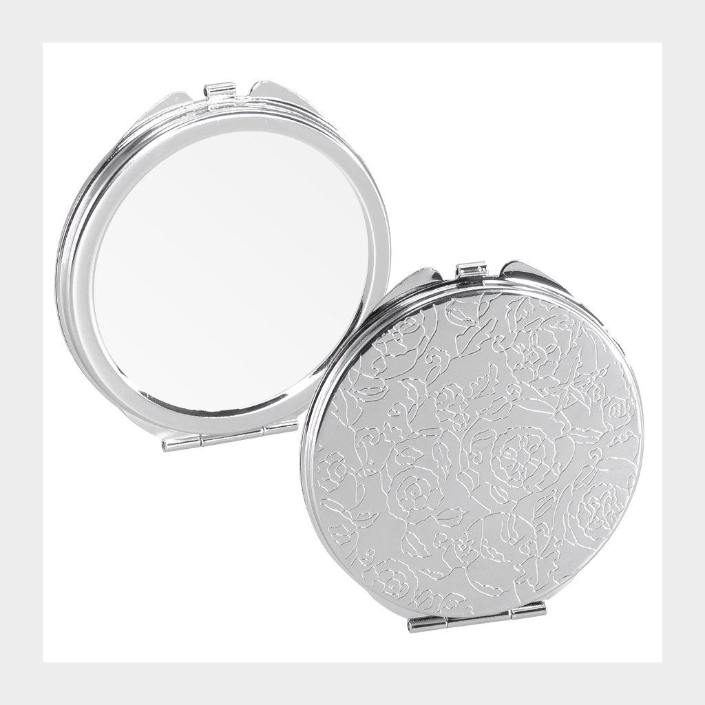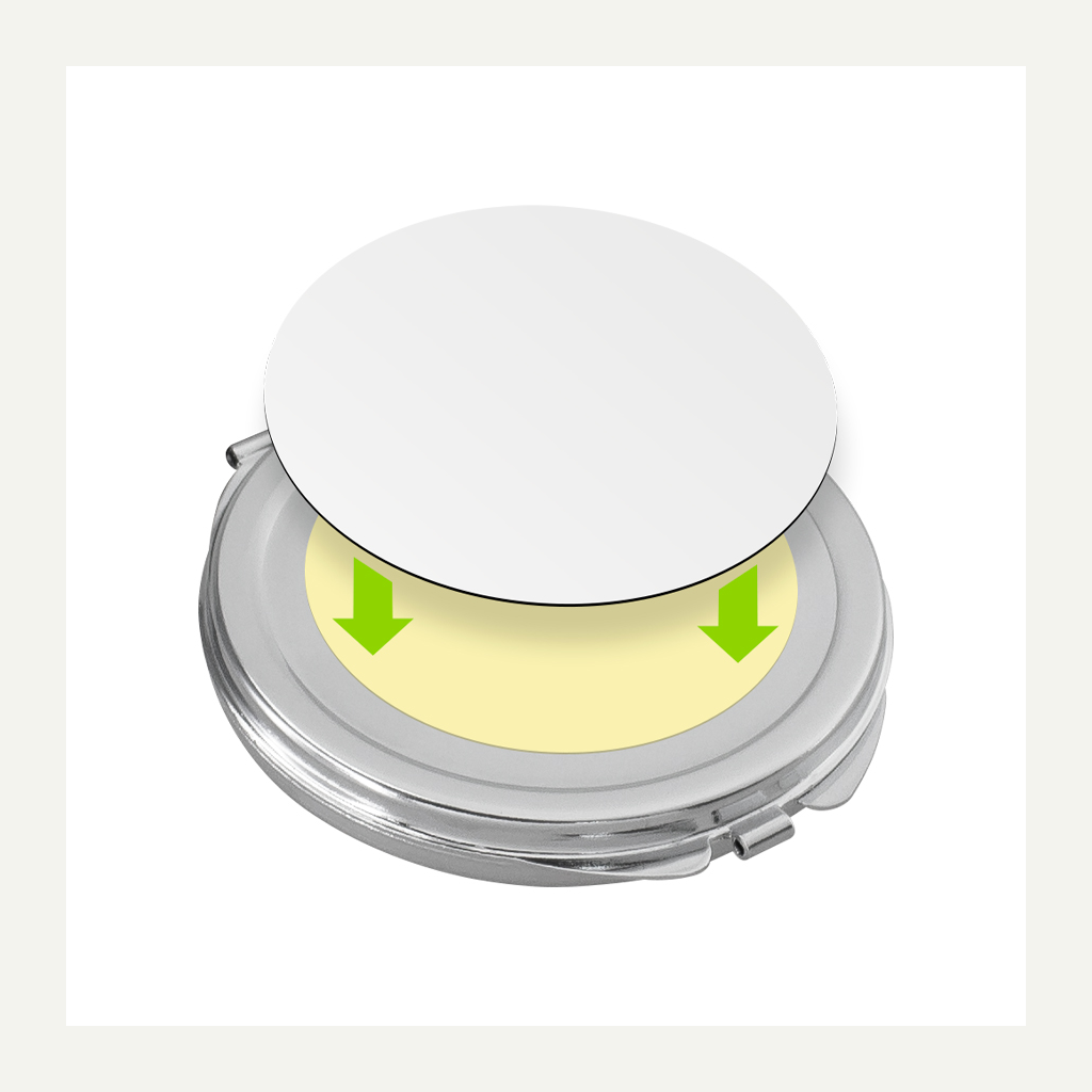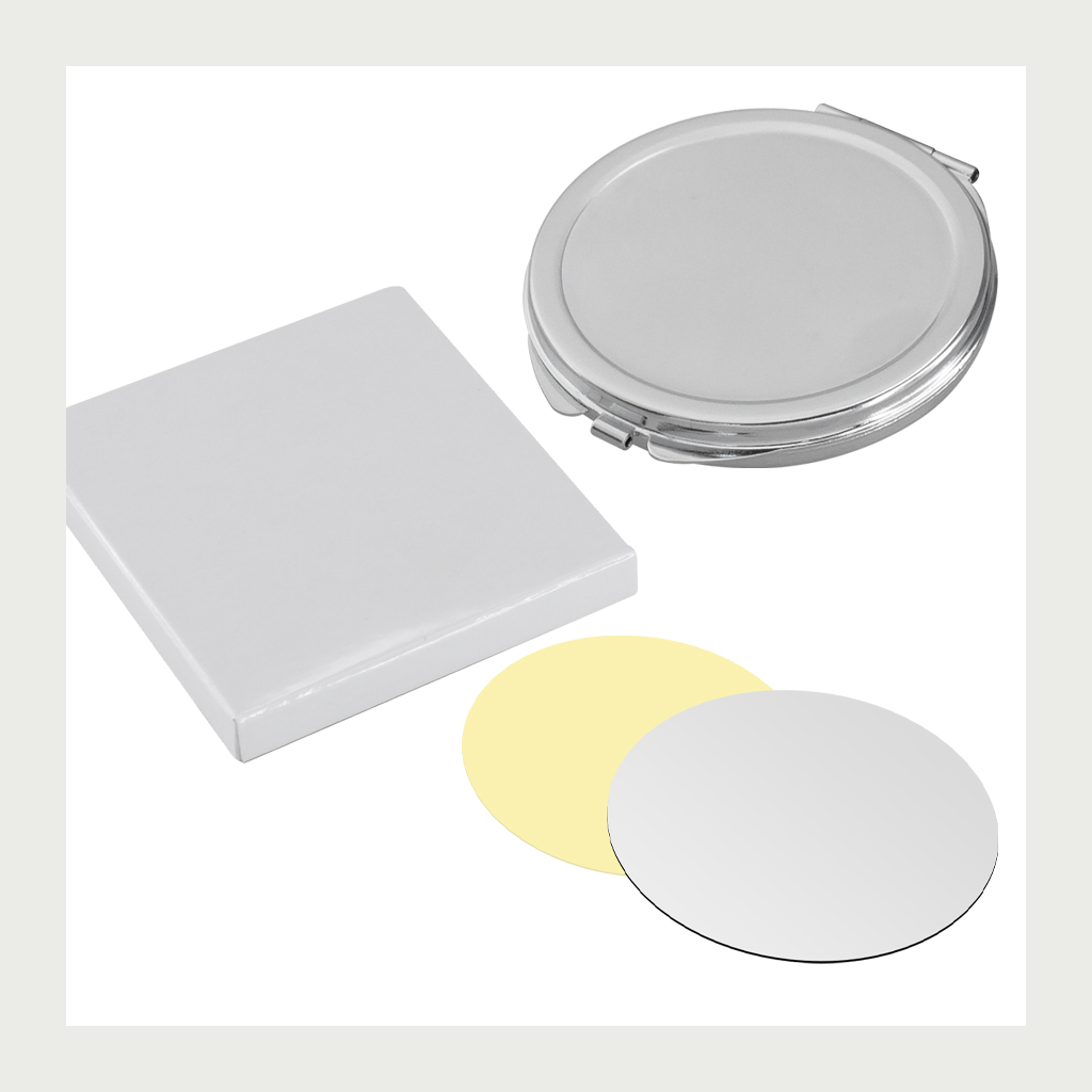 Espejo metálico redondo doble, con tapa, con círculo para Sublimación. Presentación en caja laminada blanca.