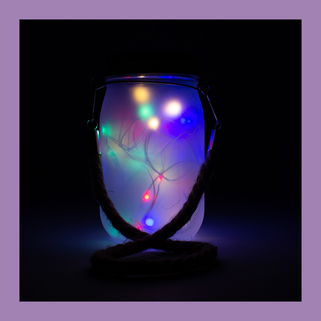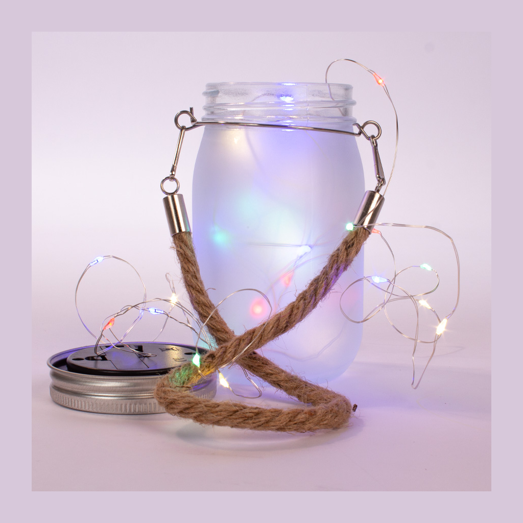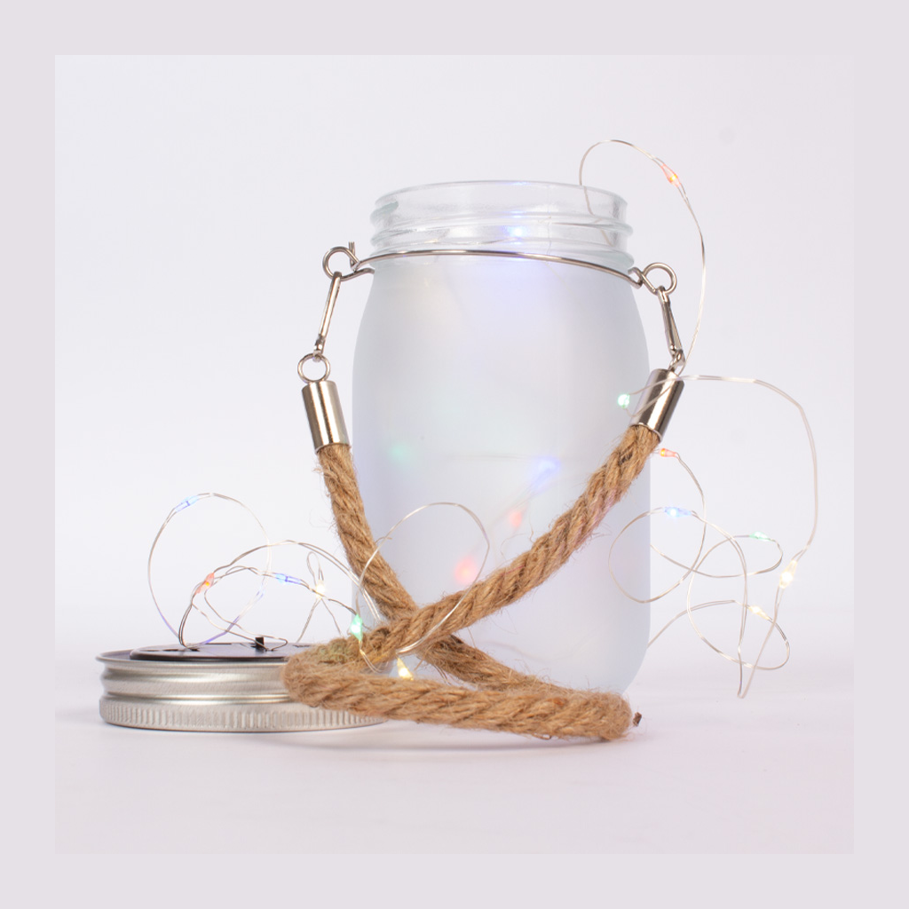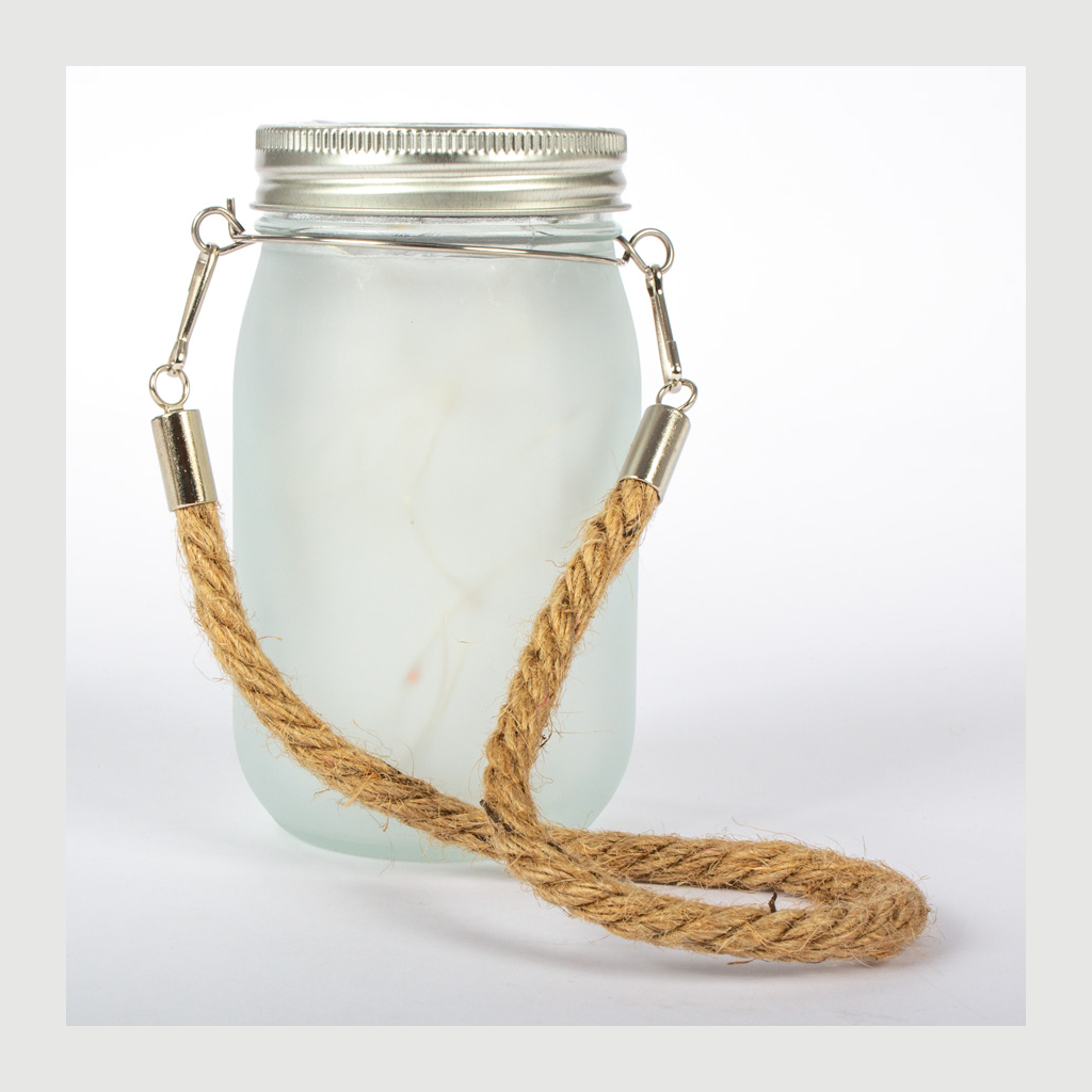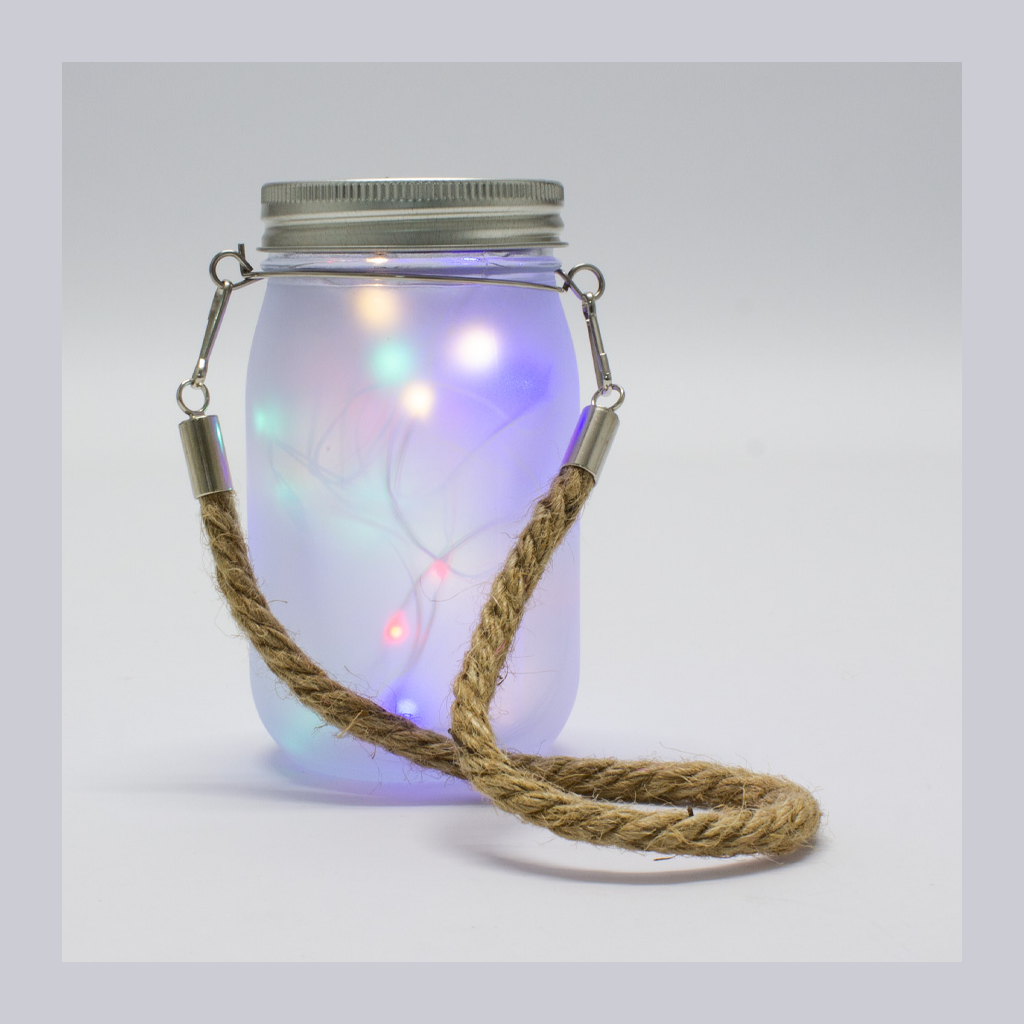 Farol para colgar, con forma de frasco y con tapa. Incluye cable con luces LED en el interior, que cambian de color. Sobre la tapa, contiene panel fotosensor, que permite que las luces LED se enciendan automáticamente cuando baja la luz-día. Las luces permanecerán encendidas por un lapso de 3 horas aproximadamente. IMPORTANTE: el panel fotosensor NO ES PANEL DE CARGA SOLAR, es decir, la carga de las luces LED viene dada por una pila AAA común (no incluída) y la función del panel fotosensor es encender las luces una vez que detecta una baja importante en la luz de día.