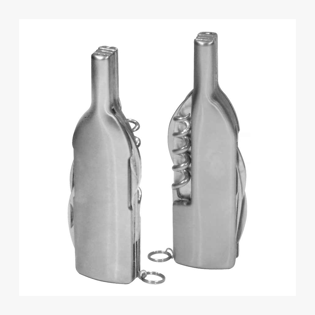 Herramienta para vinos multifunción de acero inoxidable con forma de botella Incluye descorchador, destapador, lupa, cuchillo, abresellos y argolla.