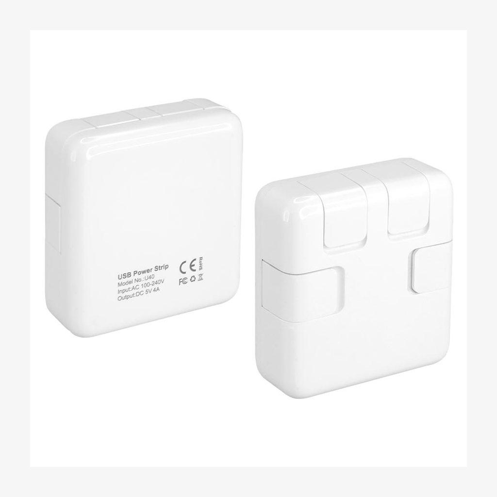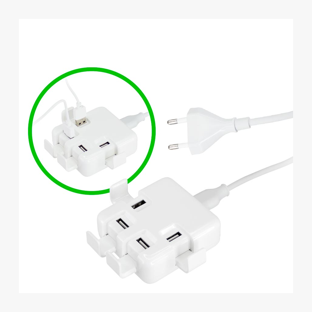 Hub USB 2.0, 4 puertos modelo «Power Strip», en plástico ABS blanco, con amplio espacio para logo. Incluye cable para enchufe de 1.5m de largo. Input AC 100V-240V / USB output: DC 5V 4A. Presentación en estuche de cartón blanco.