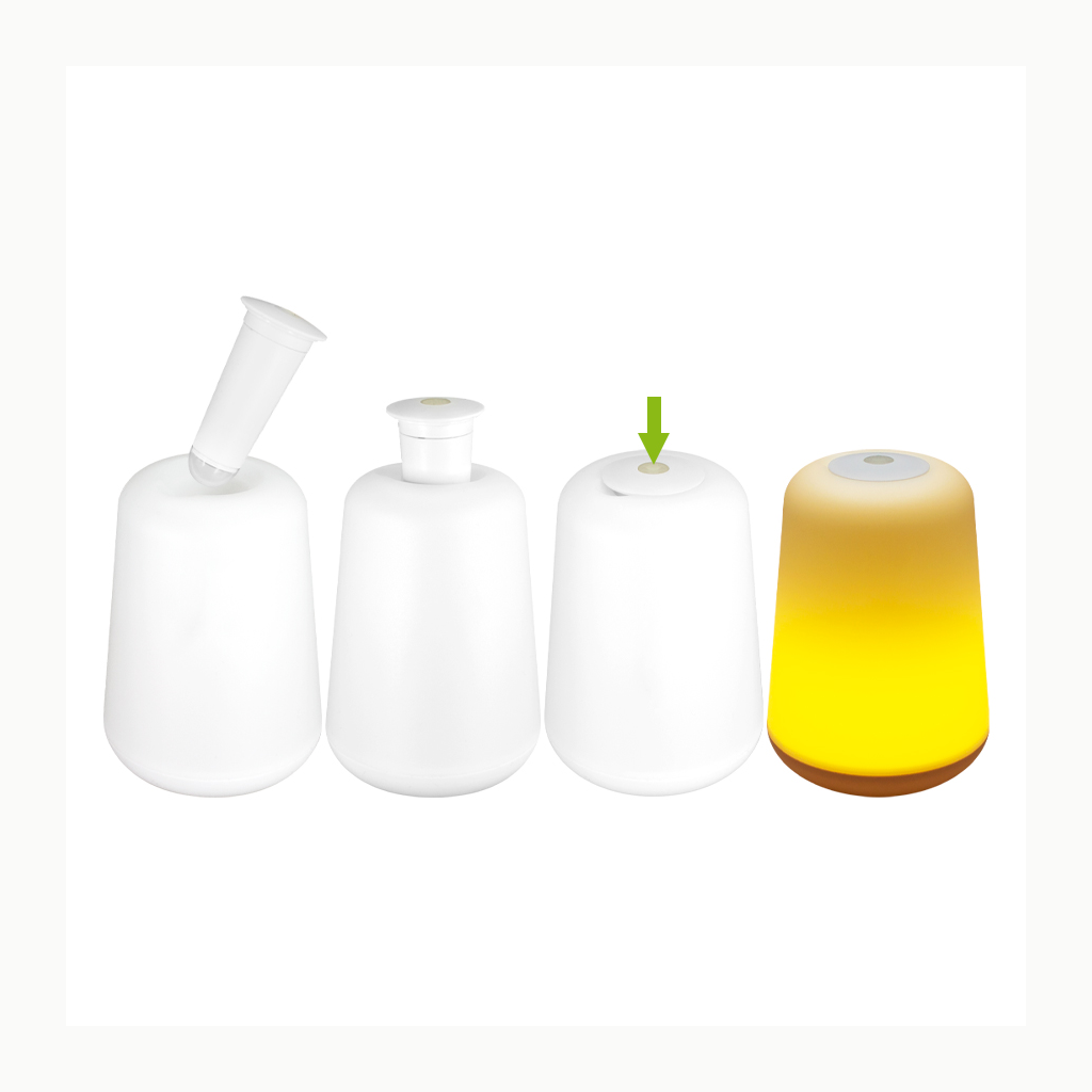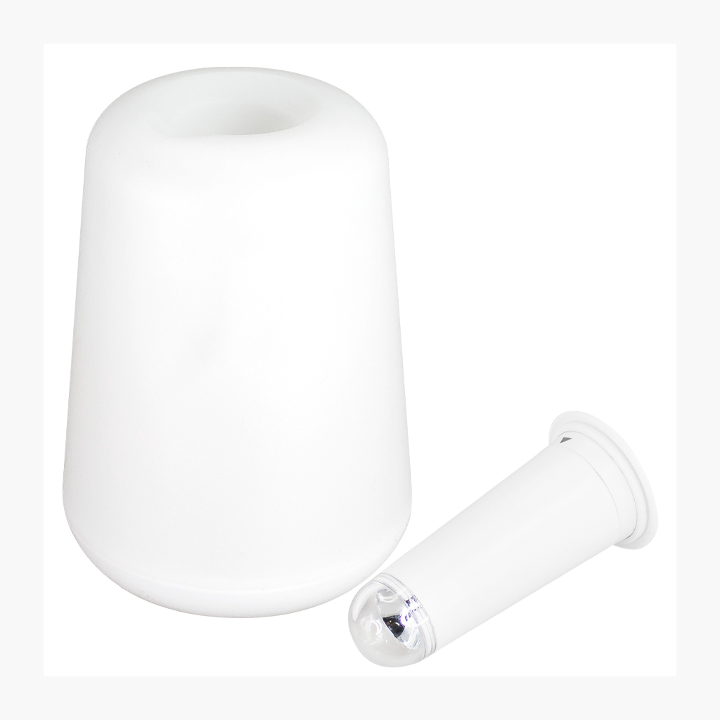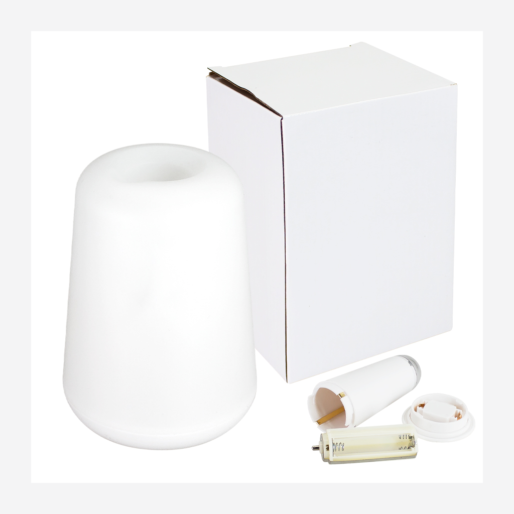 Lámpara de sobremesa de luz cálida amarilla, con luz LED removible. Usa 3 pilas AAA (no incluidas). Gran superficie de impresión. Presentación en caja de regalo de cartón blanco.