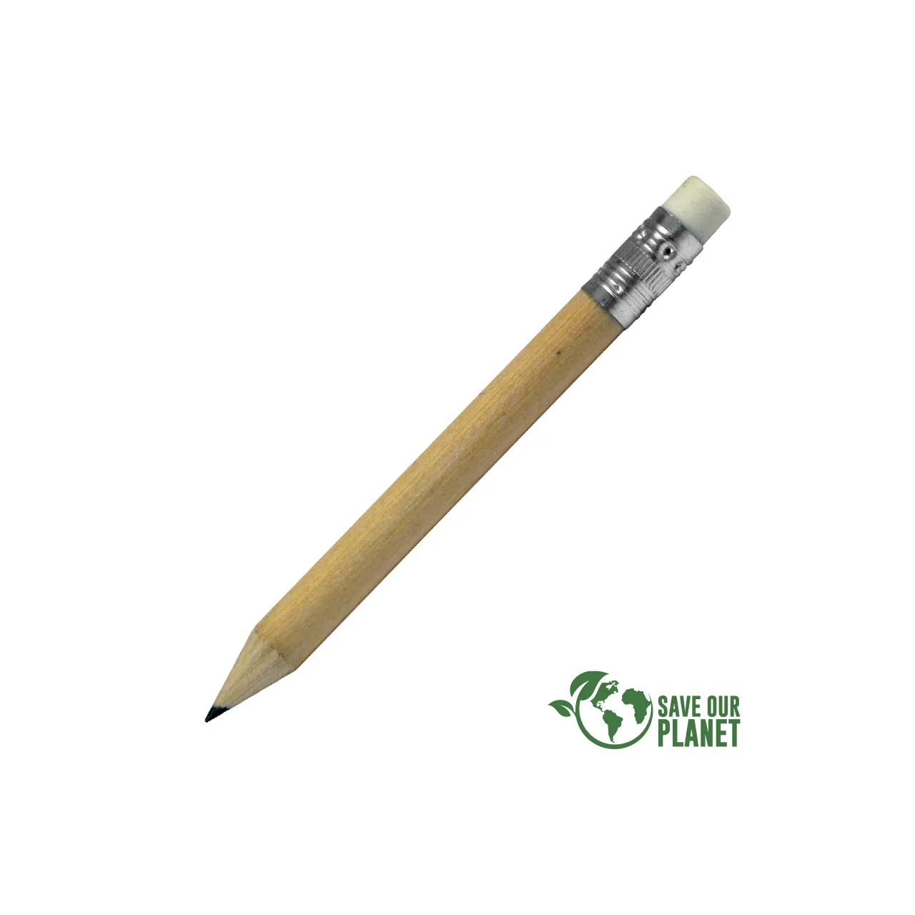 Lápiz grafito corto de madera barnizada. Cuerpo 100% cilíndrico, ideal para imprimir logos sin problemas. Incluye goma de borrar y viene con punta lista.
