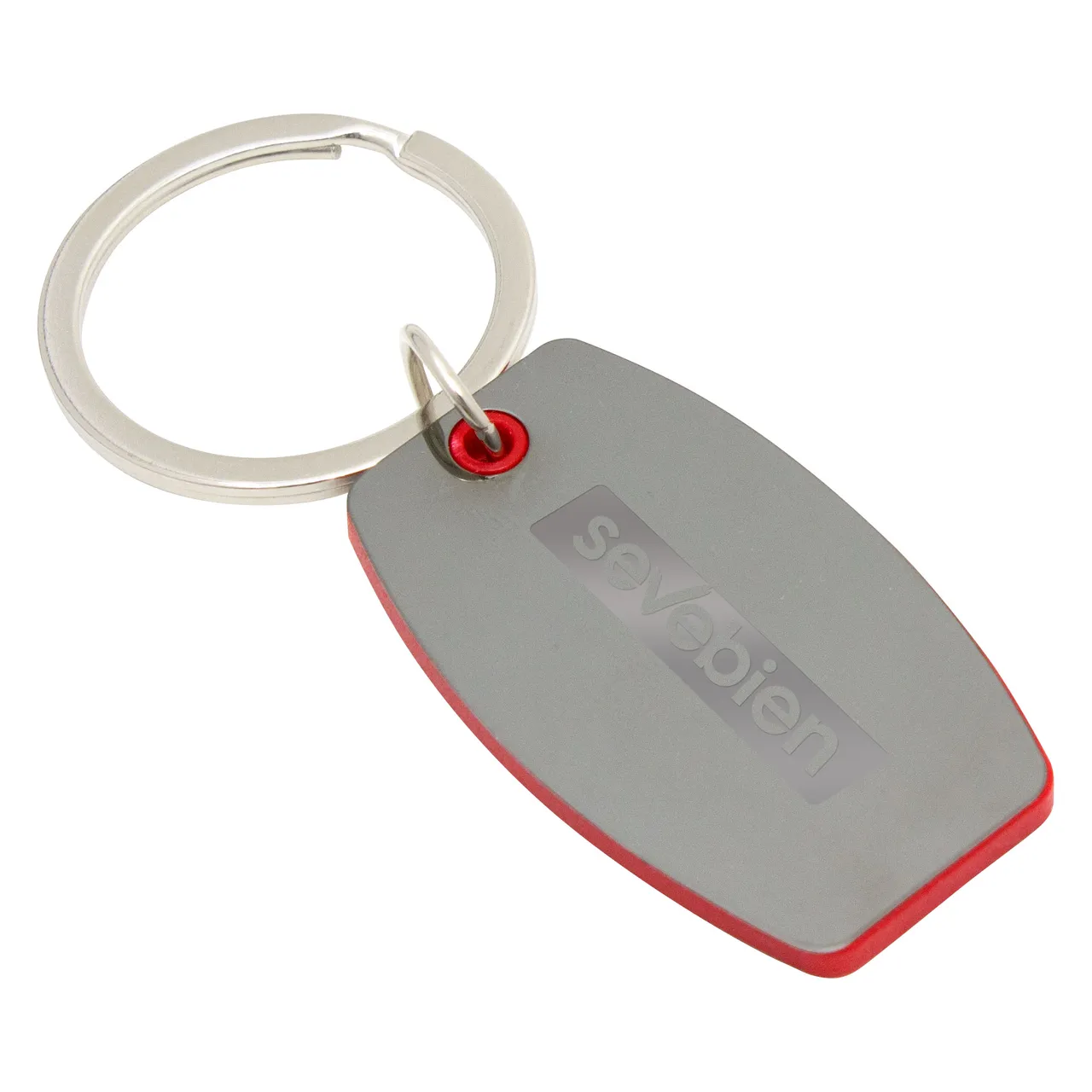 Refleja distinciónLlavero con forma ovalada. Estructura plástica de color con apliques de acero color gris gun de cada lado. Acabado brillante.Medidas: 5 x 3 x 0,35 cm. LLavero de Ø 3,5 cm x 0,2 cm.