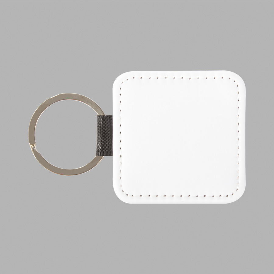 Llavero cuadrado de PU blanco para sublimación. Reverso capa PU negro con brillo (no sublimable). Argolla de Acero inoxidable.