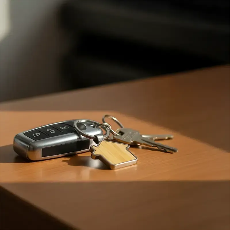 Llavero metálico con silueta de casa y bambú. Fabricado en aleación de zinc y bambú en tono natural. Cuenta con anilla resistente y diseño de casa ideal para branding. Es ideal para inmobiliarias, constructoras, promociones y obsequios corporativos.
