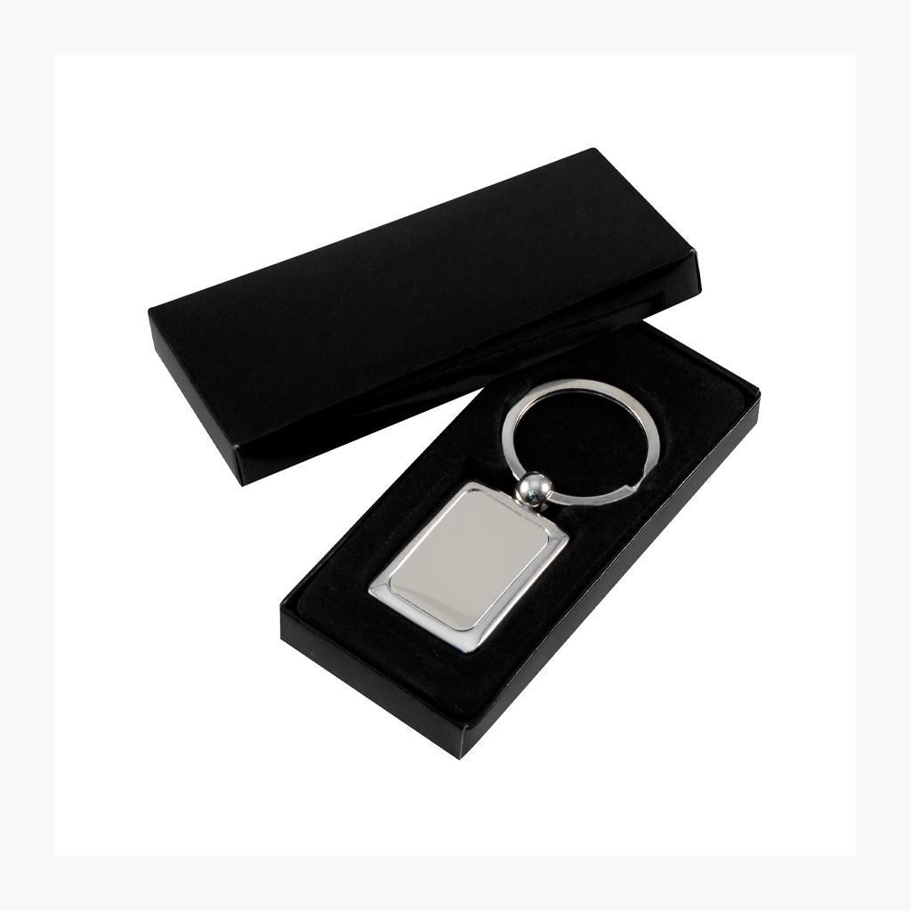 Llavero Metálico Cuadrado. Presentación en estuche laminado negro con cuna aterciopelada.