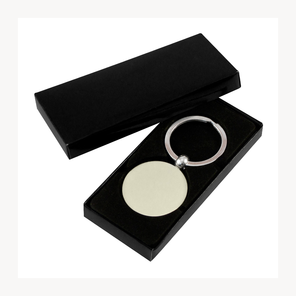 Llavero Metálico Redondo Plano. Presentación en estuche laminado negro con cuna aterciopelada.