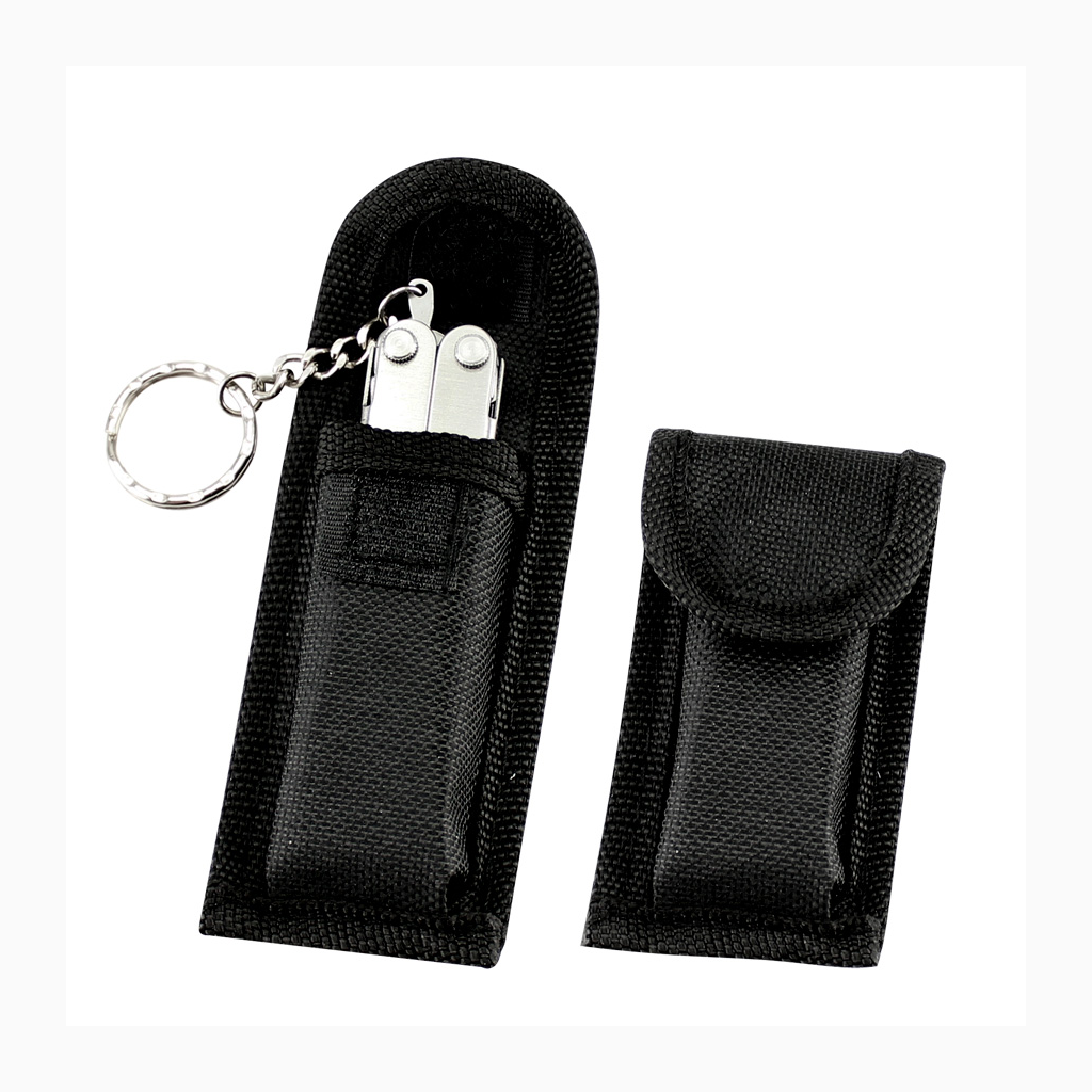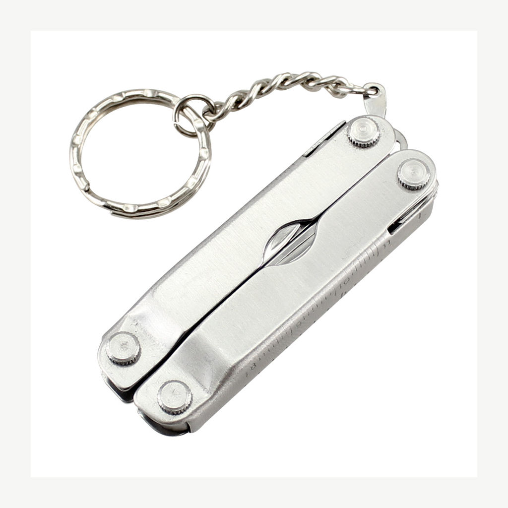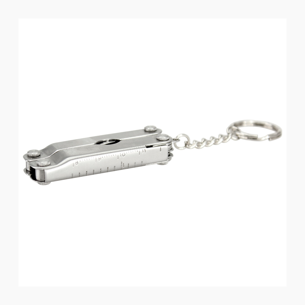 Multiherramienta metálica plegable de 10 funciones, con llavero. Incluye mini-regla en cm y pulgadas. Presentación en estuche de polyester negro y caja plateada de regalo.